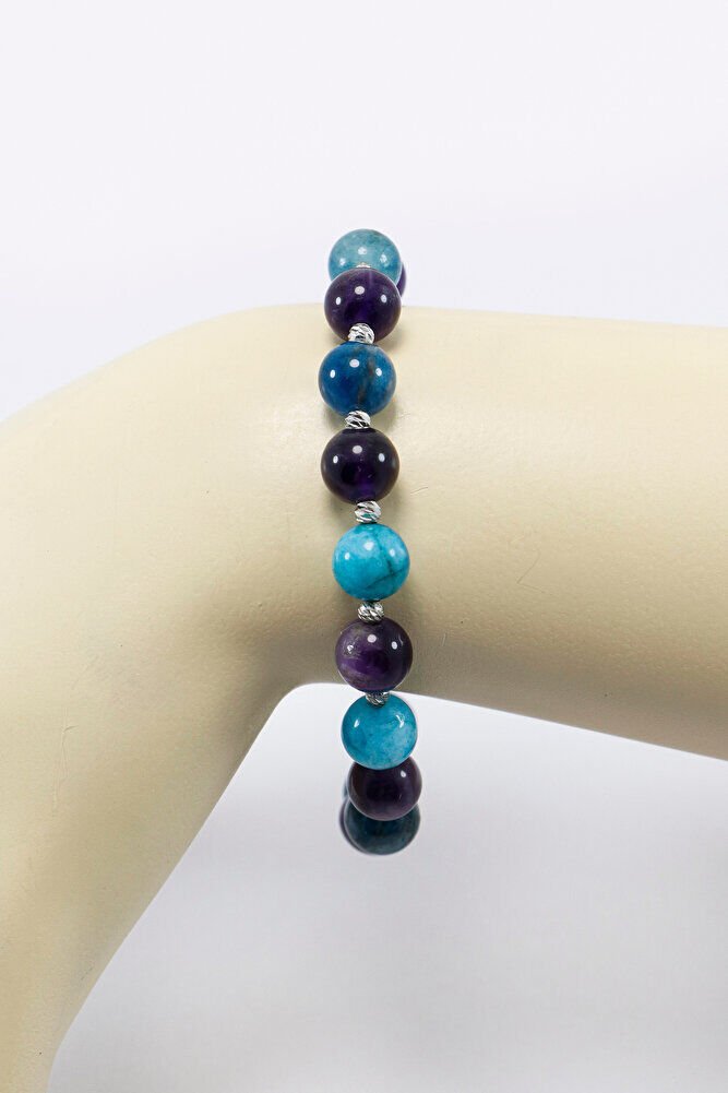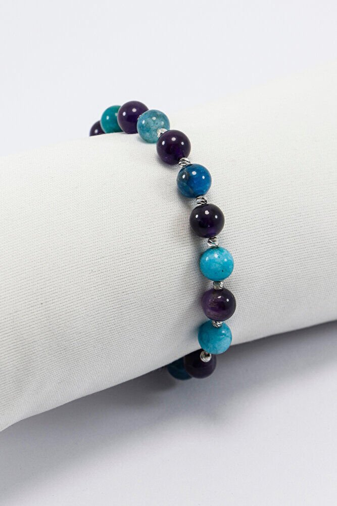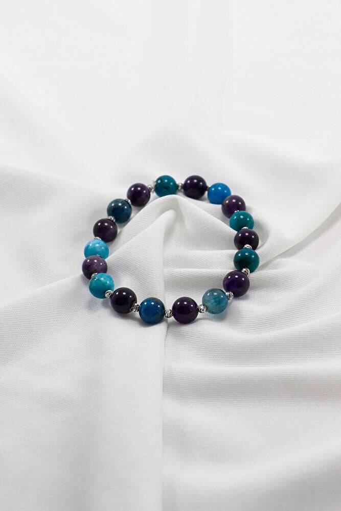 Apatit ve ametist doğal taşları kullanılarak hazırlanan bu bileklik, renk uyumu ve sade tasarımıyla günlük kullanıma uygun, zarif bir aksesuardır. Doğal taşların kendine özgü dokusu sayesinde her bileklik benzersiz bir karakter taşır.