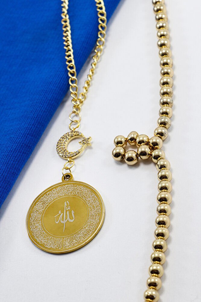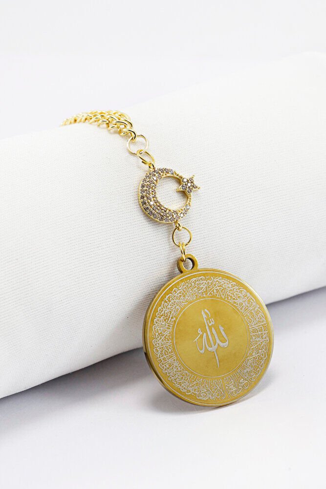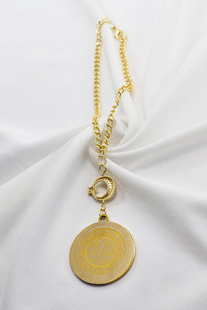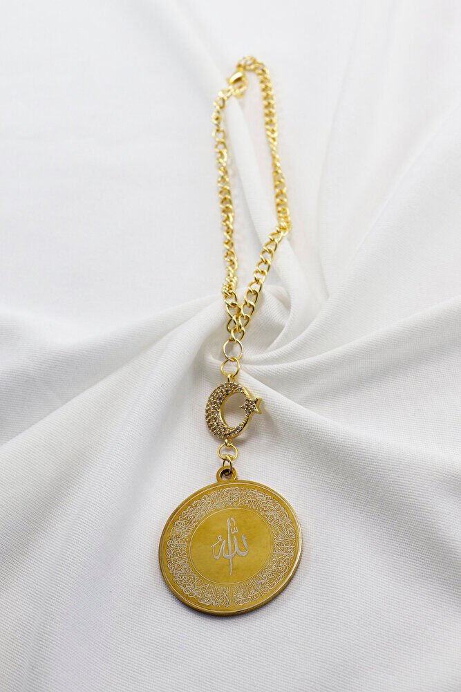 Dualar lazer kazıma tekniği ile kalıcı bir şekilde kazınmaktadır.; Zirkon ay yıldız tek taraflıdır.; Zincir ayarlanabilir metaldir.; ; Plaka gold renkli 316l paslanmaz çeliktir.; Çelik plaka 3,5 cm ölçülerindedir.; Plaka çift taraflıdır.; Bir yüzünde Ayetel Kürsi diğer yüzünde ise Nazar ayetleri bulunmaktadır.; Ayetel Kürsi, Bakara Suresi'nin 255. ayetidir ve İslam inancında çok önemli bir yere sahiptir.; Bu ayet, Allah’ın kudretini, egemenliğini ve her şeyi bilen, her şeyin sahibi olan Yüce Varlık olduğunu vurgular.; Ayet, Allah'ın her şeyin üzerinde olduğunu, hiçbir gücün O’nun izni olmadan hareket edemeyeceğini belirtir.; İnanılır kabul edilen bir başka önemli husus da, bu ayetin kişiyi kötülüklerden koruyacağına, huzur ve güven vereceğine inanılmasıdır.; Müslümanlar, Ayetel Kürsi'yi sıkça okur ve çeşitli durumlarda korunma, dua ve huzur arayışı için kullanırlar.; Bu nedenle, hem manevi hem de koruyucu bir anlam taşır.; Anlamlı ve estetik bir hediyedir.;