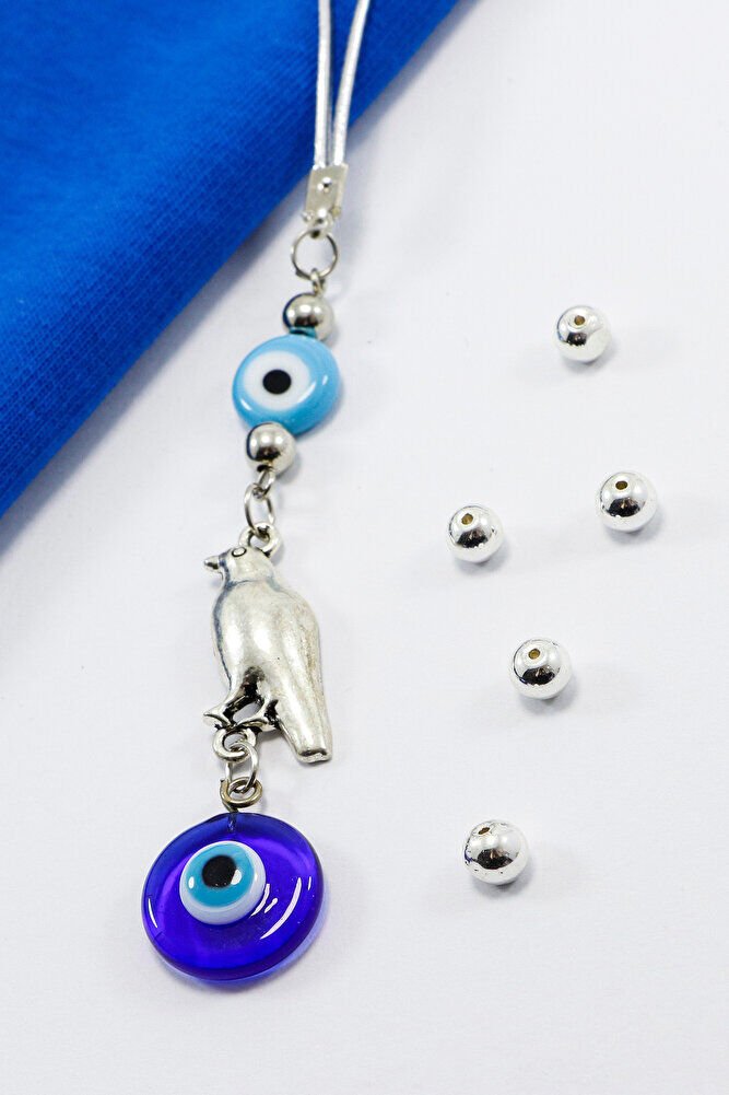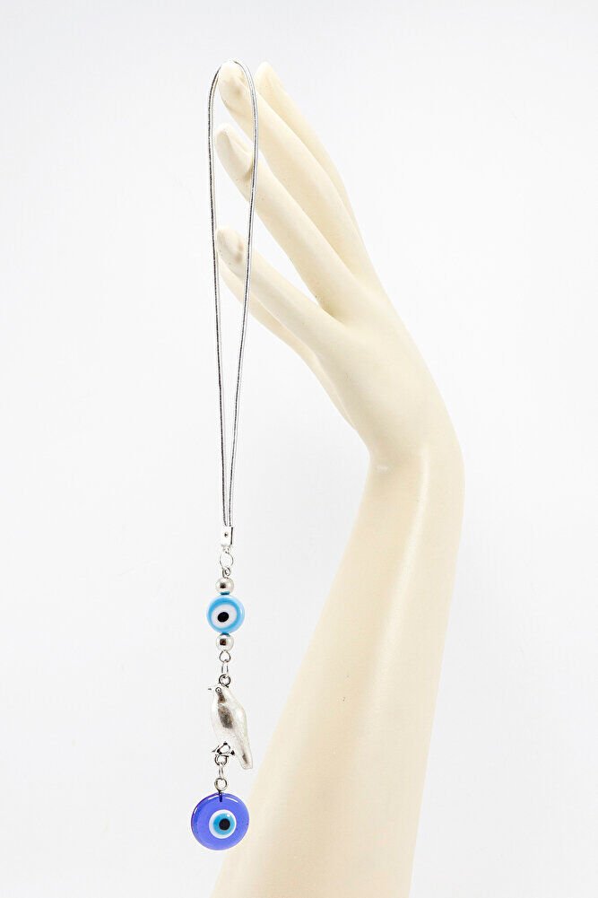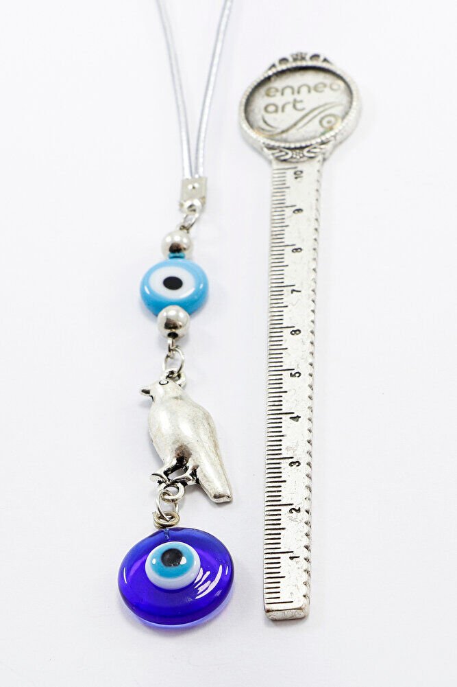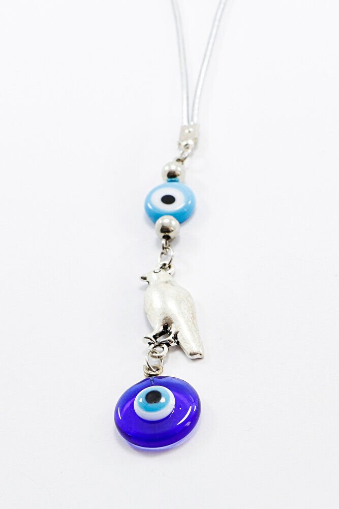 Mavi Cam Yassı Nazar Boncuklu Kuşlu El Yapımı Cam Nazar Boncuklu Araba Dikiz Ayna Süsü