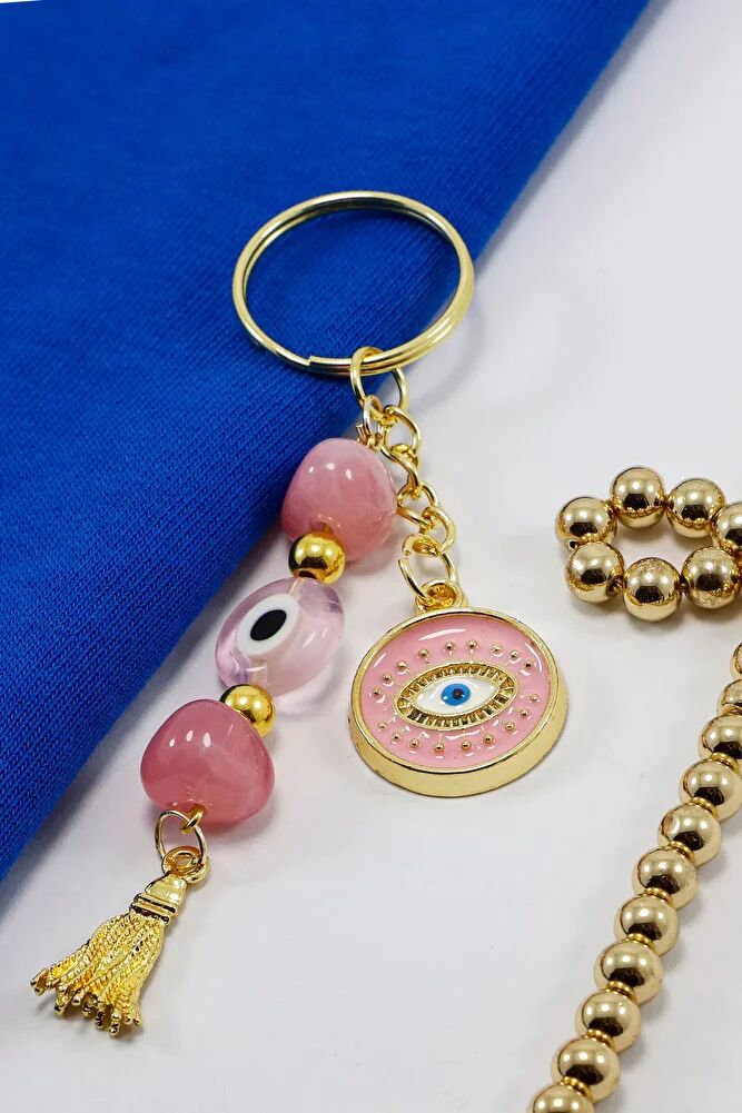 Şeker Pembesi Yassı Nazar Boncuklu Salkım Göz Figürlü Anahtarlık, Hediyelik Anahtarlık