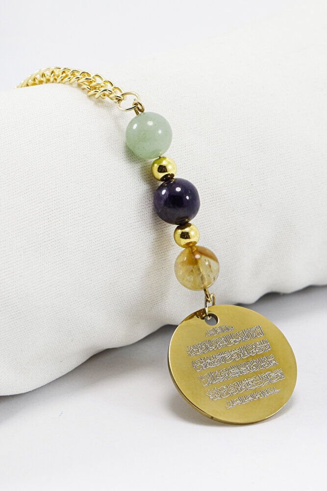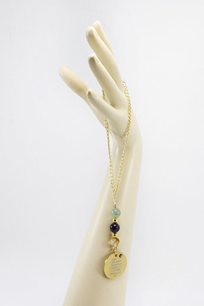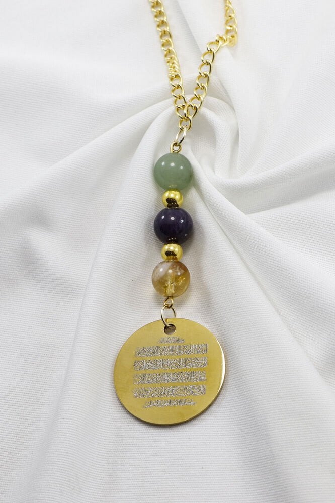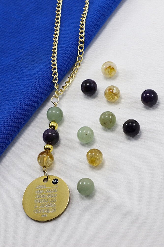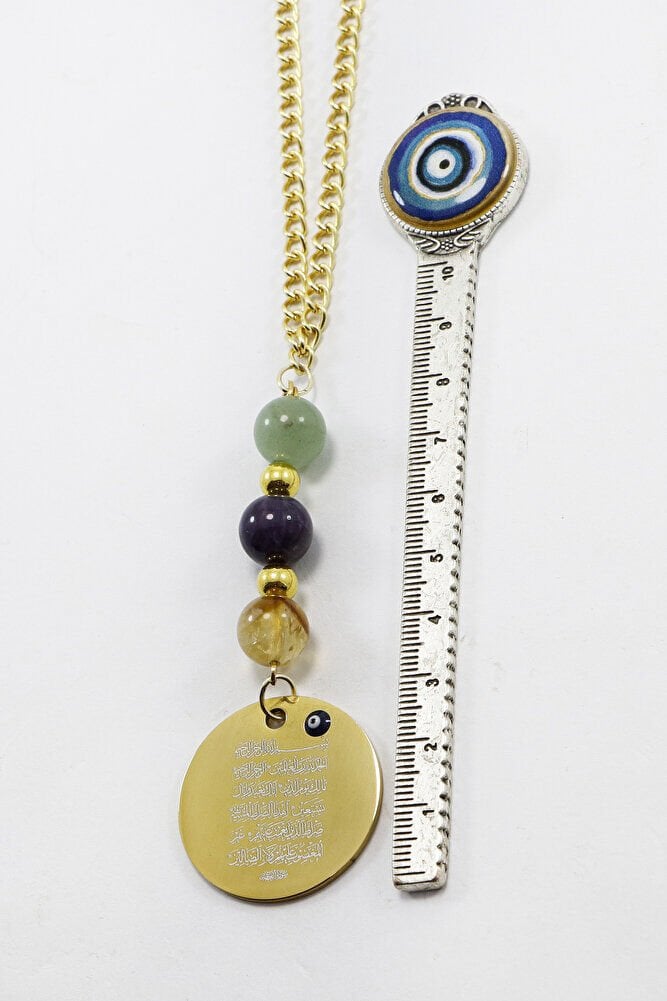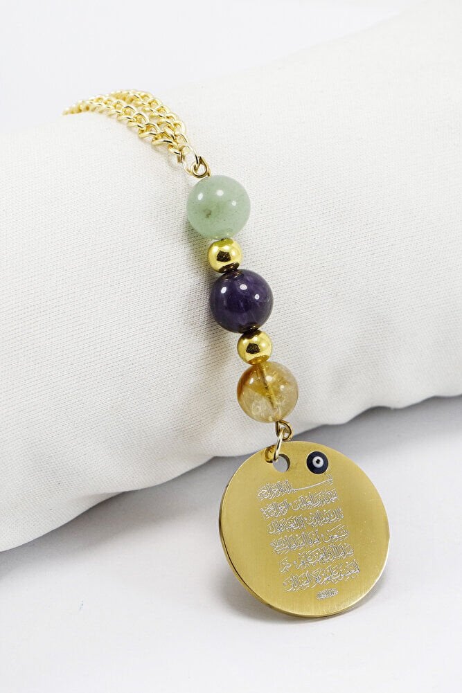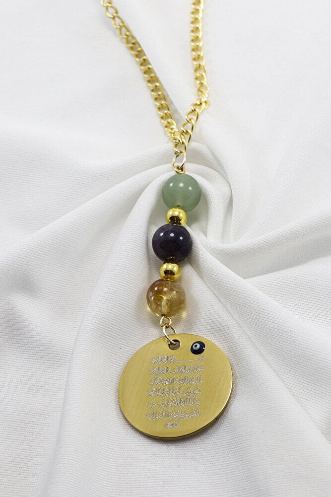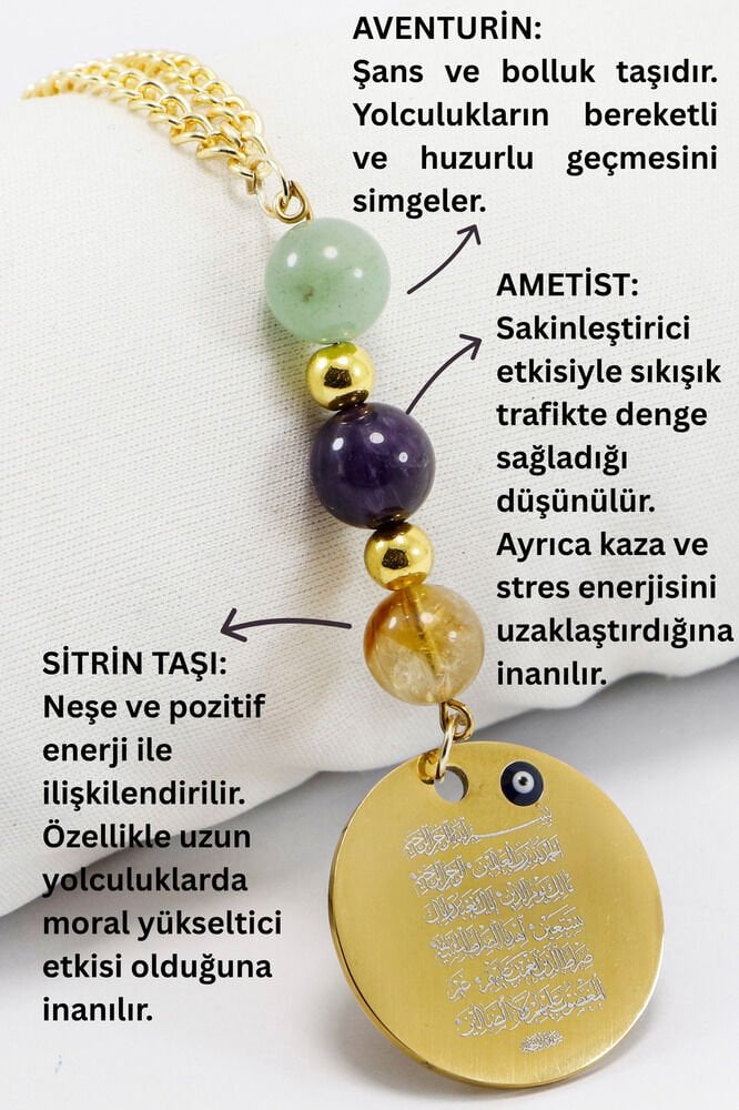 Çelik Ayetel Kürsi Fatiha Dualı Araba Dikiz Ayna Süsü, Doğal Taşlar: Ametist, Sitrin, Aventurin
