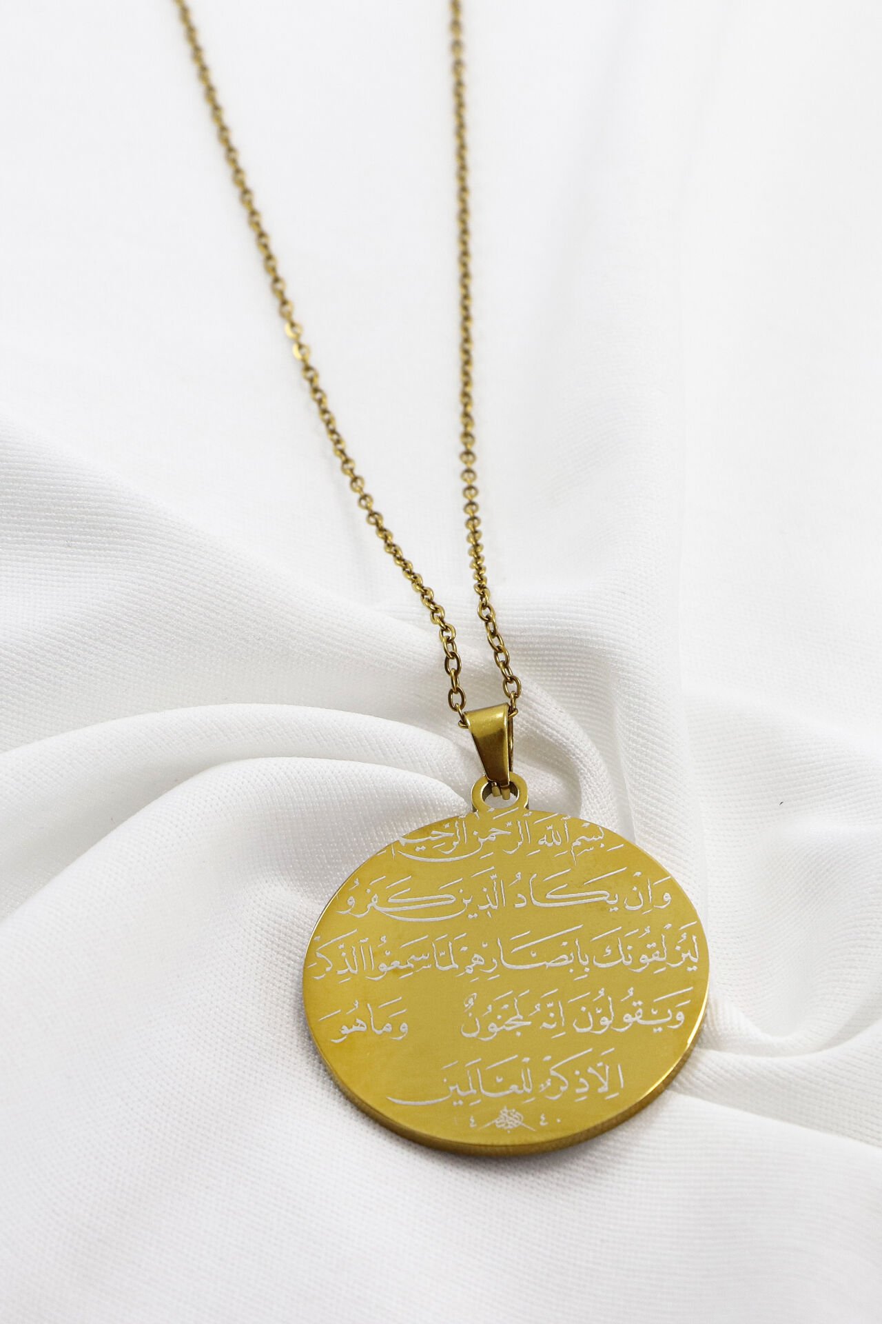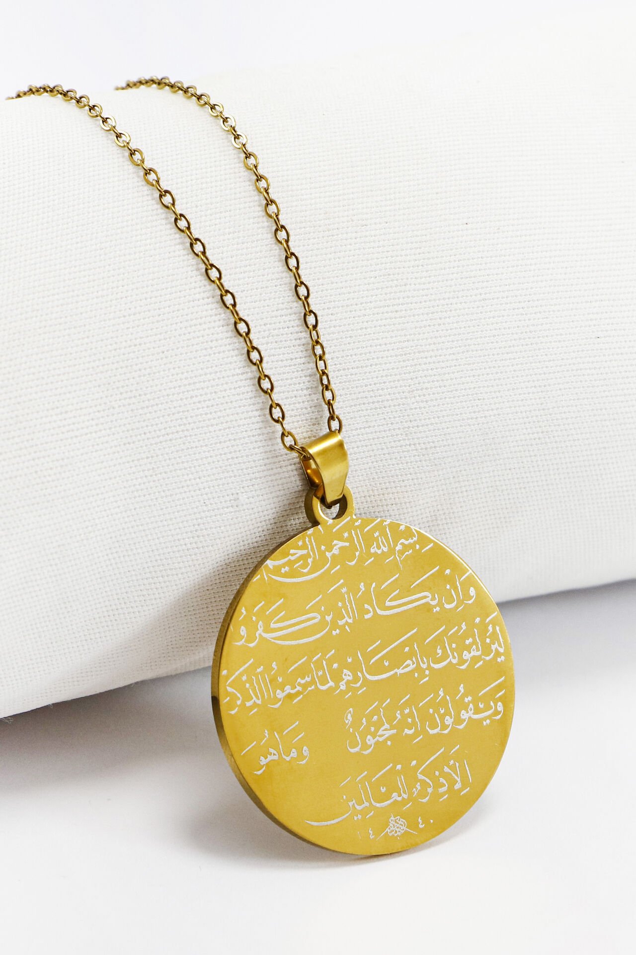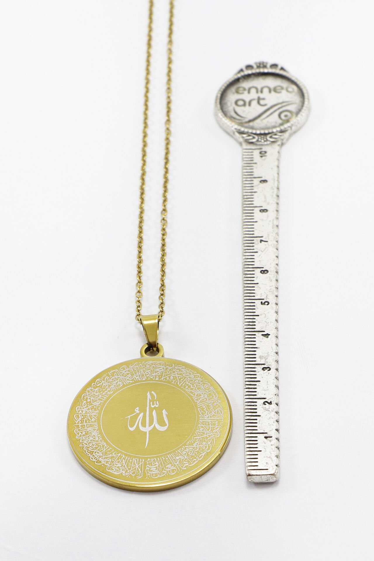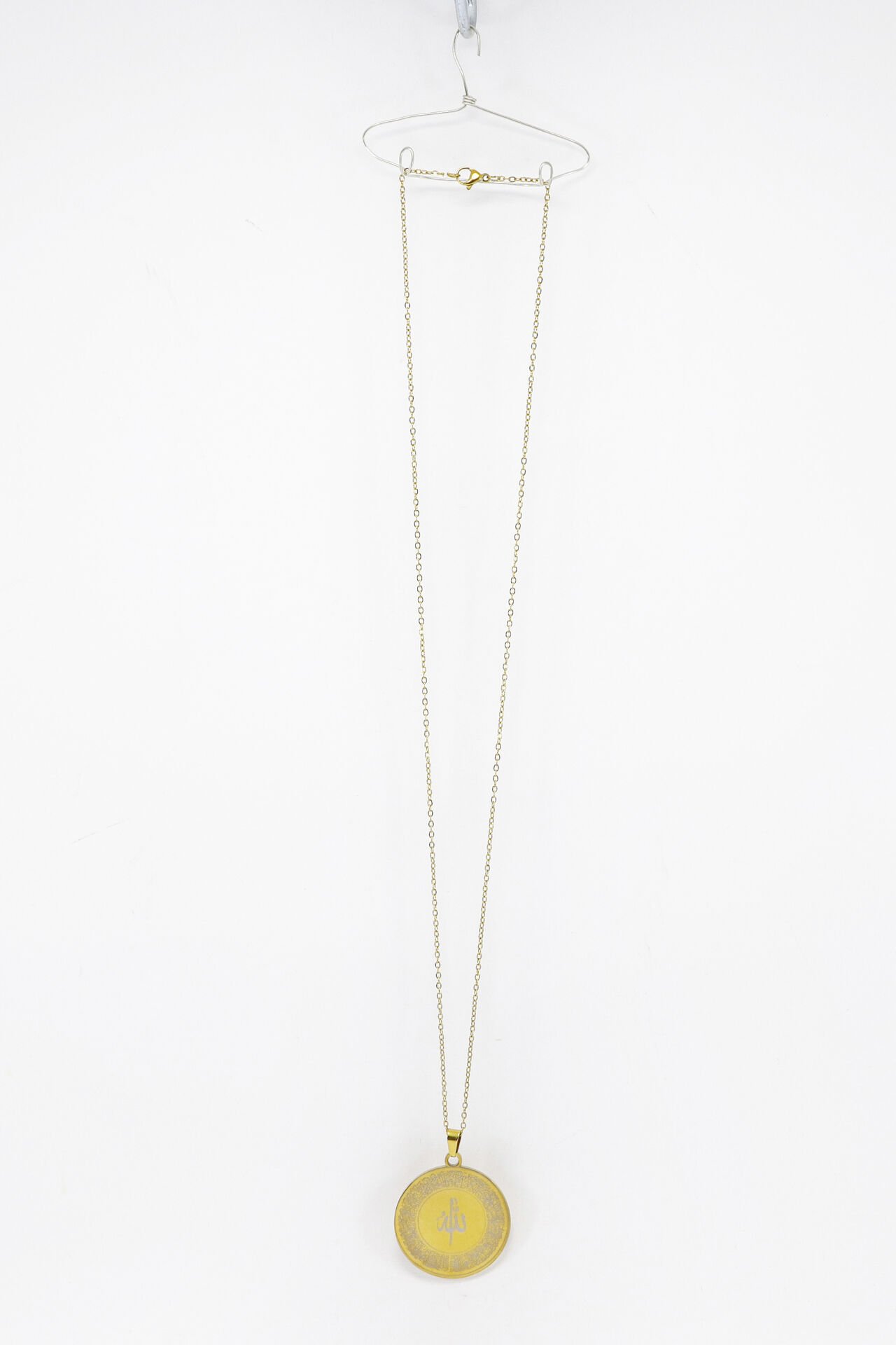 Gold renkteki bu anlam yüklü kolye, 60 cm uzunluğunda paslanmaz çelik zincire ve 3,5 cm çapında çift taraflı bir plakaya sahiptir.