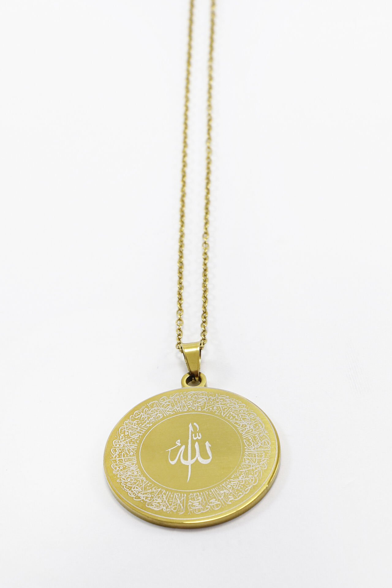 Çift Taraflı Çelik Kolye, Ön Yüzünde Allah Lafzı Hat Ayetel Kürsi Arka Yüzünde Nazar Ayeti Kolye EN005952