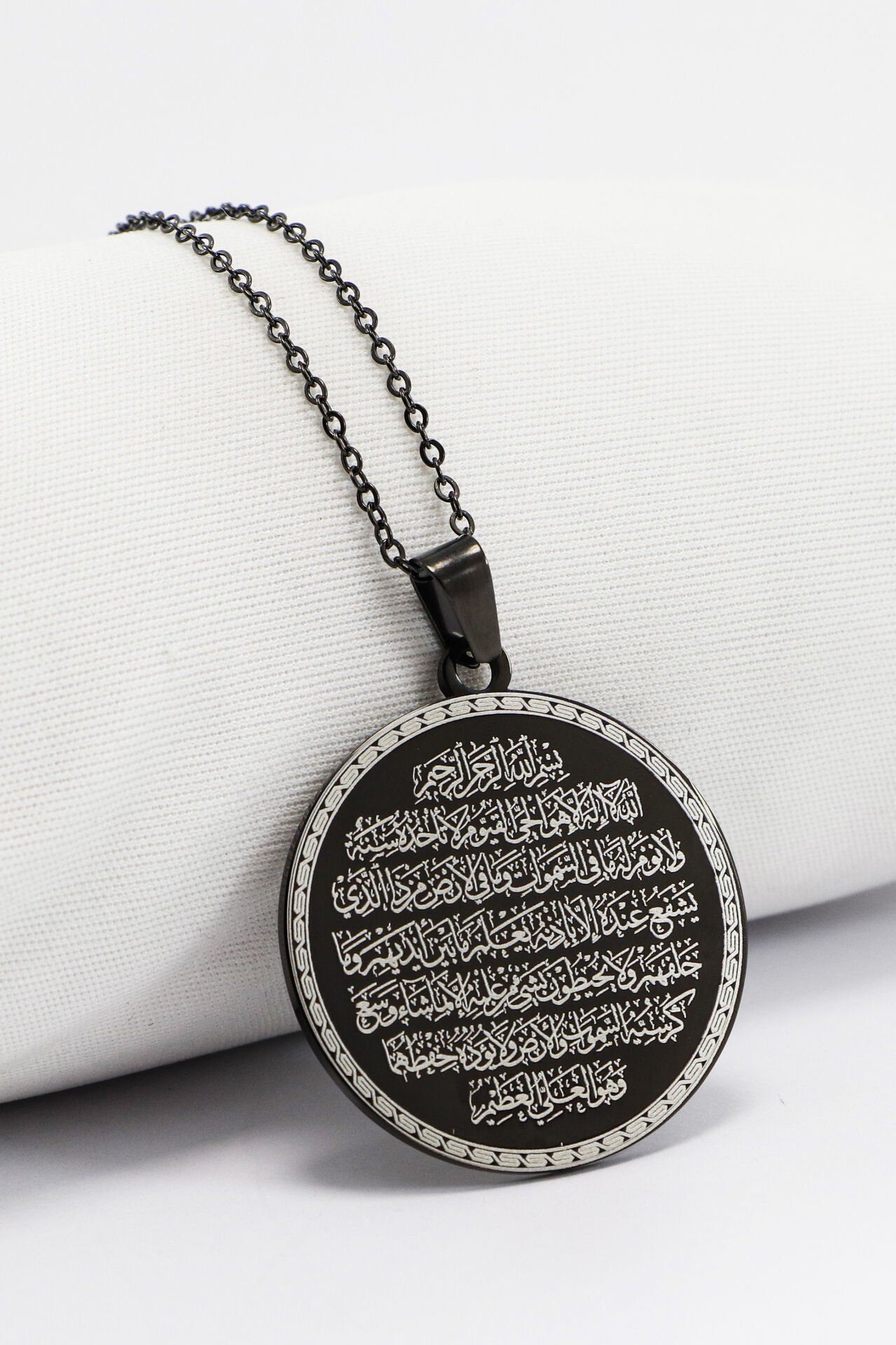 Çift Taraflı Çelik Kolye, Ön Yüzünde Ayetel Kürsi Arka Yüzünde Nazar Ayeti Yazılı Kolye Plaka 3,5cm