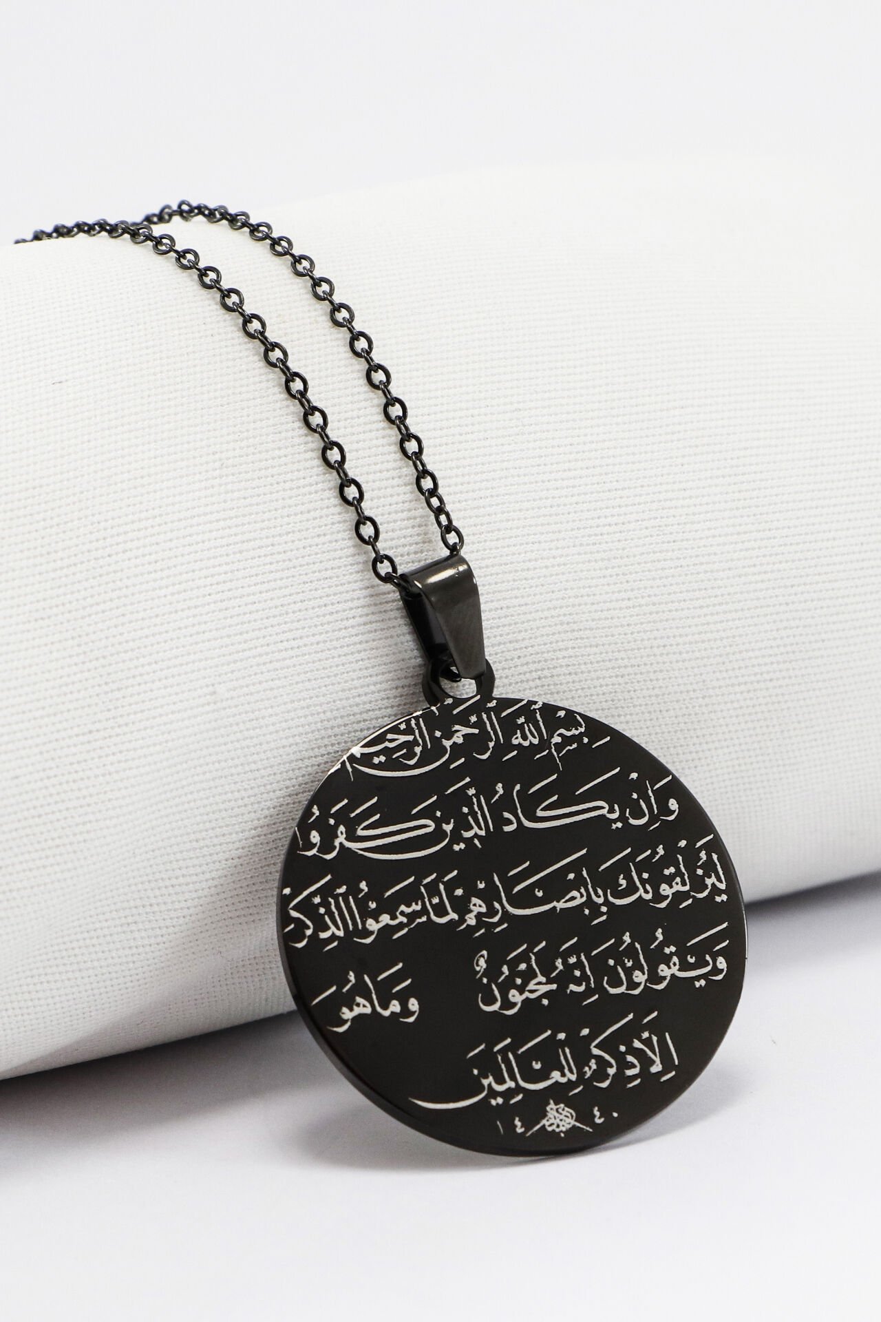Bir yüzünde Nazar Ayeti (Kalem Suresi 51-52. Ayetler), diğer yüzünde ise Ayetel Kürsi (Bakara Suresi 255. Ayet) lazer kazıma yöntemiyle kalıcı olarak işlenmiştir.