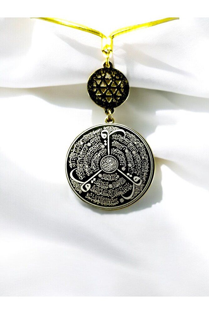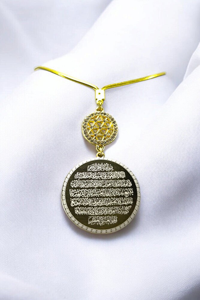 Prayers are permanently engraved with laser engraving technique.; ; The flower of life is single-sided with shiny stones.; ; Since it is handmade, slight differences and irregularities are possible.; ; Since the rope is elastic, it can be easily attached to any model.; ; The plate is gold-colored stainless steel.; ; Black reflection is used to make the prayers clearly visible, which is why the gold product appears black in the image.; ; The plate is double-sided, with Ayetel Kursi on one side and Falak Nas Ikhlas on the other.; ; The steel plate is 3.5 cm in size.; ; Surahs Falak, Nas and Ikhlas are important prayers recited for protection and spiritual strength in the Islamic faith.; It is believed that Surahs Falak and Nas are recited especially for protection from the evil eye, the evil eye and satanic influences.; Surah Falak provides protection against dark forces, while Surah Nas provides protection from negative thoughts and harmful energies.; Surah Ikhlas, on the other hand, expresses the unity and limitless power of Allah. It is believed that this surah brings spiritual peace and protection to the individual. These surahs are frequently recited for those seeking security and peace, and are believed to be of great benefit to those seeking spiritual balance. Ayat al-Kursi is verse 255 of Surah Al-Baqarah and holds a very important place in the Islamic faith. This verse emphasizes Allah's power, sovereignty, and that He is the Supreme Being who knows everything and owns everything. The verse states that Allah is above all things, and no power can act without His permission. Another important aspect that is considered credible is that this verse is believed to protect a person from evil and provide peace and security. Muslims frequently recite Ayat al-Kursi and use it in various situations for protection, prayer, and seeking peace. Therefore, it carries both spiritual and protective meaning.