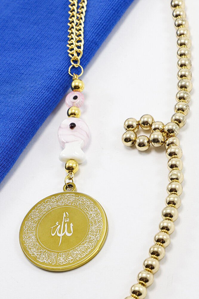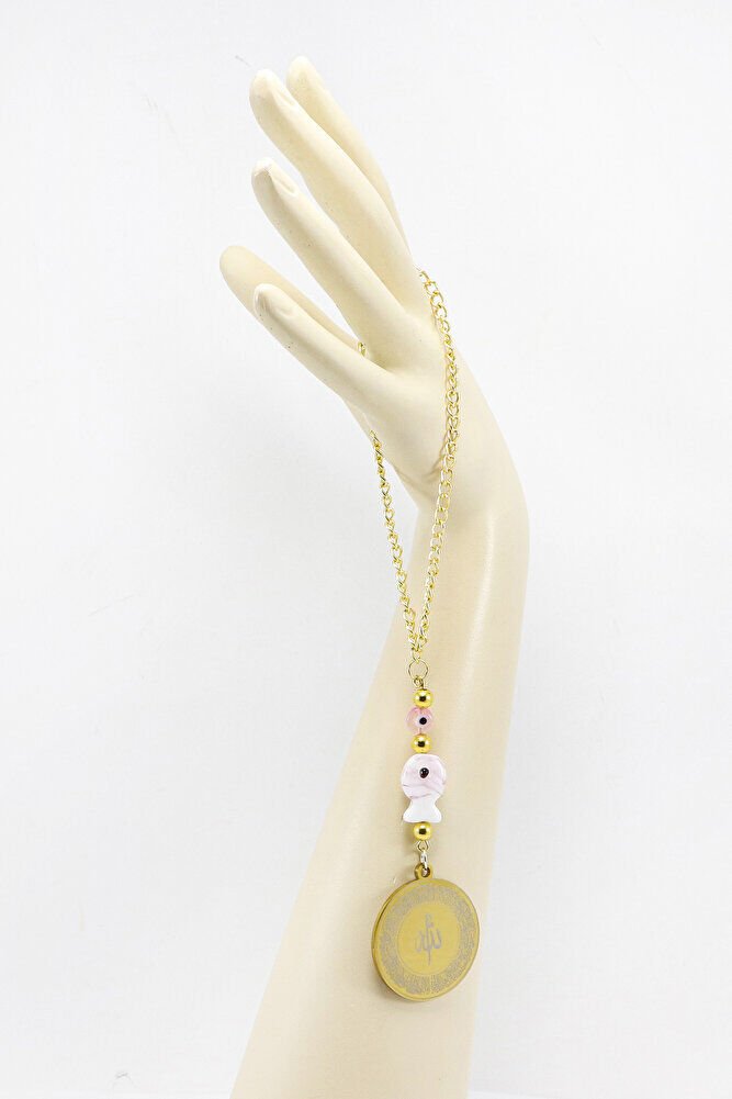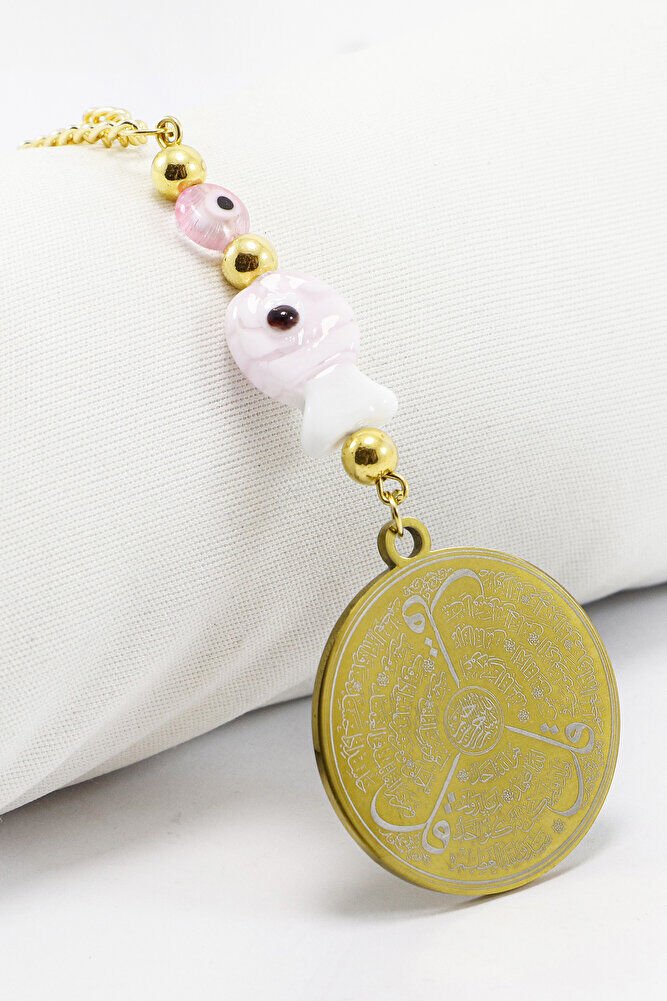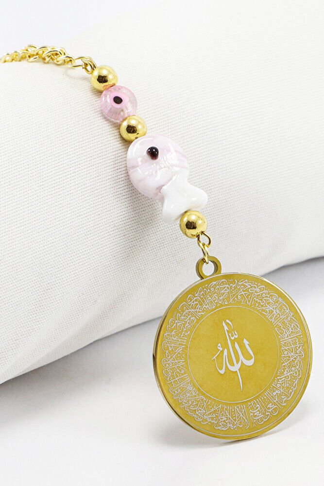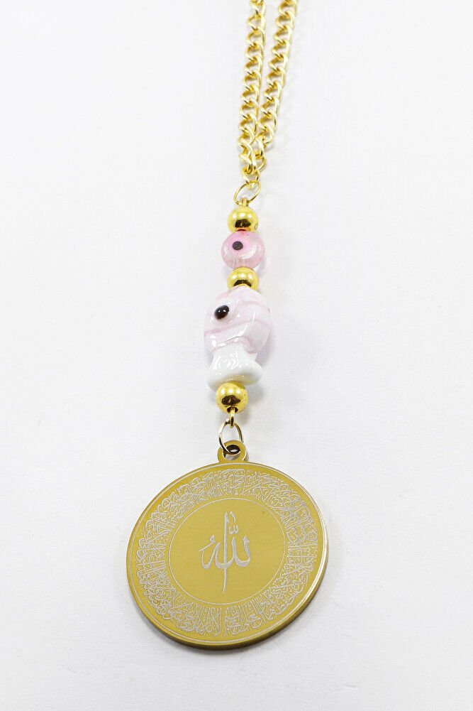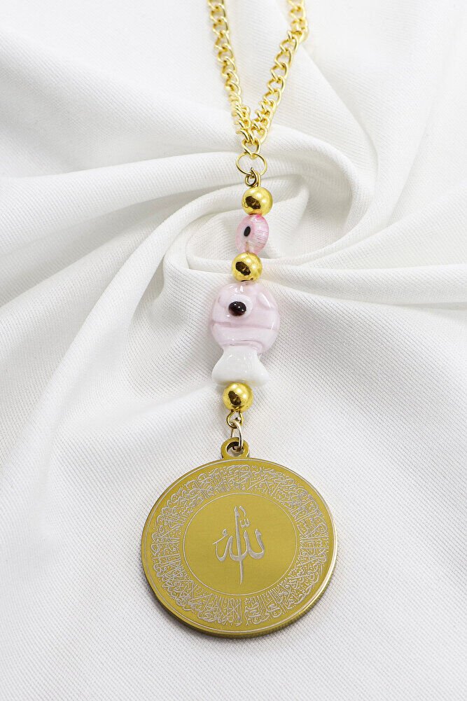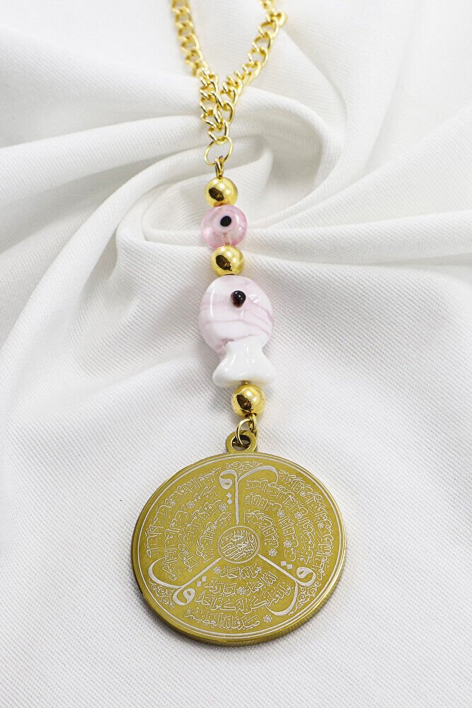 Gold zincirli, balık figürlü el yapımı cam boncuk detaylı bu zarif dikiz ayna süsü; 3,5 cm çapında, paslanmaz çelikten üretilmiş çift taraflı plakaya sahiptir.; Ön yüzünde hat sanatlı “Allah” lafzı ve çevresinde Ayetel Kürsi, arka yüzünde ise Felak, Nas ve İhlas sureleri lazer kazıma tekniğiyle işlenmiştir.; Hem manevi koruma sağlar hem de estetik bir görünüm sunar.; Aracınıza anlam ve şıklık katmak için ideal bir dekorasyon ve hediye seçeneğidir.; Tüm ürün fotoğrafları Ennea Art markasına aittir, izinsiz kullanım ve kopyalama yasaktır.;