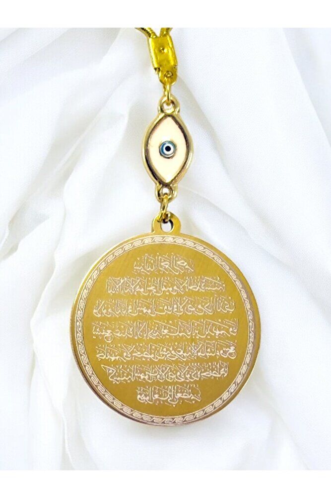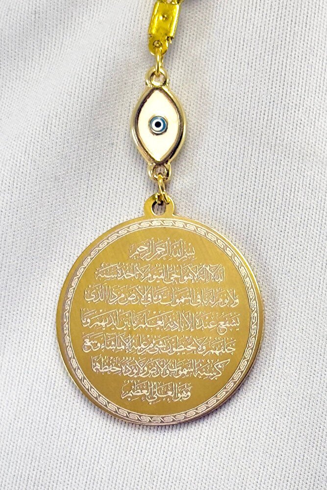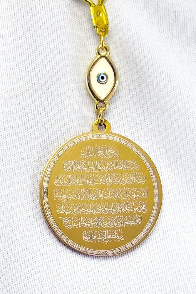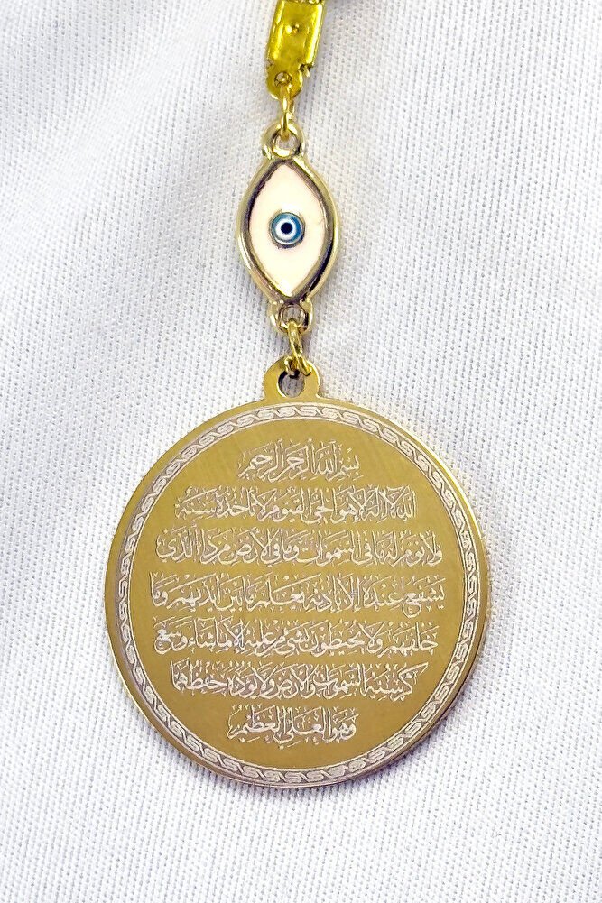 Prayers are permanently engraved with laser engraving technique.; The ellipse evil eye bead is single-sided.; It has Ayetel Kürsi written on its face.; The product is handmade and slight differences and irregularities are possible because it is handmade.; The rope is elastic.; Because it is elastic, it can be easily attached to any model.; The plate is gold-colored stainless steel.; The connection mechanisms are durable gold-plated.; The steel plate measures 3.5 cm.; The plate is double-sided.; It has Ayetel Kürsi on one side and the Evil Eye Verse on the other.; The Evil Eye Verse is a special prayer recited in the Islamic faith for protection from evil eyes and negative energies.; It is believed that the evil eye can bring negative effects and misfortune to a person's life as a result of looking at them with evil intentions.; The Evil Eye Verse protects one from such negative effects by taking refuge in Allah's protection.; It also strengthens belief in Allah's power and divine power to prevent the evil eye from harming a person.; This prayer is believed to provide mental peace and spiritual strength, so it is frequently recited in homes, workplaces, or on personal belongings.; Ayetel Kursi is considered one of the most powerful and protective prayers in Islam.; Ayetel Kursi is a verse that expresses the greatness and sovereignty of Allah and is frequently recited for protection and spiritual strength.; This verse emphasizes that everything in the heavens and the earth belongs to Allah and provides protection from evil influences.; It is believed that reciting it, especially before going to bed at night, is greatly beneficial in terms of safety, protection from harmful energies, and spiritual peace.; At the same time, it gives a person spiritual comfort and strength through the belief that Allah knows everything and that everything depends on Him.;