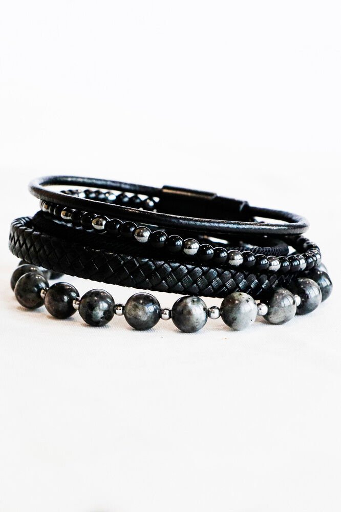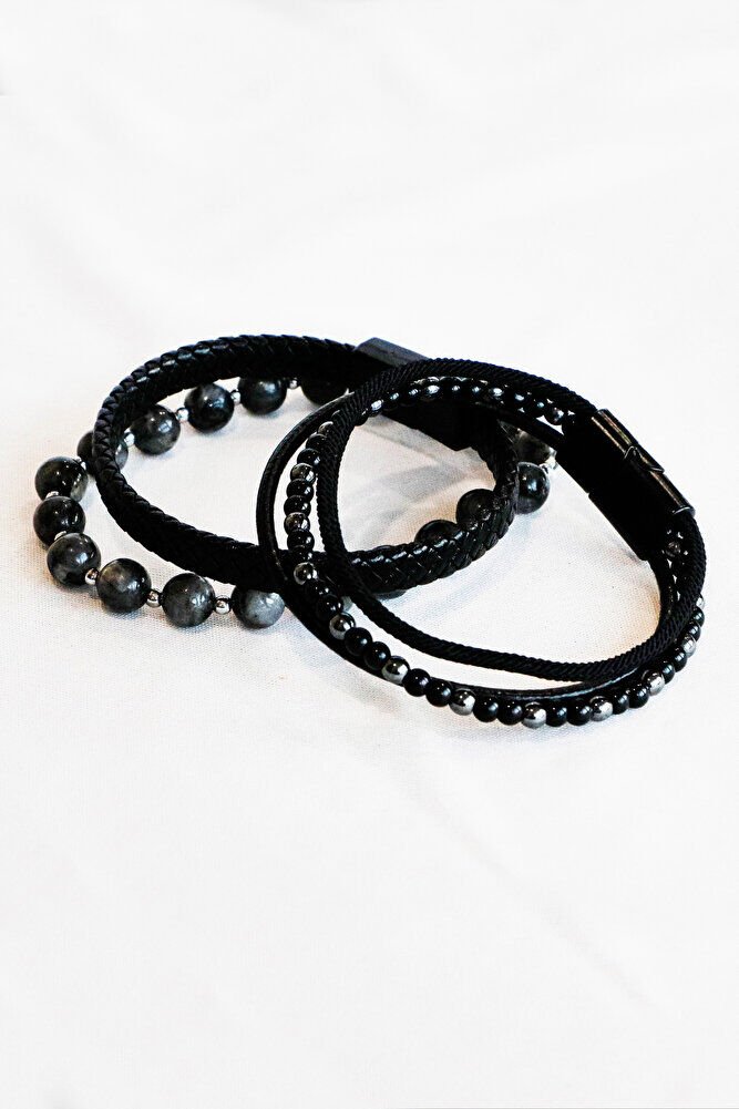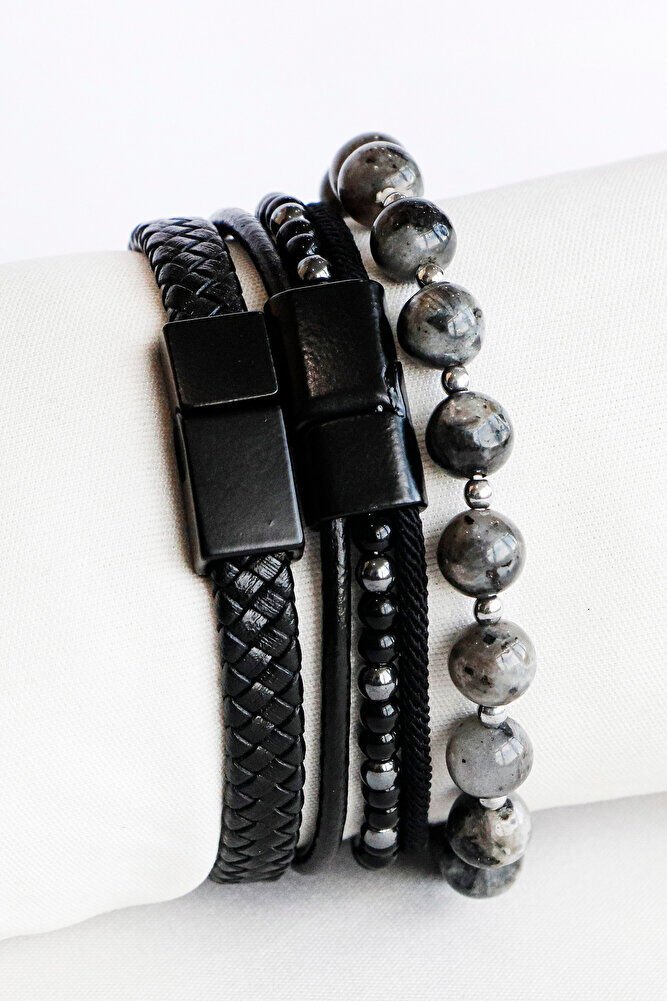 Erkek Bileklik Üçlü Kombin Oniks Doğal Taşlı + Hakiki Deri Bileklik + Spektrolik Ddoğaltaş Bileklik