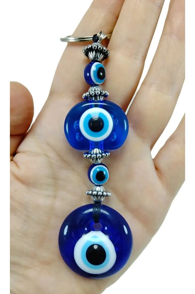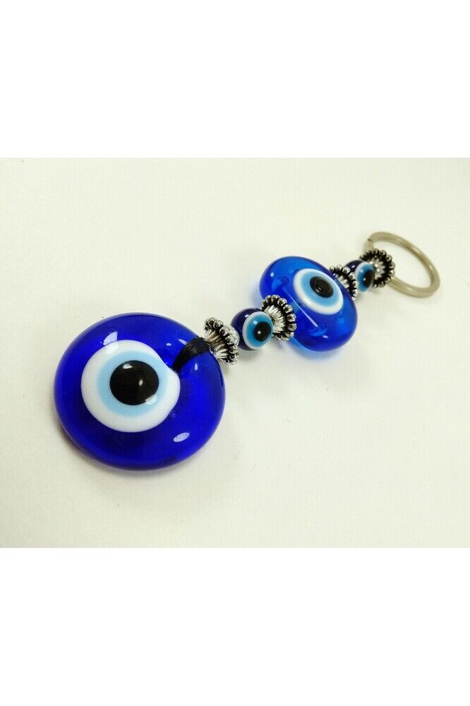 The glass bead is 3-3.5 cm in size. ; Because it is handmade, slight differences and irregularities are possible. ; The evil eye bead is a type of protective object used in Turkish culture and some other Middle Eastern countries. ; It is a small bead, usually designed in blue and white, with a black dot or eye shape inside. The purpose of the evil eye bead is to ward off bad luck, envy, or the evil eye (gaze) and to protect against it. ; Therefore, it can be used in homes, cars, workplaces, jewelry, and even babies' clothing.