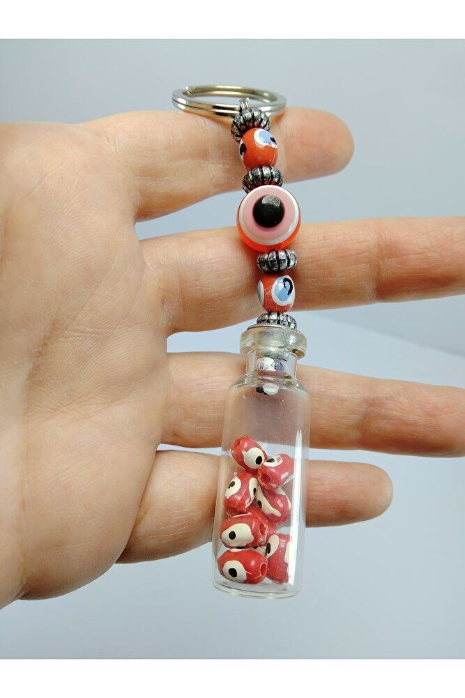 - Standing out with its handmade design, this keychain offers both elegance and utility; - With its evil eye bead detail, this accessory aims to bring luck and prosperity to your homes and increases functionality with a decorative touch; - Drawing attention with its vibrant red color, this keychain is ideal for both personal use and offers a thoughtful option as a gift for your loved ones; - With its bottle-shaped design, it adds both a modern and nostalgic air, easily adapting to any living space;