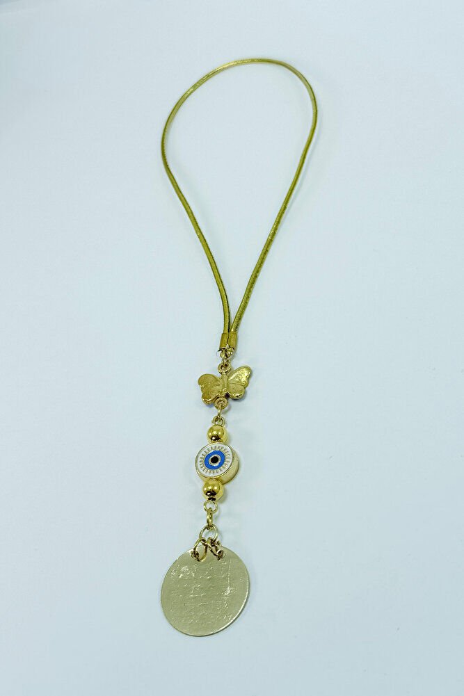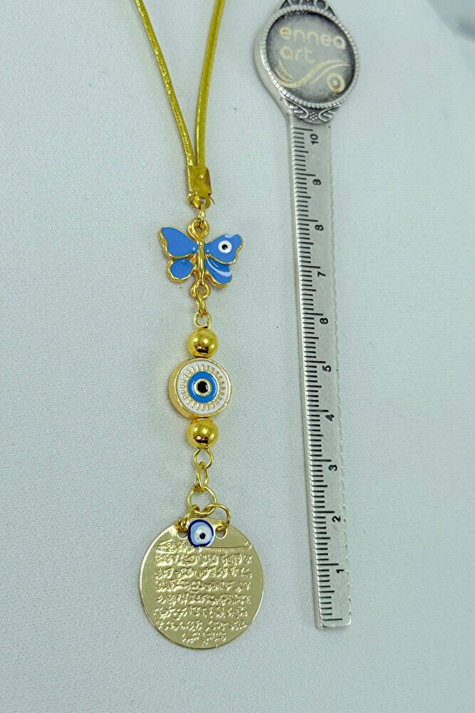 The product is handmade.; Since it is handmade, slight differences and irregularities are possible.; ; The gold-colored rope is elastic.; Thanks to its elastic structure, it can be easily attached to any model.; ; The enameled butterfly is single-sided.; ; The product is metal.; It is single-sided.; The plate with Ayetel Kürsi written is metal and measures 2 cm.; The blue butterfly measures 2 cm.; ; The evil eye is a powerful symbol believed to ward off bad energy and the evil eye.; Traditionally blue, this eye figure is associated with protection, luck, and abundance in many cultures.; The eye symbol, which has a deep-rooted history dating back to Ancient Egypt and the Ottoman Empire, also represents divine supervision and spiritual awareness.; The evil eye, believed to act as a shield against jealousy and negative energies that people unconsciously emit, helps balance the energy of a person or a space by being used in many areas such as jewelry, home decorations and accessories.