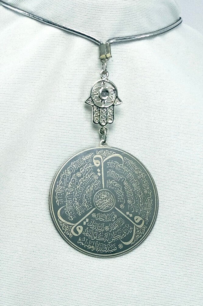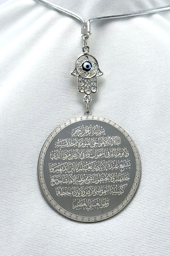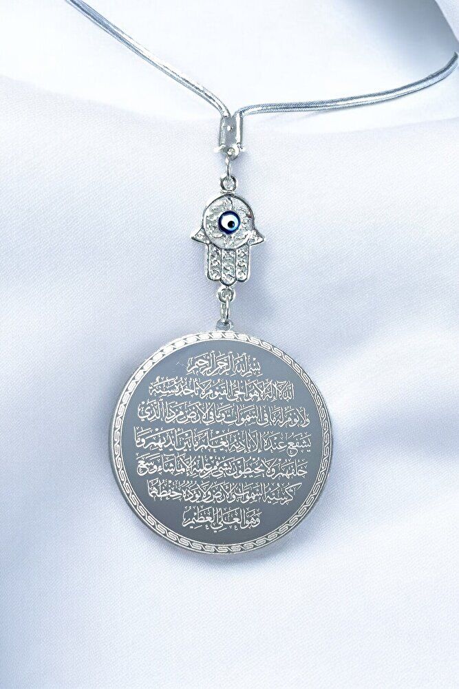 Prayers are permanently engraved with laser engraving technique.; The evil-eye hamsa hand is one-sided.; The Hamsa hand, also known as the Hand of Fatima, is known as a symbol of protection accepted in many cultures, especially in the Middle East and North Africa.; In Islamic tradition, this symbol attributed to Hz. Fatima, the daughter of Hz. Muhammad, is believed to be used for protection against the evil eye, warding off bad energies and bringing peace.; The eye motif in the palm is associated with the idea that it acts as a kind of spiritual shield, especially against evil gazes.; It is also considered to carry meanings such as patience, abundance, compassion and strength.; This figure, considered by many as a symbol of spiritual security and peace, is frequently used in jewelry, home decorations and various accessories.; The product is handmade and slight differences and irregularities are possible because of handmade.; The rope is elastic.; Since it is elastic, it can be easily attached to any model.; The plate is silver colored stainless steel.; The steel plate measures 4.5 cm.; The plate is double-sided.; Green agate is a precious stone believed to balance energy, give courage and protect one from negative energies in many cultures and belief systems.; It is known and accepted for its calming effects, especially in the face of stress and tension.; Associated with the root chakra, this stone is thought to increase physical endurance, support determination and boost self-confidence.; It is also widely believed that it has been carried since ancient times as a protection against the evil eye and to strengthen one's spiritual strength.; Used both as an accessory and as a talisman, red agate has been a preferred stone for those seeking spiritual balance and confidence.; Ayetel Kürsi is depicted on one side and Felak Nas Ihlas on the other.; Ayetel Kürsi is considered one of the most powerful and protective prayers in Islamic belief.; Ayetel Kürsi is a verse that expresses the greatness and sovereignty of Allah and is frequently recited for protection and spiritual strength.; This verse emphasizes that everything in the heavens and the earth belongs to Allah and provides protection from satanic influences. It is believed that reciting it, especially before going to bed, is greatly beneficial in terms of security, protection from harmful energies, and spiritual peace. It also gives a person spiritual comfort and strength through the belief that Allah knows everything and that everything depends on Him. Surahs al-Falaq, an-Nas, and al-Ikhlas are important prayers recited in Islam for protection and spiritual strength. Surahs al-Falaq and an-Nas are read specifically for protection from evil eyes, the evil eye, and satanic influences. While Surah al-Falaq provides protection against dark forces, Surah an-Nas is believed to provide protection from negative thoughts and harmful energies. Surah al-Ikhlas expresses the oneness and unlimited power of Allah, and it is believed that this surah brings spiritual peace and protection to the person. These surahs are frequently recited for those seeking security and peace and are believed to be of great benefit to those seeking spiritual balance.