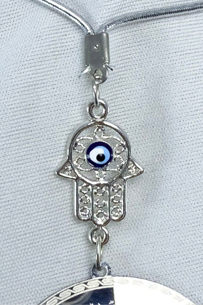 Evil Eye Hamse Steel Ayetel Kursi Felak Nas Ihlas Double Sided Car Rearview Mirror Ornament 4.5 cm Plate