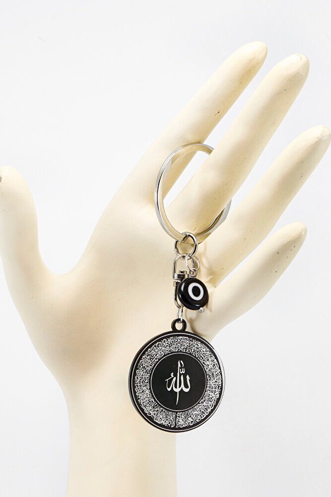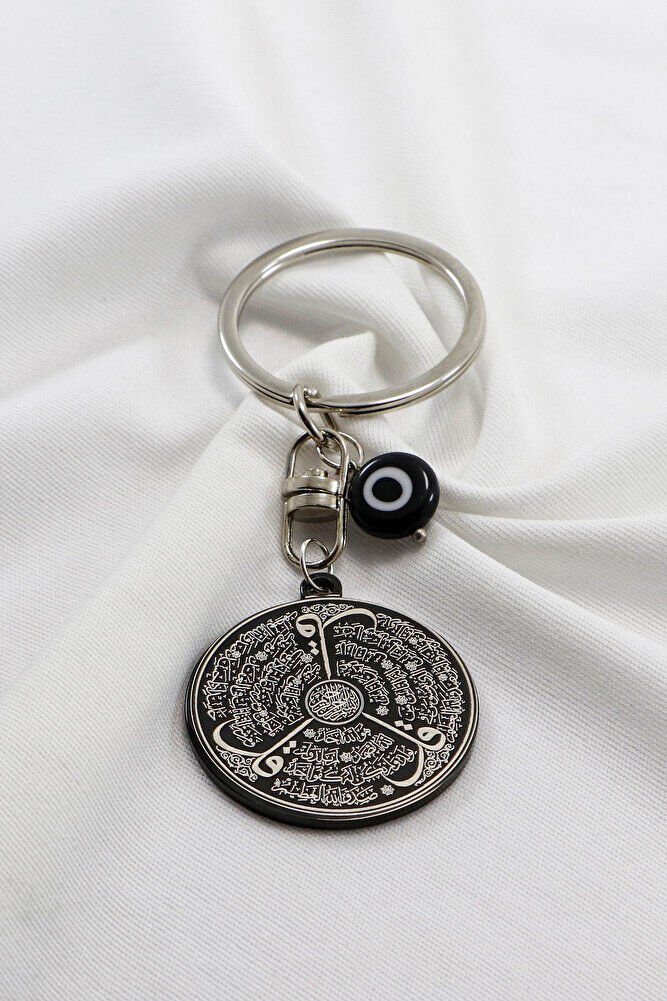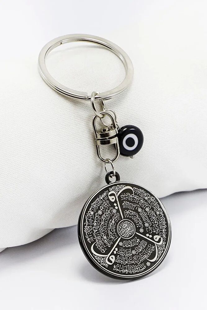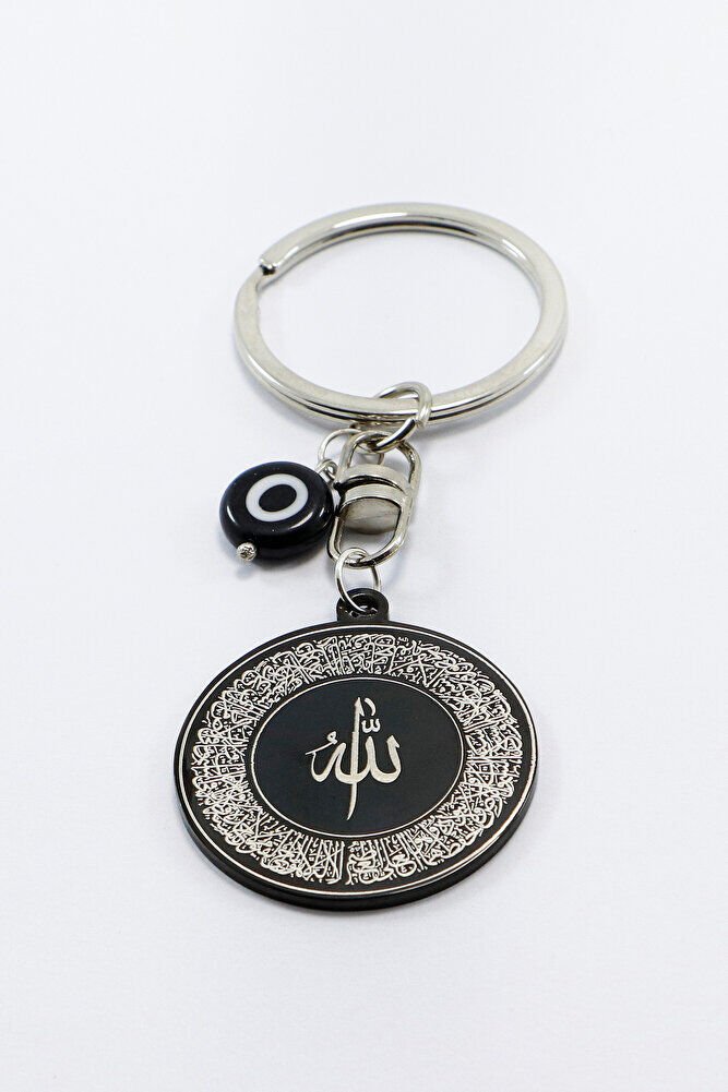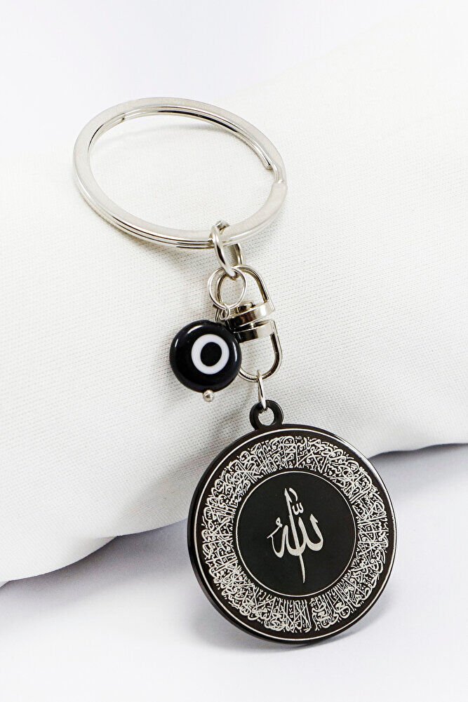 Flat Evil Eye Beaded Black Steel Double Sided Ayetel Kursi Allah Word Falak Nas Ihlas Keychain