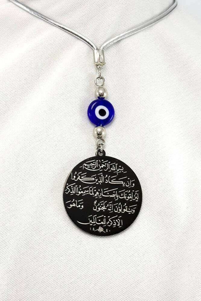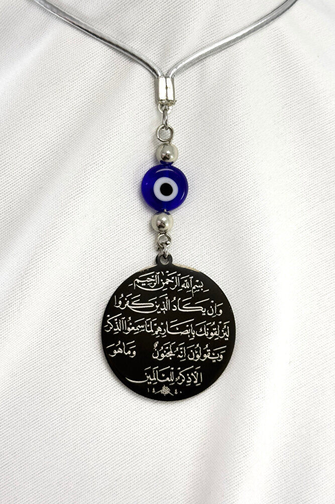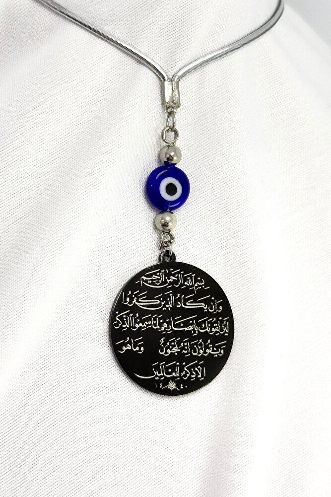 Prayers are permanently engraved with laser engraving technique.; Flat evil eye bead is handmade glass.; It is double-sided.; The product is handmade and slight differences and irregularities are possible because it is handmade.; The rope is elastic.; Because it is elastic, it can be easily attached to any model.; The plate is black stainless steel.; The steel plate measures 3.5 cm.; The plate is double-sided.; It has Ayetel Kürsi on one side and the Evil Eye Verse on the other.; Ayetel Kürsi is considered one of the most powerful and protective prayers in the Islamic faith.; Ayetel Kürsi is a verse that expresses the greatness and sovereignty of Allah and is frequently recited for protection and spiritual strength.; This verse emphasizes that everything in the heavens and the earth belongs to Allah and provides protection from evil influences.; It is believed that reading it especially before going to bed at night is greatly beneficial in terms of staying safe, protecting from harmful energies and providing spiritual peace.; It also provides spiritual comfort and strength to a person through the belief that Allah knows all things and that everything depends on Him. The evil eye verse is a special prayer recited in Islam to protect against evil eyes and negative energies. The evil eye, when looked at with malicious intent, can bring negative effects and misfortune into a person's life. The evil eye verse protects a person from such negative effects by seeking refuge in Allah's protection. It also strengthens belief in Allah's power and divine power to prevent the evil eye from harming a person. This prayer is believed to provide mental peace and spiritual strength, so it is frequently recited in homes, workplaces, or on personal belongings.