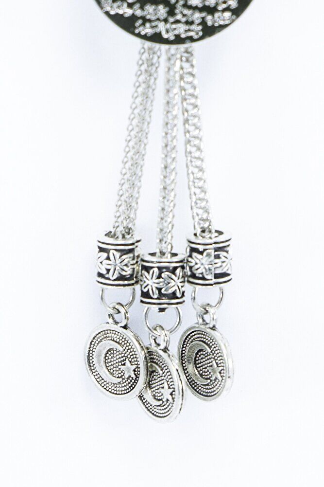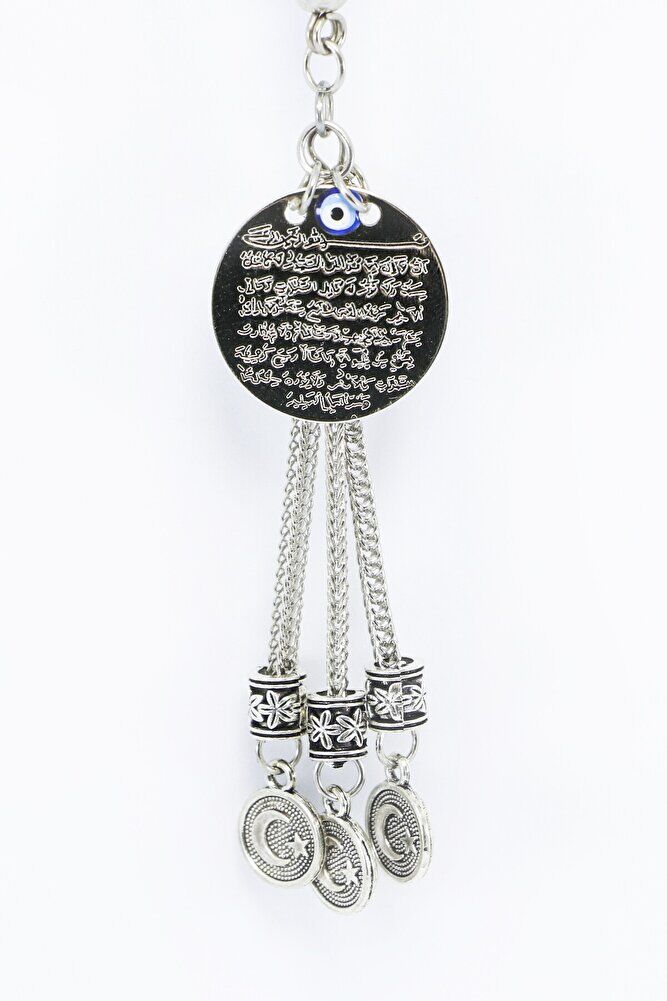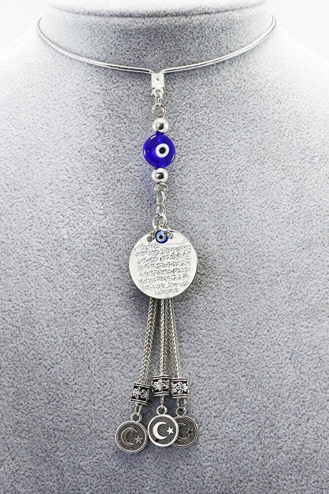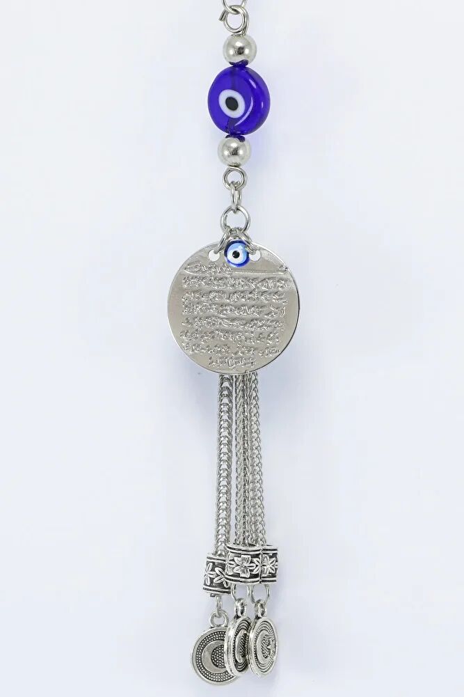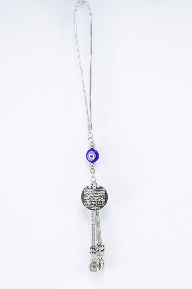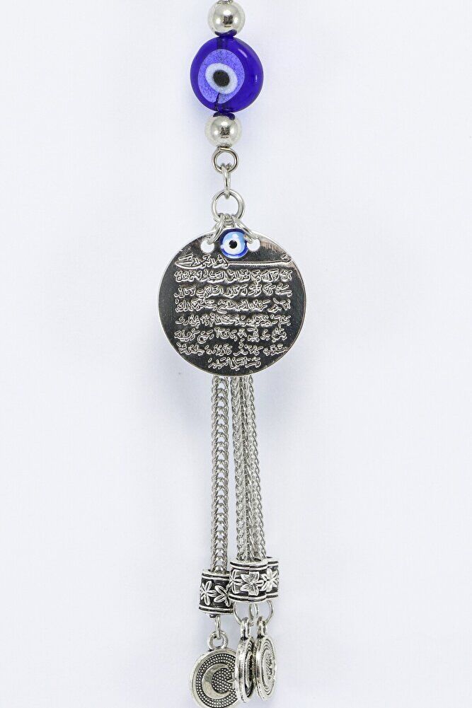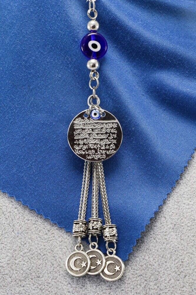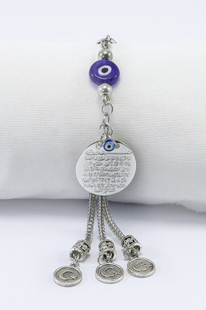 The product is handmade.; Since it is handmade, slight differences and irregularities are possible.; The rope is elastic, and thanks to its elastic structure, it can be easily attached to any model of vehicle.; The product is silver colored metal.; The product is single-sided.; Ayetel Kürsi is also single-sided and measures 2 cm.; Ayetel Kürsi is verse 255 of Surah Al-Baqarah and has a very important place in the Islamic belief.; This verse emphasizes the power, sovereignty and that Allah is the Supreme Being who knows everything and owns everything.; The verse states that Allah is above everything and that no power can act without His permission.; Another important issue that is considered believeable is that it is believed that this verse will protect a person from evil and give peace and security.; Muslims frequently recite Ayetel Kürsi and use it for protection, prayer and seeking peace in various situations.; Therefore, it has both spiritual and protective meaning.; flat evil eye bead is handmade glass.;