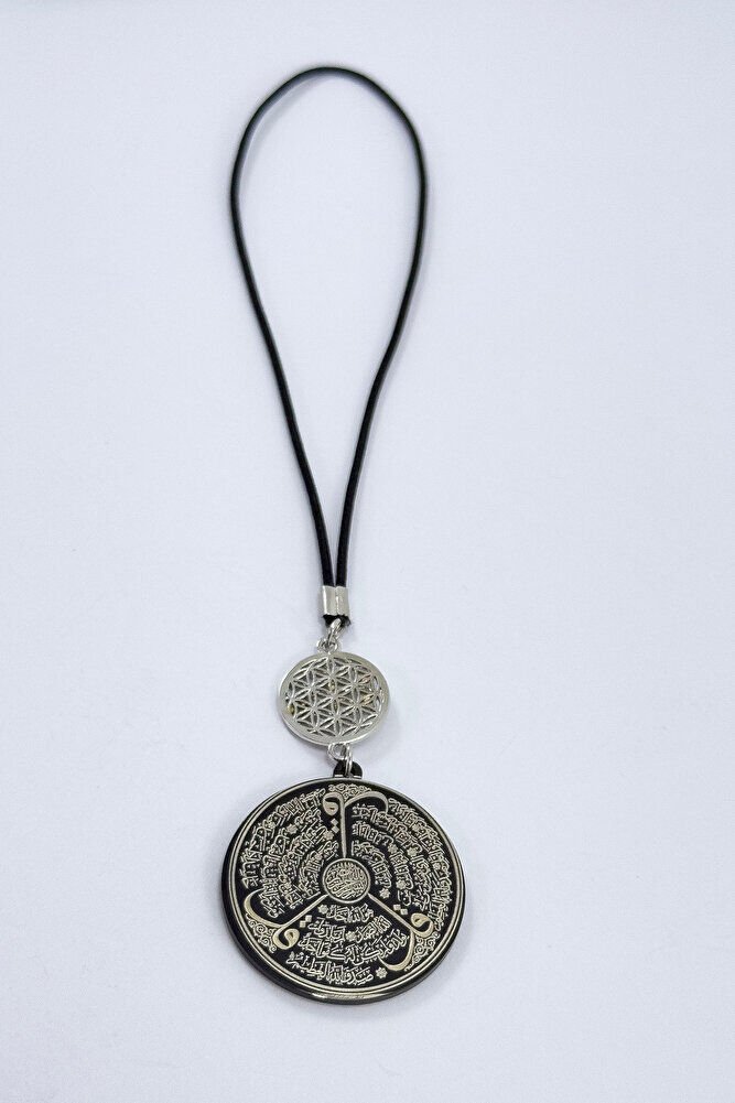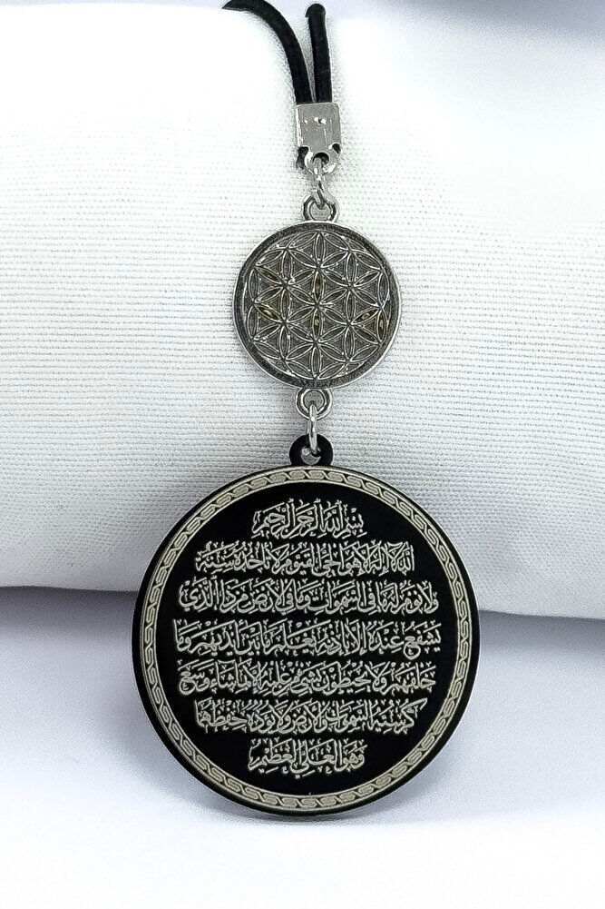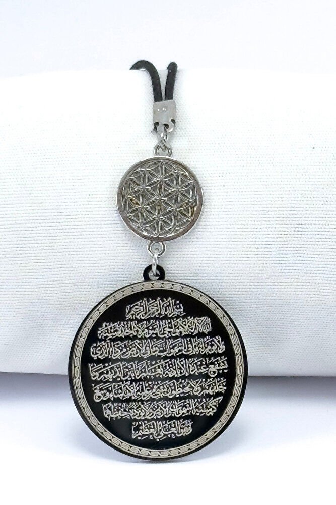 Prayers are permanently engraved with laser engraving technique.; The flower of life is double-sided.; The product is handmade and slight differences and irregularities are possible because it is handmade.; The rope is elastic.; Because it is elastic, it can be easily attached to any model.; The plate is black stainless steel.; The steel plate measures 3.5 cm.; The plate is double-sided.; On one side is Ayetel Kursi and on the other side is Falak Nas Ikhlas.; Ayetel Kursi is verse 255 of Surah Al-Baqarah and has a very important place in the Islamic belief.; This verse emphasizes the power, sovereignty of Allah and that He is the Supreme Being who knows everything and owns everything.; The verse states that Allah is above everything and that no power can act without His permission.; Another important issue that is considered believable is that it is believed that this verse will protect the person from evil and give peace and security.; Muslims frequently recite Ayat al-Kursi and use it in various situations for protection, supplication, and seeking peace. Therefore, it carries both spiritual and protective meaning. Surahs al-Falaq, an-Nas, and al-Ikhlas are important prayers recited in Islam for protection and spiritual strength. It is believed that al-Falaq and an-Nas are specifically recited for protection from evil eyes, the evil eye, and satanic influences. Surah al-Falaq protects against dark forces, while an-Nas provides protection from negative thoughts and harmful energies. Surah al-Ikhlas expresses the oneness and unlimited power of Allah, and it is believed that this surah brings spiritual peace and protection from Allah. These surahs are frequently recited for those seeking security and peace and are believed to be of great benefit to those seeking spiritual balance.