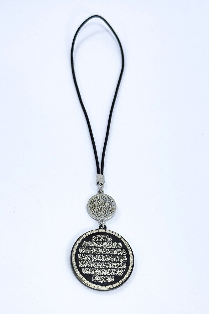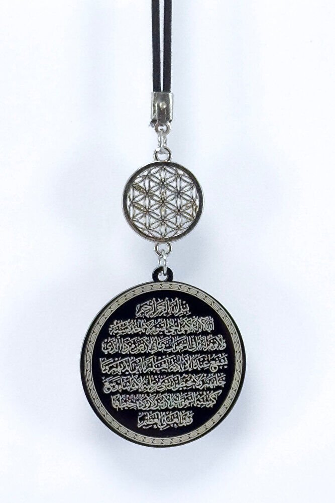 Yaşam Çiçeği Siyah Çelik Çift Taraflı Ayetel Kürsi / Felak Nas Ihlas Araba Dikiz Ayna Süsü