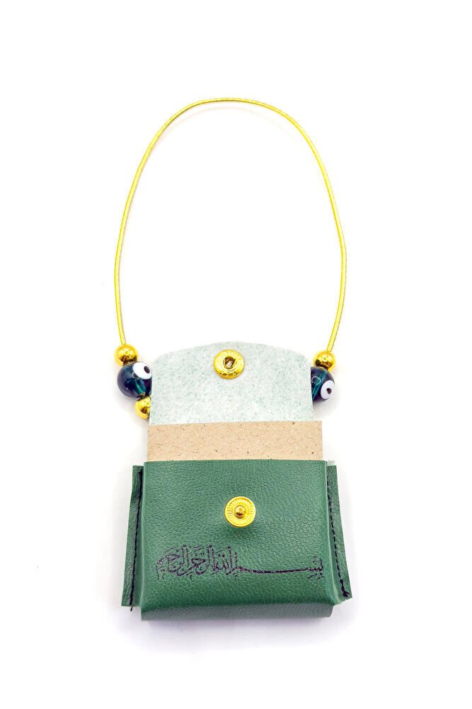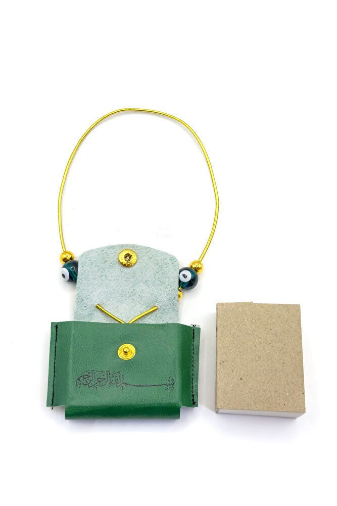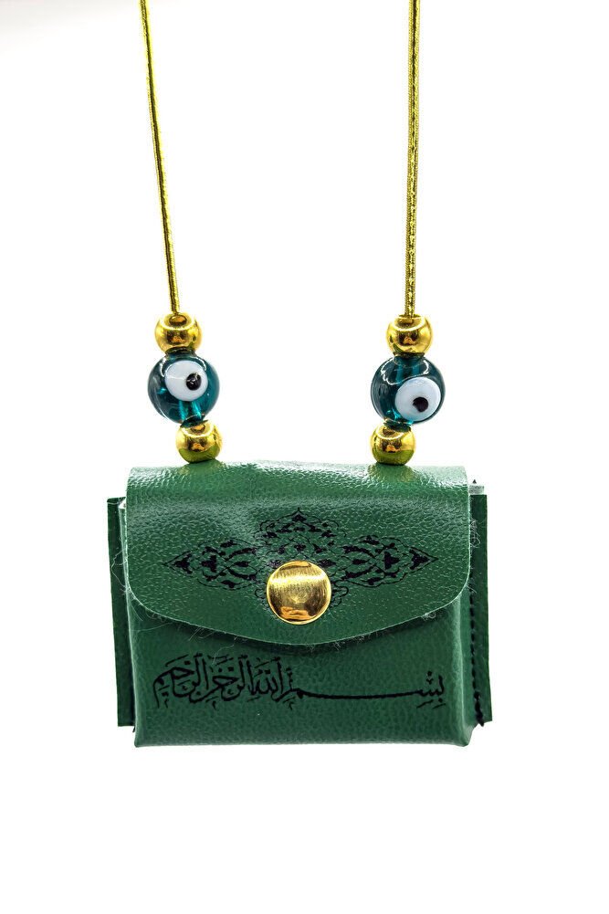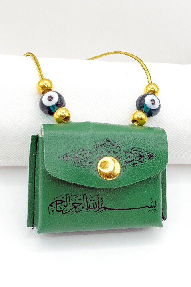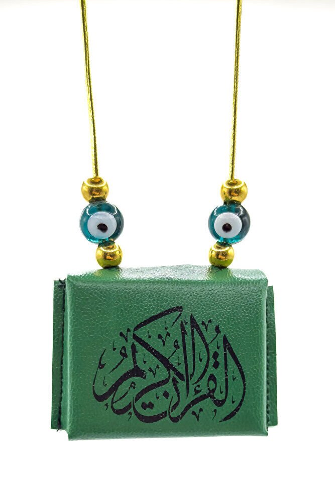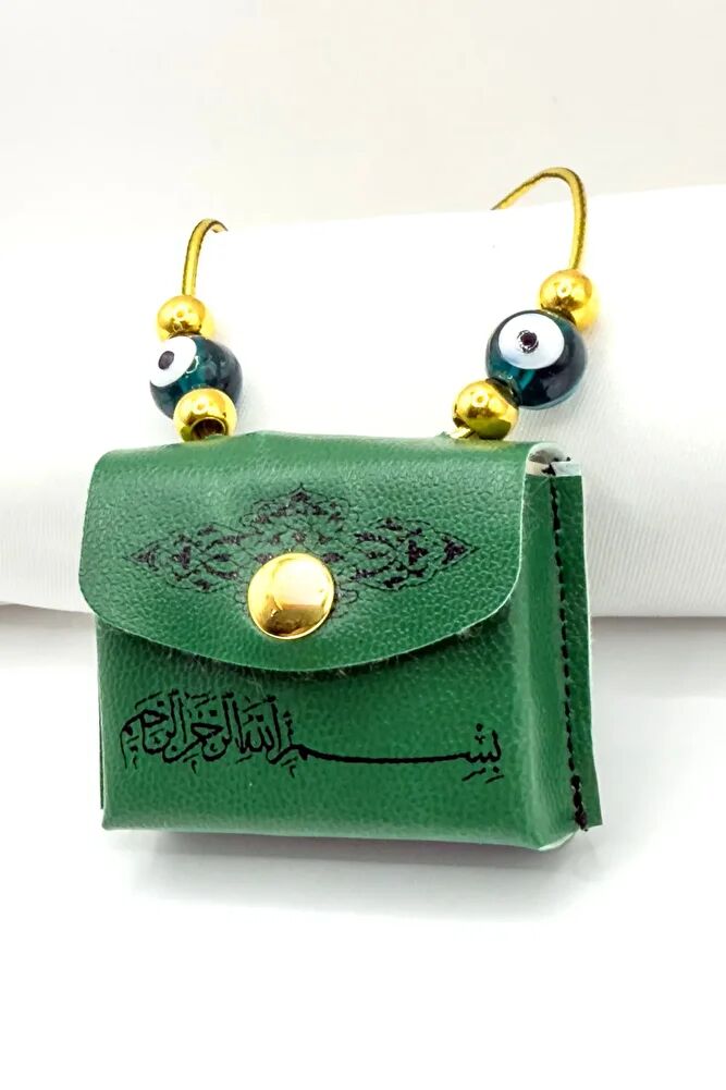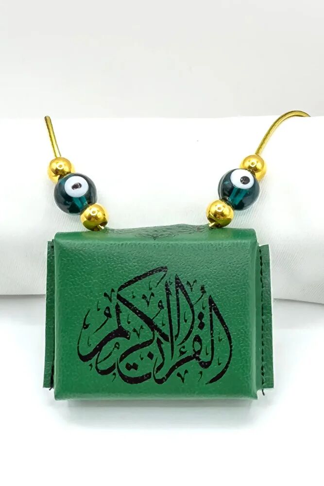 Cam Zümrüt Yeşili Nazarlı Deri Çantalı Mini Kur'an-ı Kerim Lastikli Araba Dikiz Ayna Süsü