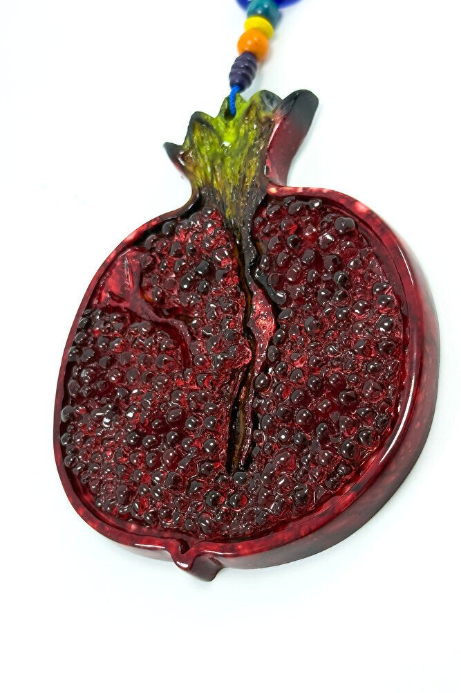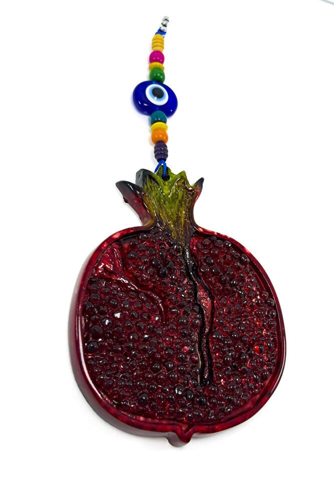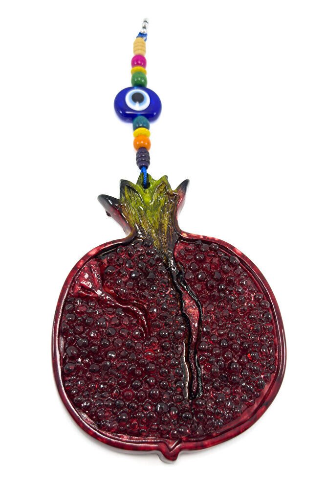 The product is dyed polyester.; Pomegranate is the symbol of abundance.; The entire product measures 26 cm.; The evil eye bead is handmade glass.;