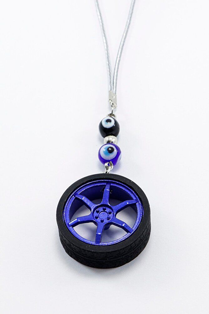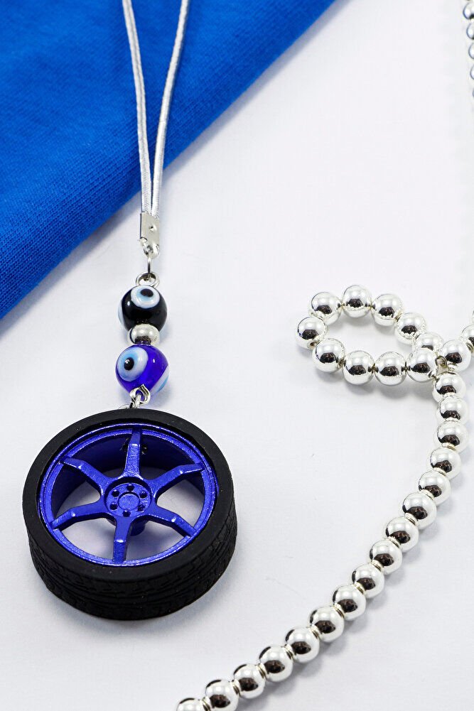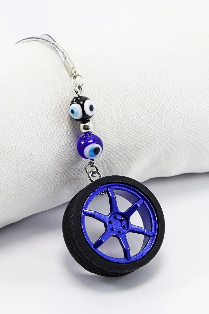 Cam Nazar Boncuklu Lacivert Jantlı Mini Tekerlek Araba Dikiz Ayna Süsü, Yeni Araba Hediyesi