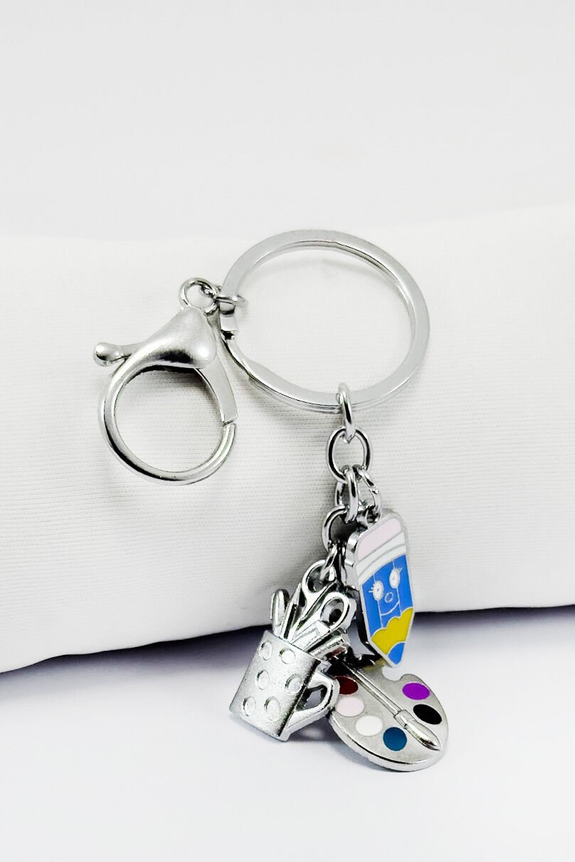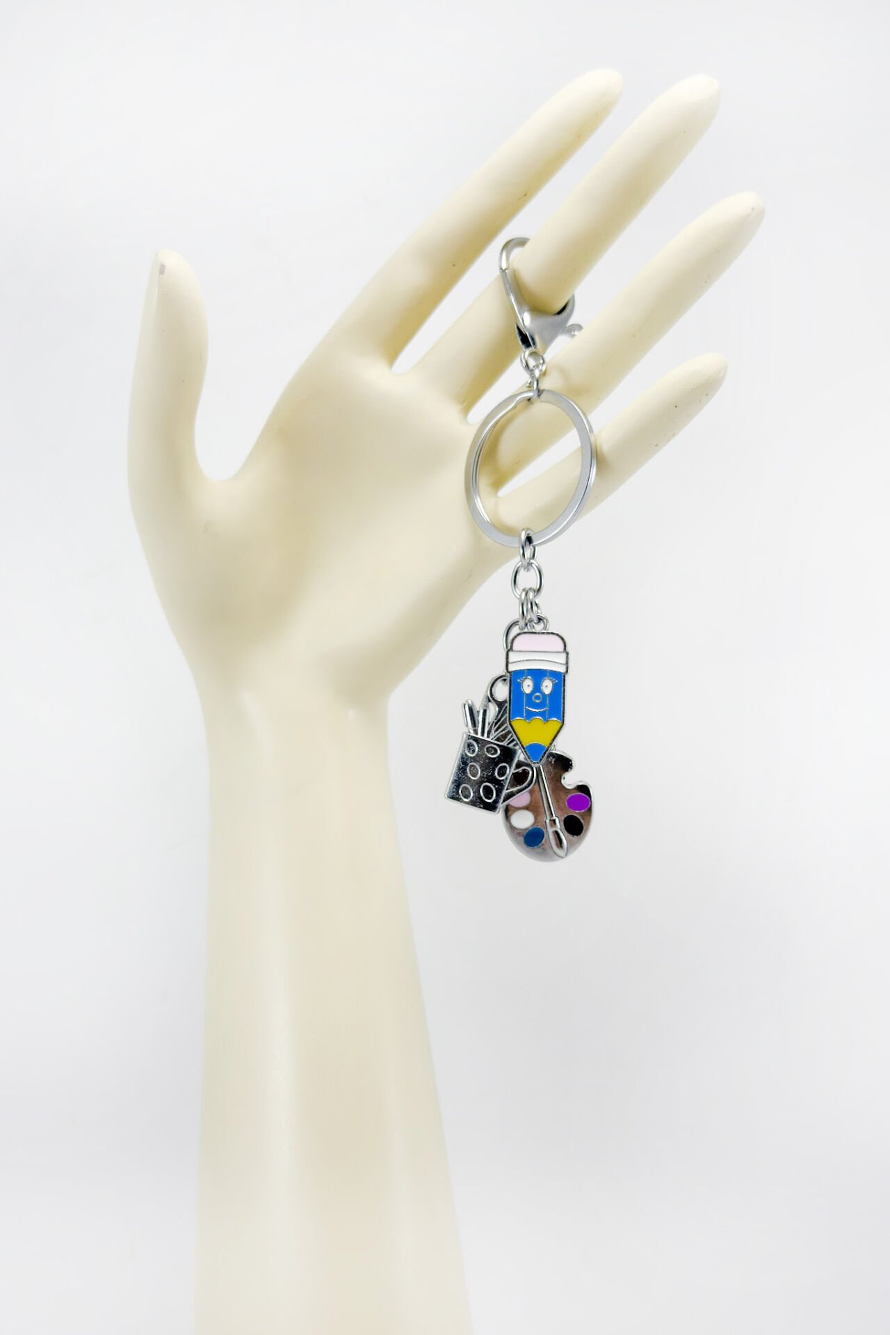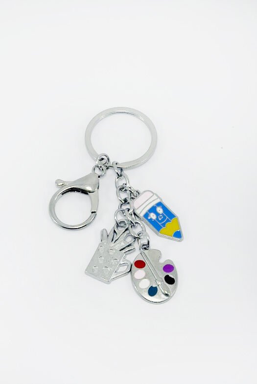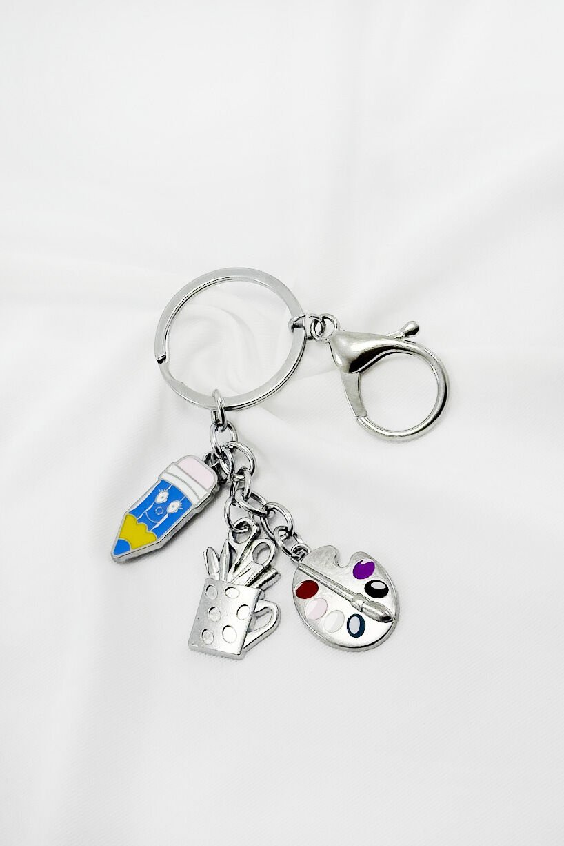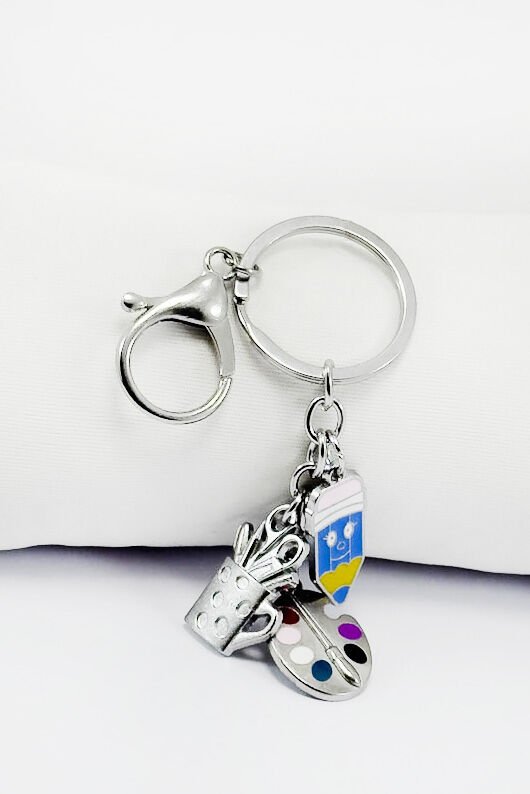 Sanatseverler ve yaratıcı ruhlar için özel olarak tasarlanmış Gümüş Renkli Minyatür Boya Paleti ve Sevimli Kalem Figürlü Anahtarlık, eğlenceli ve anlamlı bir çanta süsü alternatifidir.