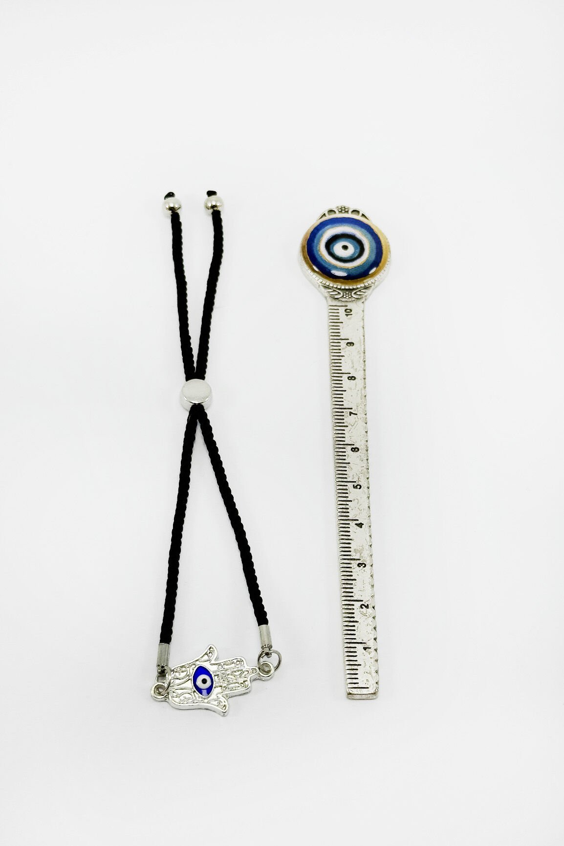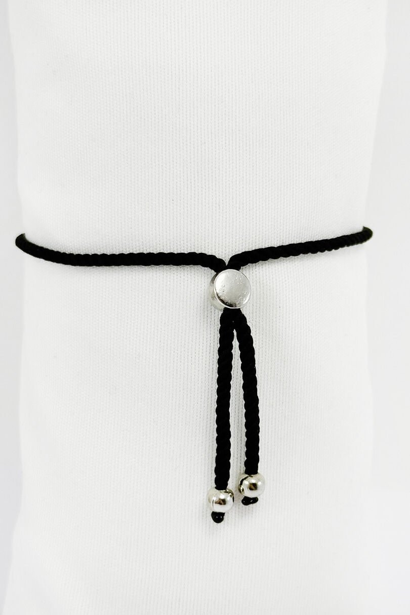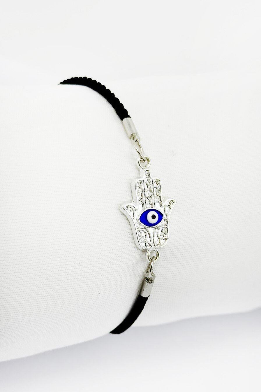 Gümüş renkli nazarlı Hamse eli detayıyla tasarlanmış siyah ipli ayarlanabilir bileklik, hem geleneksel sembolleri hem de modern sadeliği bir araya getirir.