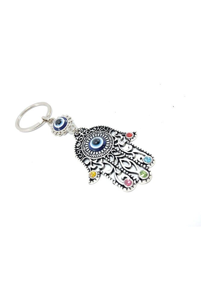 The keychain is metal. ; The color of the shiny stones may vary. ; The evil eye bead is a type of protective object used in Turkish culture and some other Middle Eastern countries. ; It is a small bead, usually designed in blue and white, with a black dot or eye shape inside. The purpose of the evil eye bead is to ward off bad luck, envy, or the evil eye (gaze) and to protect against it. ; Therefore, it can be used in homes, cars, workplaces, jewelry, and even babies' clothing.