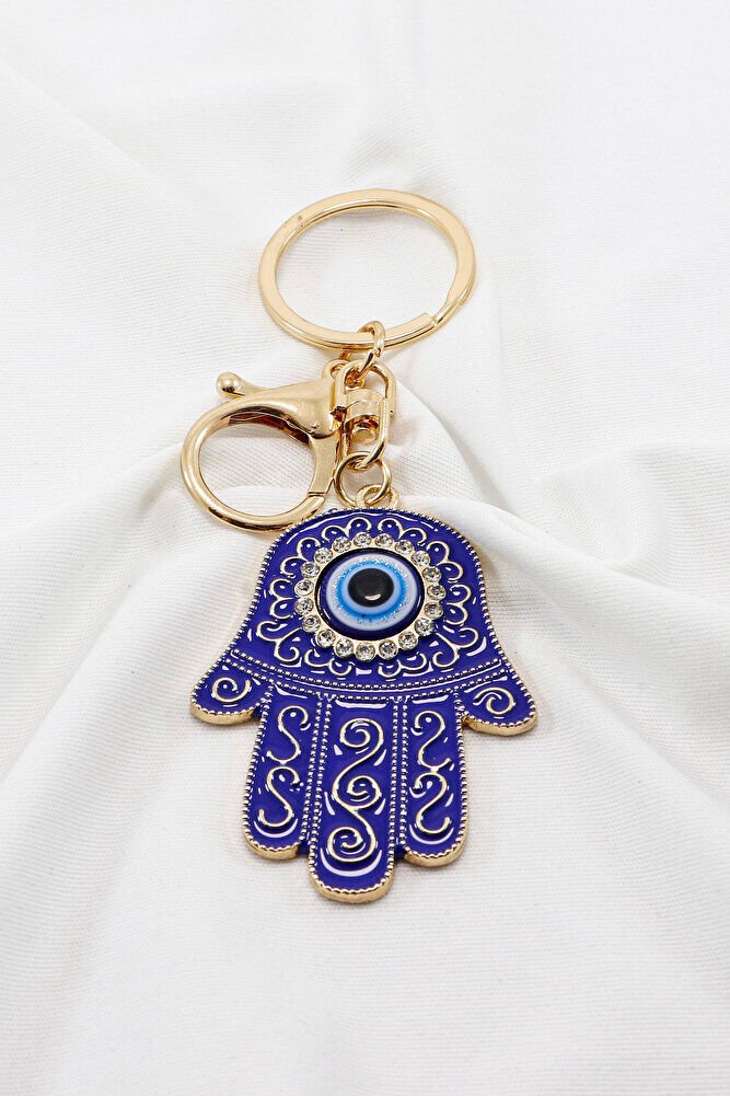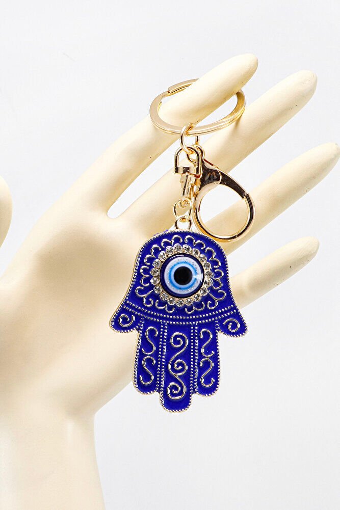 Hamsa Hand Keychain with Dark Blue Pattern and Shiny Stones, Evil Eye Bag Ornament for Gift