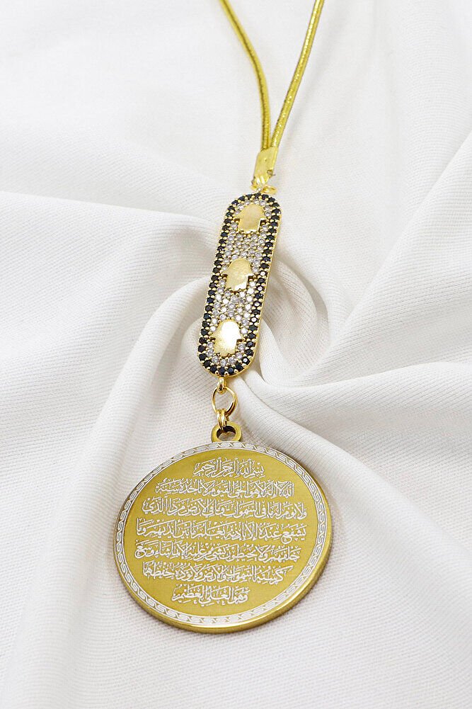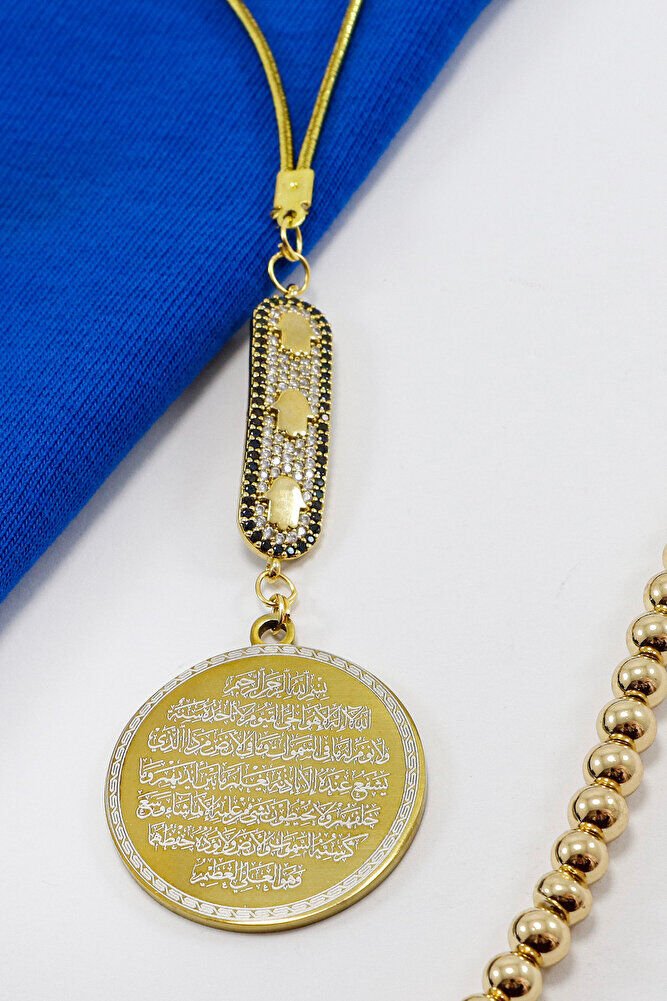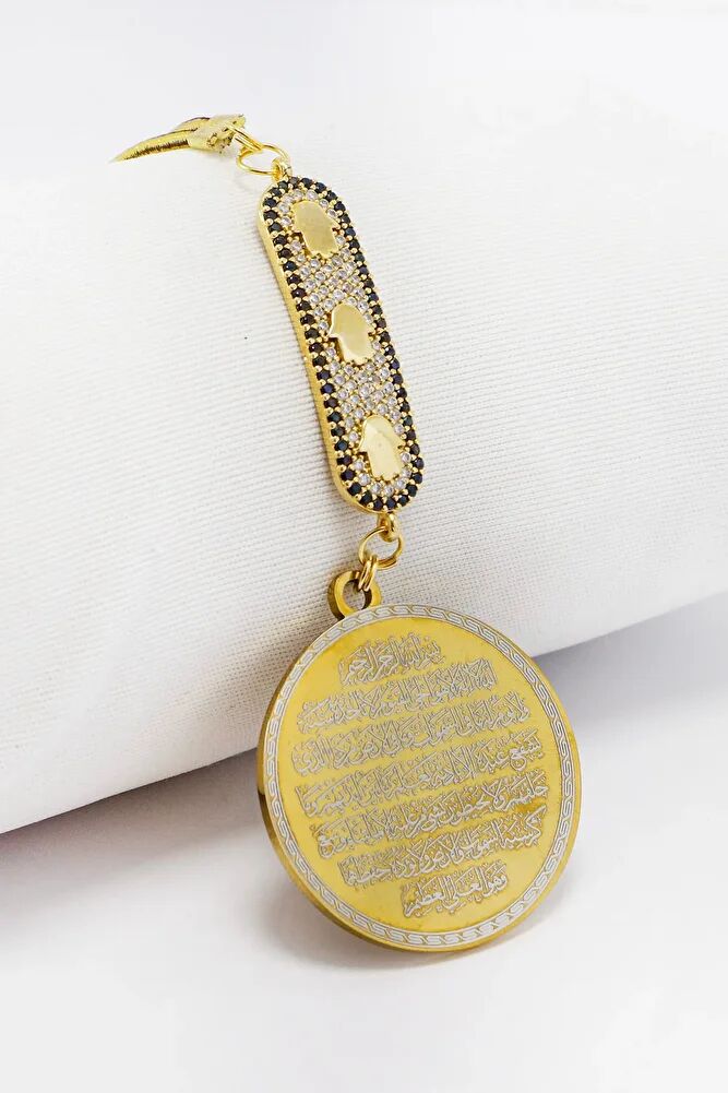 Prayers are permanently engraved with laser engraving technique.; Enameled infinity is metal and single-sided.; The product is handmade and slight differences and irregularities are possible because it is handmade.; The rope is elastic.; Because it is elastic, it can be easily attached to any model.; The plate is gold-colored stainless steel.; The steel plate measures 3.5 cm.; The plate is double-sided.; Ayetel Kursi is written on one side and Falak Nas Ikhlas on the other.; Surahs Falak, Nas and Ikhlas are important prayers that are read for protection and spiritual strength in the Islamic faith.; It is believed that Surahs Falak and Nas are read especially for protection from evil eyes, the evil eye and satanic influences.; While Surah Falak provides protection against dark forces, Surah Nas provides protection from negative thoughts and harmful energies.; Surah Ikhlas expresses the unity and unlimited power of Allah; it is believed that this Surah brings spiritual peace and is under the protection of Allah.; These surahs are frequently recited for those seeking security and peace and are believed to be of great benefit to those seeking to achieve spiritual balance. Ayetel Kursi is considered one of the most powerful and protective prayers in Islam. Ayetel Kursi is a verse that expresses the greatness and sovereignty of Allah and is frequently recited for protection and spiritual strength. This verse emphasizes that everything in the heavens and the earth belongs to Allah and provides protection from evil influences. Reciting it, especially before going to bed at night, is believed to be of great benefit in terms of safety, protection from harmful energies, and spiritual peace. At the same time, it provides spiritual comfort and strength to a person through the belief that Allah knows all things and that everything depends on Him.