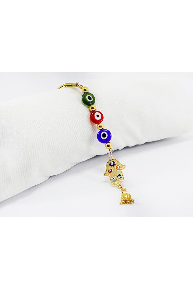 Since the product is handmade, slight differences and irregularities are possible.; Evil eye beads are glass.; Handmade.; ; The Hand of Fatima is an important symbol in Islamic culture.; ; This symbol is attributed to Fatima bint Muhammad, the daughter of the Islamic prophet Muhammad.; ; The Hand of Fatima is a hand sign representing five fingers and having protrusions on both sides starting from the middle of the hand.; ; This symbol is considered a symbol of abundance, healing, protection and luck in the Islamic world.; ; This symbol is also known as a frequently used jewelry and ornamentation element in the Islamic world.; ; The Hand of Fatima symbol is very widely used especially in the Middle East and North African countries and has a very important place in Islamic culture.;