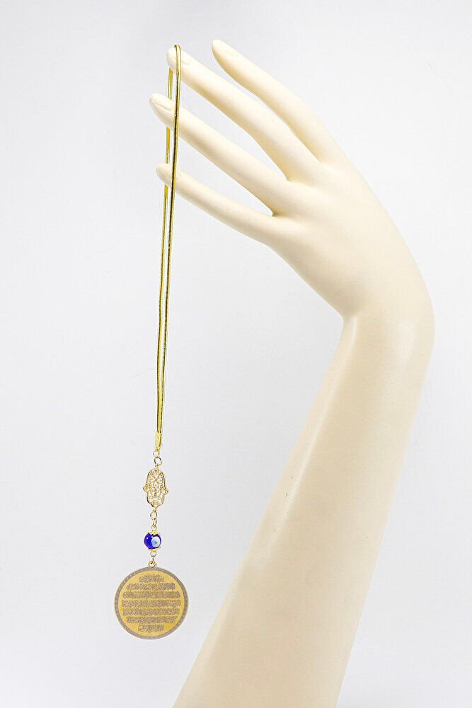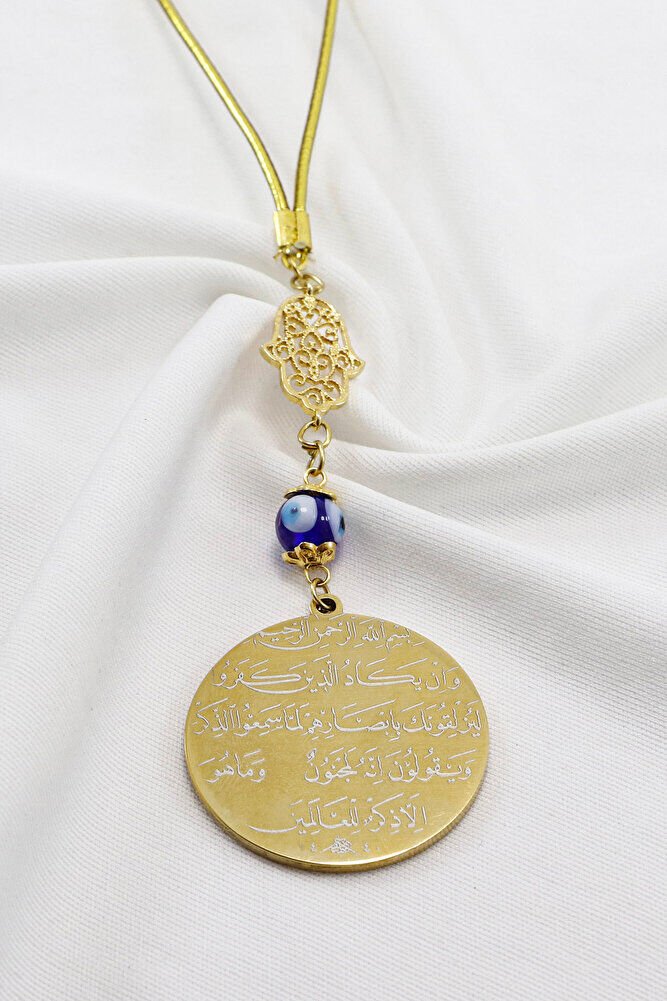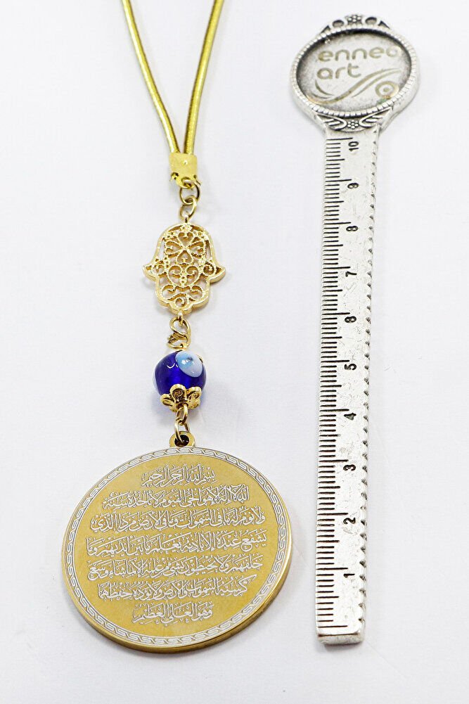 ALL PRODUCT PHOTOGRAPHS ARE THE BELONGINGS OF ENNEA ART AND ARE ORIGINAL WORKS.; UNAUTHORIZED USE, COPYING OR DISTRIBUTION IS STRICTLY PROHIBITED.; LEGAL ACTION WILL BE TAKEN IF NECESSARY.; Prayers are permanently engraved with laser engraving technique.; The Evil Eye Bead is handmade glass and is double-sided.; The product is handmade and since it is handmade, slight differences and irregularities are possible.; The rope is elastic.; Since it is elastic, it can be easily attached to any model.; The plate is gold colored stainless steel.; The steel plate is 3.5 cm in size.; The plate is double-sided.; On one side is Ayetel Kürsi and on the other side is the Evil Eye Verse.; The Evil Eye Verse is a special prayer read in Islamic belief for protection from evil eyes and negative energies.; It is believed that the evil eye, when looked at with malicious intent, can bring negative effects and misfortune to a person's life. The verse against the evil eye protects a person from such negative effects by seeking refuge in God's protection. It also strengthens faith in God's power and divine strength to prevent the evil eye from harming a person. This prayer is believed to provide mental peace and spiritual strength, so it is frequently recited in homes, workplaces, or on personal belongings.