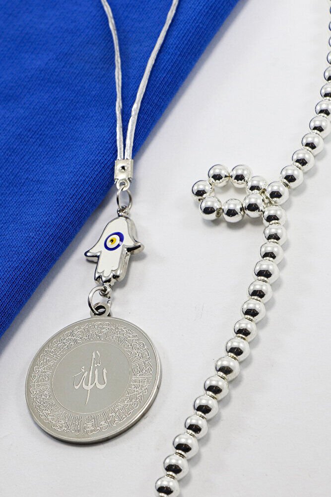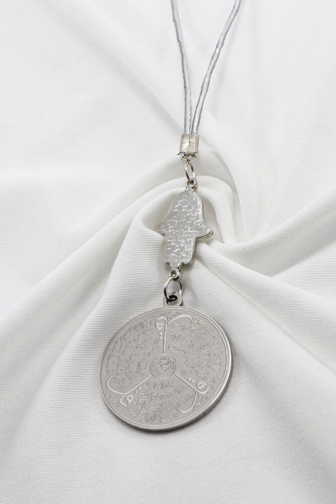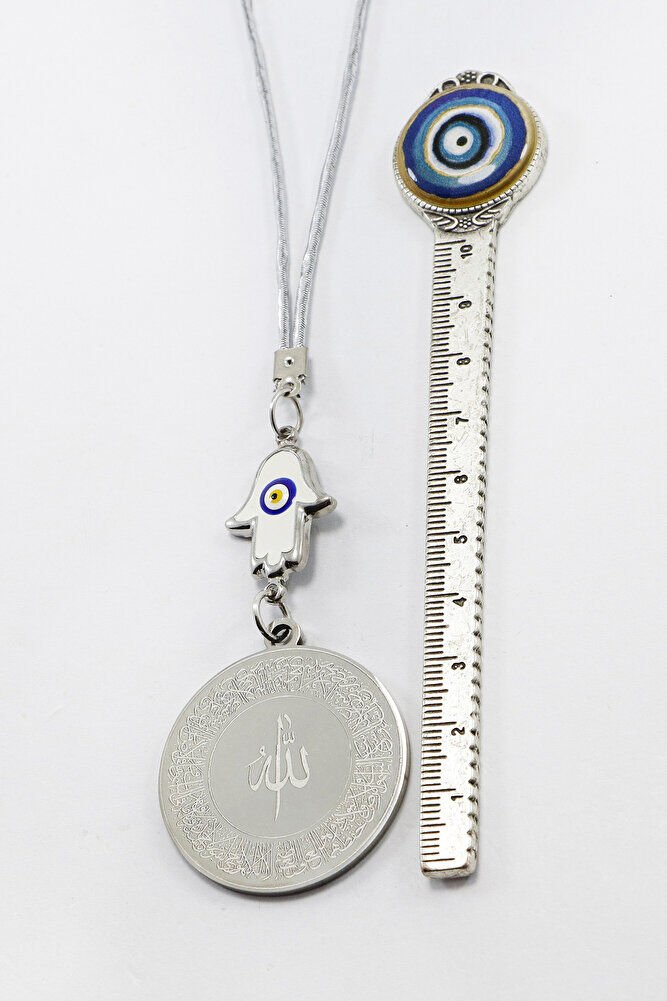 Beyaz Hamse eli aksesuarlı bu özel tasarım dikiz ayna süsü, gümüş renkte paslanmaz çelikten üretilmiş çift taraflı bir plakaya sahiptir.; Plakanın ön yüzünde Allah lafzı ve Ayetel Kürsi duası, arka yüzünde ise Felak, Nas ve İhlas sureleri yer almaktadır.; Ayetel Kürsi; korunma, huzur ve güven için tercih edilirken, Felak-Nas-İhlas sureleri ise nazardan, kötü enerjilerden ve manevi zararlardan korunmak amacıyla taşınır.; Üzerindeki Hamse eli, nazara karşı koruyucu bir sembol olarak bilinir ve beyaz rengiyle zarif bir görünüm sunar.; Lastikli ipi sayesinde her tip dikiz aynasına kolayca takılabilir.; Manevi anlamı yüksek bu süs, hem aracınız için anlamlı bir aksesuar hem de sevdiklerinize verilebilecek güzel bir hediye alternatifidir.; TÜM ÜRÜN FOTOĞRAFLARI ENNEA ART FİRMASINA AİTTİR VE ÖZGÜN ÇALIŞMALARDIR.; İZİNSİZ KULLANIM, KOPYALAMA VEYA DAĞITIM KESİNLİKLE YASAKTIR.; GEREKLİ DURUMLARDA YASAL İŞLEM BAŞLATILACAKTIR.