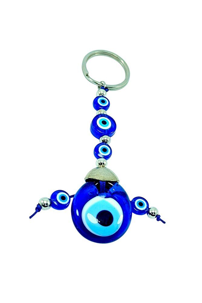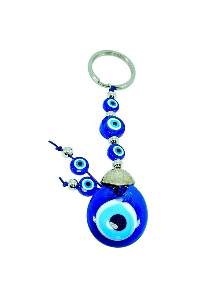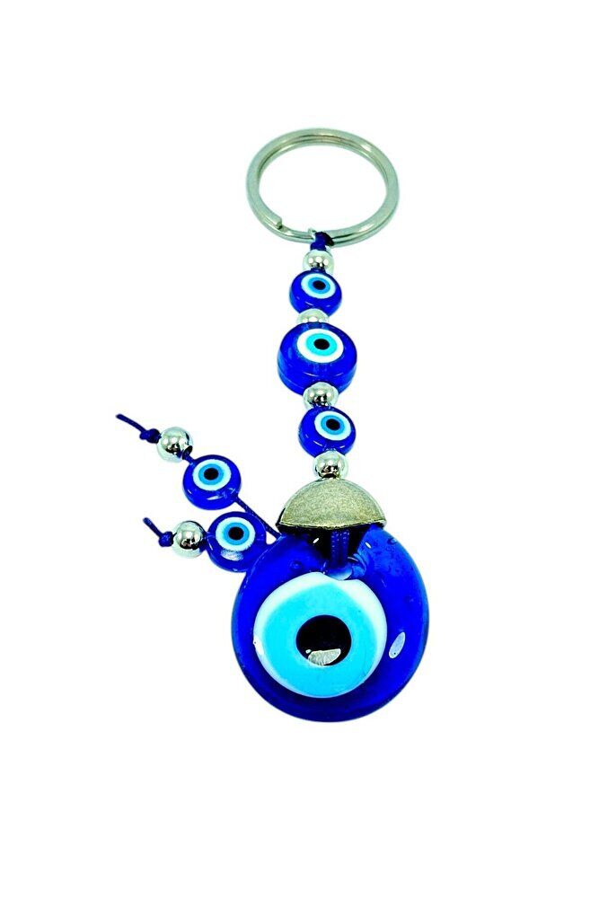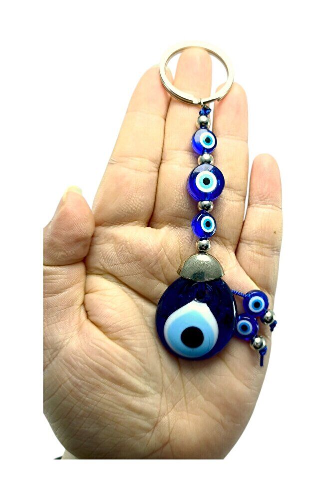 The product is handmade. Because it is handmade, slight differences and irregularities are possible.; ; The large evil eye bead in the middle is handmade glass.; The other smaller ones are plastic.; ; The product size is 9.5 cm.; ; The evil eye bead is a traditional symbol used among the people for protection against evil eyes and carries belief and power in various cultures.; It is believed that the evil eye bead protects the person from negative energies and evil looks.; It is believed that evil eyes can be effective especially on beautiful, successful or notable people, and the evil eye bead protects the owner by reflecting this energy.; In most cultures, the evil eye bead is believed to bring luck and happiness, and to provide peace and balance to the person by keeping negative influences away.; For this reason, it is frequently used in homes, workplaces or on personal items.