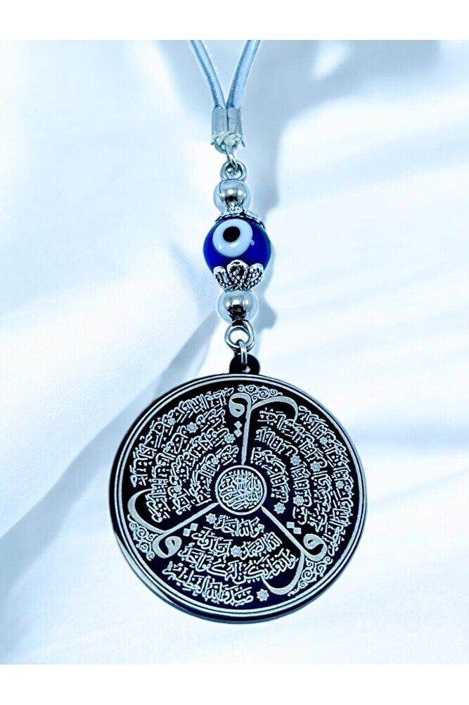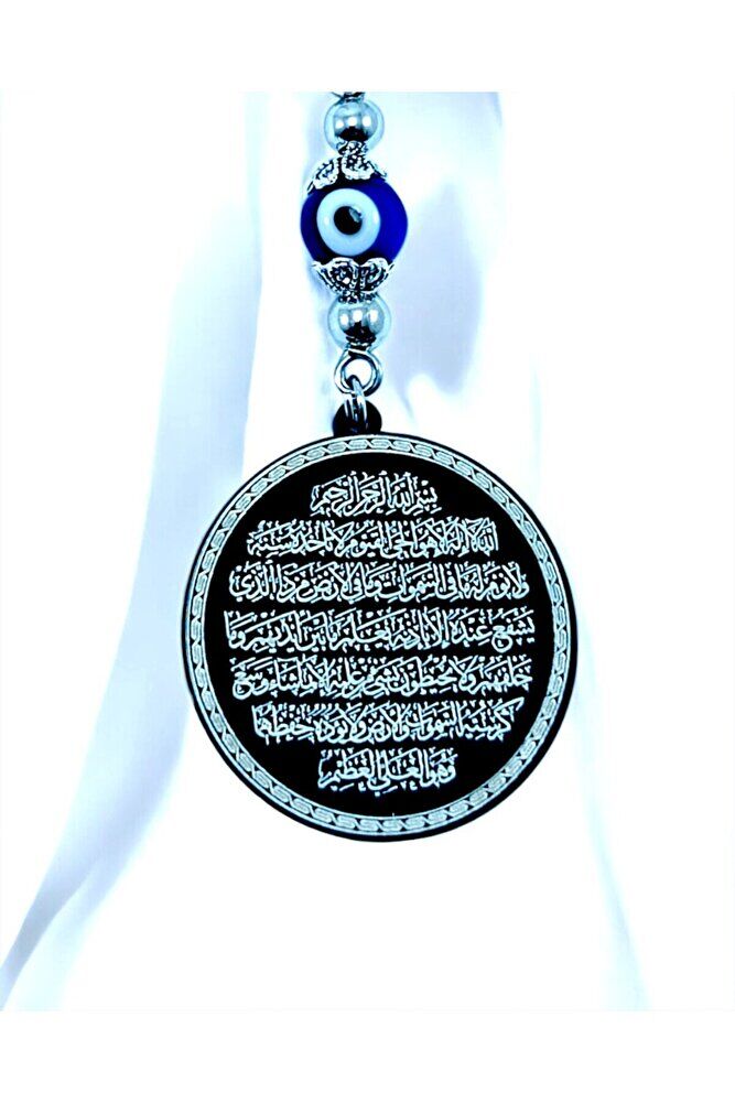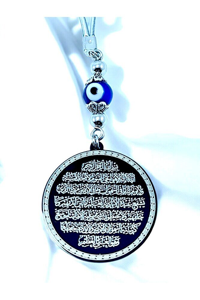 Prayers are permanently engraved with laser engraving technique.; ; The glass evil eye bead is handmade.; ; The product is handmade and slight differences and irregularities are possible because it is handmade.; ; The rope is elastic.; Because it is elastic, it can be easily attached to any model.; ; The plate is black stainless steel.; Black reflection is used to make the prayers clearly visible, which is why the silver product appears black in the image.; ; The steel plate is 3.5 cm in size.; ; The plate is double-sided.; Ayetel Kürsi is written on one side and Falak Nas Ikhlas is written on the other side.; ; Surahs Falak, Nas and Ikhlas are important prayers that are read for protection and spiritual strength in the Islamic faith.; It is believed that Surahs Falak and Nas are read especially for protection from the evil eye, the evil eye and satanic influences.; Surah Falak provides protection against dark forces, while Surah Nas provides protection from negative thoughts and harmful energies.; Surah Ikhlas, on the other hand, expresses God's unity and limitless power, and it is believed that this surah brings spiritual peace and protection to a person under God's protection. These surahs are frequently recited by those seeking security and peace, and are believed to be of great benefit to those seeking spiritual balance.