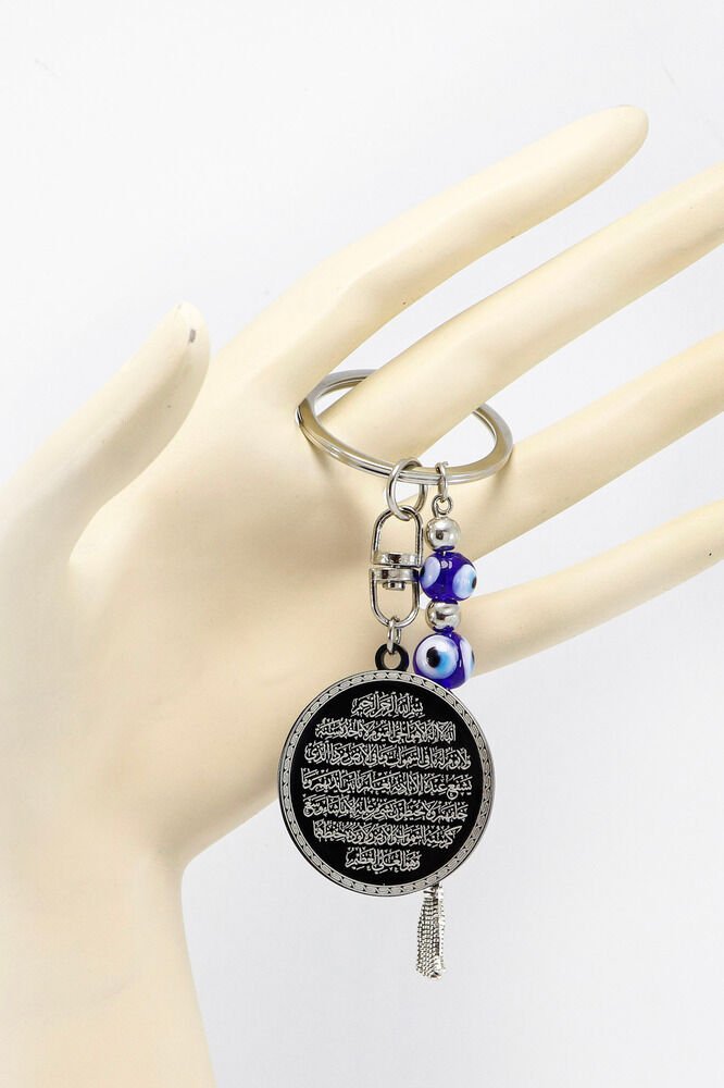 ALL PRODUCT PHOTOGRAPHS ARE THE BELONGINGS OF ENNEA ART AND ARE ORIGINAL WORKS.; UNAUTHORIZED USE, COPYING OR DISTRIBUTION IS STRICTLY PROHIBITED.; LEGAL ACTION WILL BE TAKEN WHEN NECESSARY The prayers are permanently engraved with laser engraving technique.; Evil eye beads are handmade glass.; The product is handmade and slight differences and irregularities are possible because it is handmade.; The plate is black stainless steel.; The steel plate is 3.5 cm in size.; The plate is double-sided.; On one side is Ayetel Kursi and Al-Falaq Nas Ihlas on the other side.; Ayetel Kursi is the 255th verse of Surah Al-Baqara and has a very important place in the Islamic belief.; This verse emphasizes the power, sovereignty of Allah and that He is the Supreme Being who knows everything and owns everything.; The verse indicates that Allah is above all things and that no power can act without His permission.; Another important aspect that is considered credible is that it is believed that this verse will protect a person from evil and provide peace and security.; Muslims frequently recite Ayatul Kursi and use it for protection, prayer, and seeking peace in various situations.; Therefore, it carries both spiritual and protective meaning.; Surahs al-Falaq, an-Nas, and al-Ikhlas are important prayers recited in Islam to provide protection and spiritual strength.; It is believed that Surahs al-Falaq and an-Nas are recited specifically for protection from the evil eye, the evil eye, and satanic influences.; While Surah al-Falaq provides protection against dark forces, Surah an-Nas provides protection from negative thoughts and harmful energies.; Surah al-Ikhlas expresses the oneness and unlimited power of Allah, and it is believed that this surah brings spiritual peace and is under the protection of Allah.; These surahs are frequently recited by those seeking security and peace, and are believed to be of great benefit to those who wish to achieve spiritual balance.