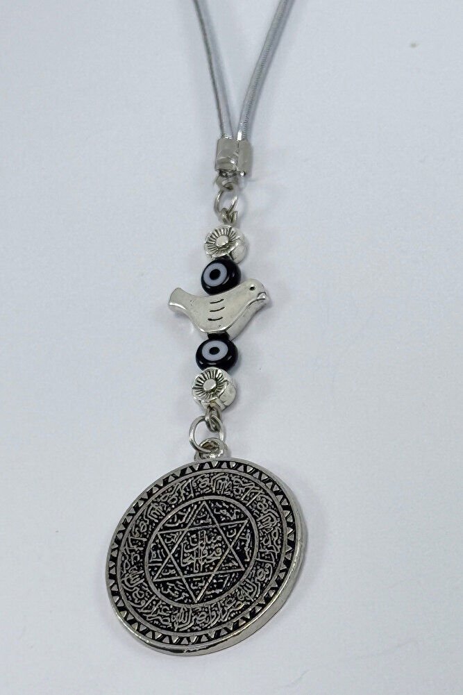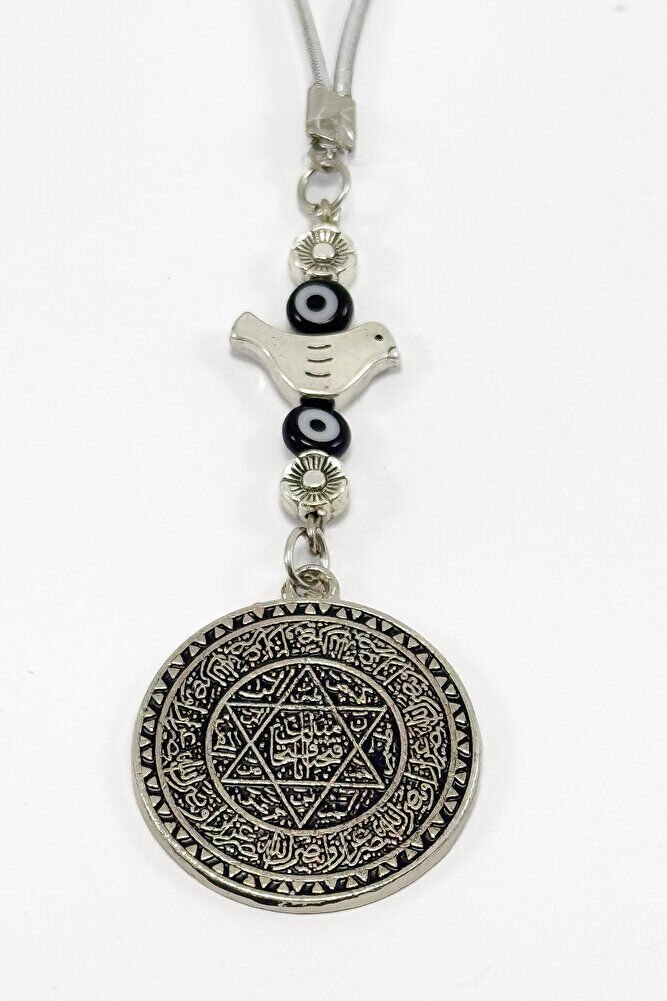 The product is handmade.; There are minor differences and changes because it is handmade.; The rope is elastic.; Since it is elastic, it can be easily installed on any model vehicle.; The product is metal.; It is single-sided.; The small black evil eye beads are handmade glass and are double-sided.; ,The antique bird and flowers are metal and are double-sided.; The prayer written on the product is for Hz.; Talisman Seal of Solomon It is believed that the spiritual power of the person who carries the Seal of Solomon increases and opens the doors of sustenance, luck, fortune and fortune.;