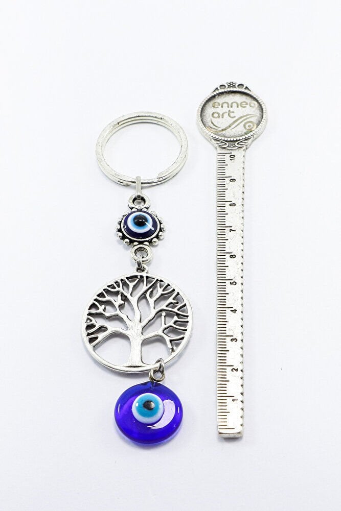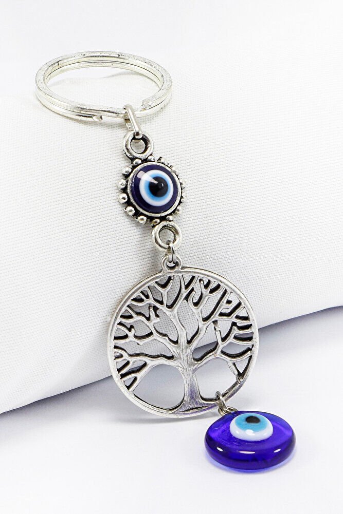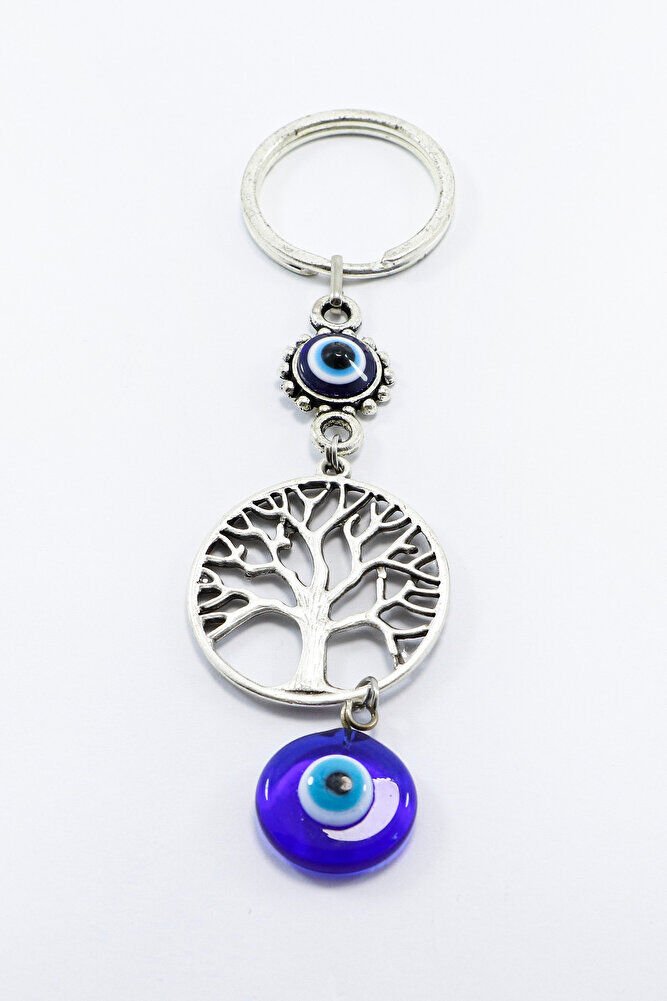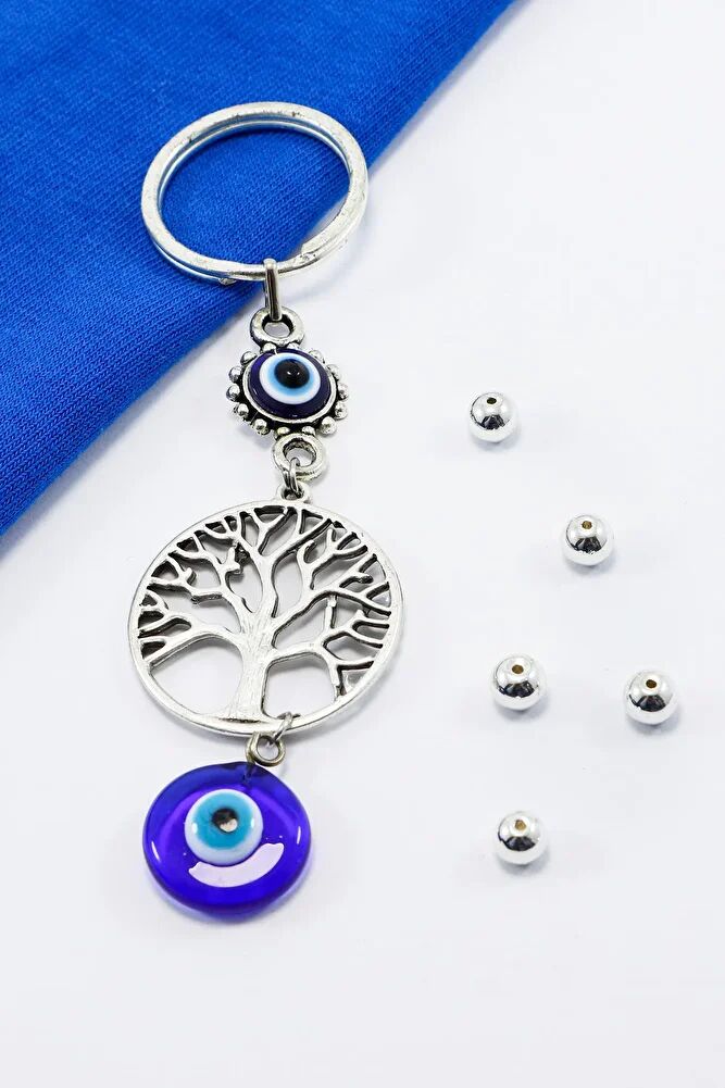 El Yapımı Cam Nazar Boncuklu Metal Hayat Ağacı Anahtarlık, Hediyelik Nazarlı Çanta Süsü