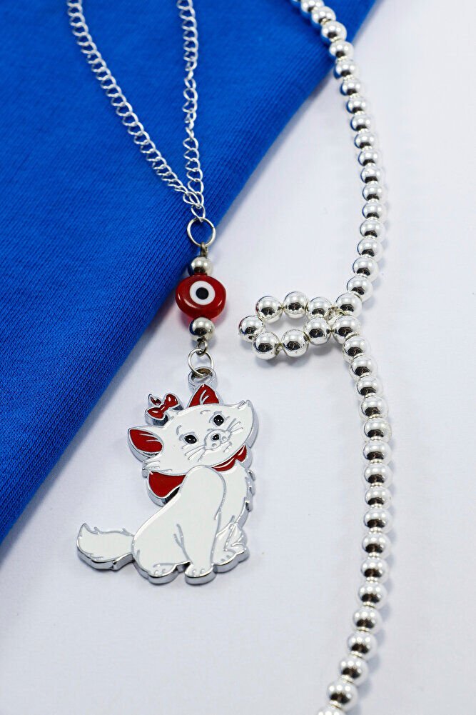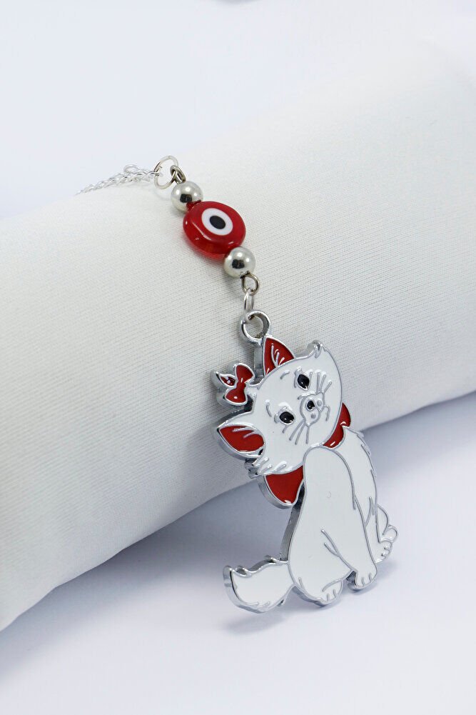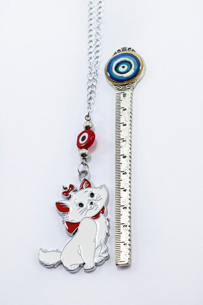 Kırmızı Yassı Nazar Boncuğu Metal Beyaz Kediciki Araba Süsü, Dikiz Ayna Süsü