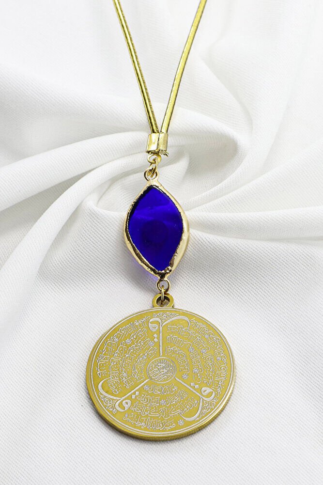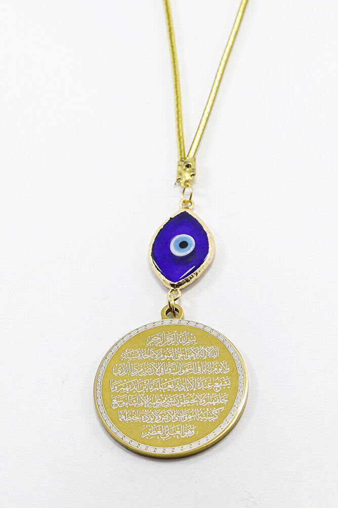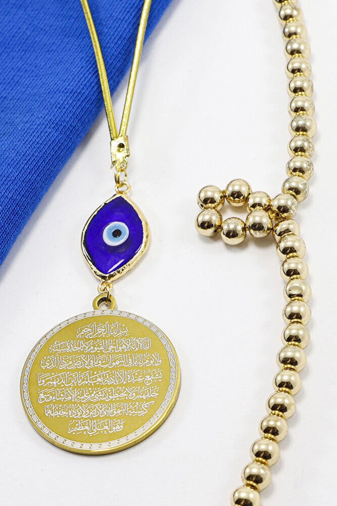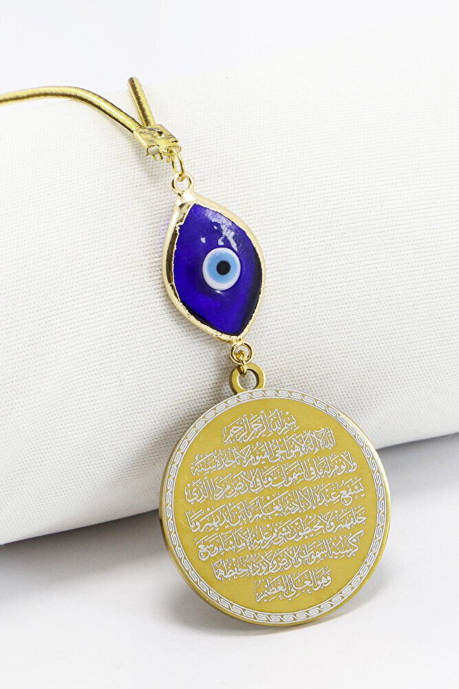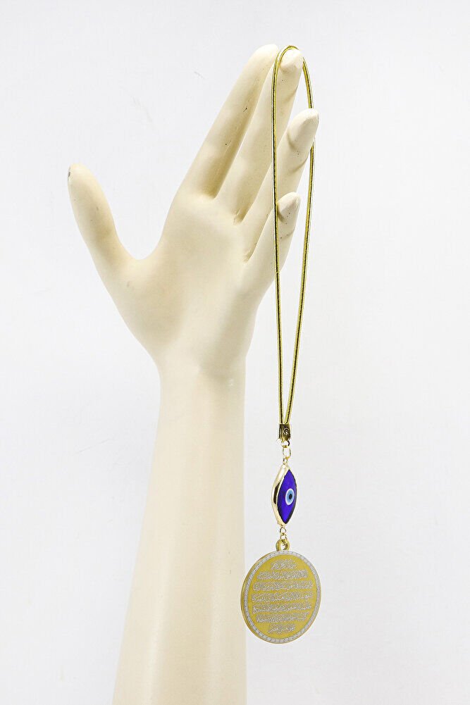 Lacivert nazar boncuğu detayına sahip bu özel dikiz ayna süsü, gold renkli paslanmaz çelikten üretilmiş ve 3,5 cm ölçülerinde yuvarlak çerçeveli plakaya sahiptir.; Plakanın her iki yüzünde lazer kazıma tekniğiyle Ayetel Kürsi, Felak, Nas ve İhlas sureleri yer almaktadır.; Şık tasarımı sayesinde araç içi dekorasyonunu tamamlar ve manevi bir anlam taşır.; Lastikli yapısıyla tüm araç modellerine kolayca uyum sağlar.; Hem yeni araçlar için anlamlı bir hediye hem de nazardan korunma niyetiyle tercih edilen zarif bir aksesuardır.; TÜM ÜRÜN FOTOĞRAFLARI BİUTİ FİRMASINA AİTTİR VE ÖZGÜN ÇALIŞMALARDIR.; İZİNSİZ KULLANIM, KOPYALAMA VEYA DAĞITIM KESİNLİKLE YASAKTIR.; GEREKLİ DURUMLARDA YASAL İŞLEM BAŞLATILACAKTIR.