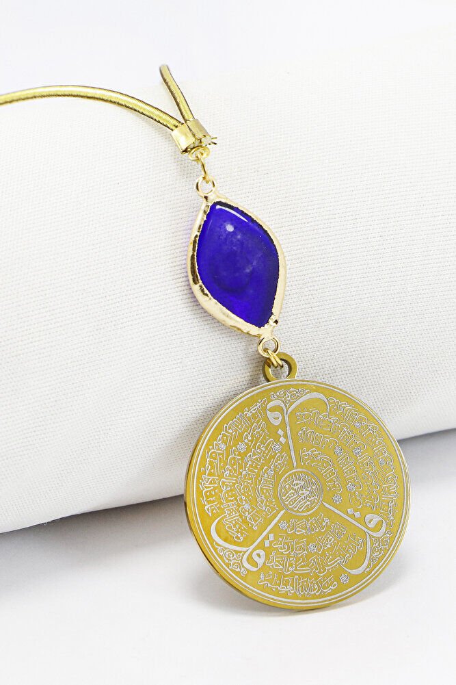 Lacivert Nazarlı Gold Çelik Çerçeveli Ayetel Kürsi Felak Nas İhlas Dikiz Ayna Süsü (3,5)
