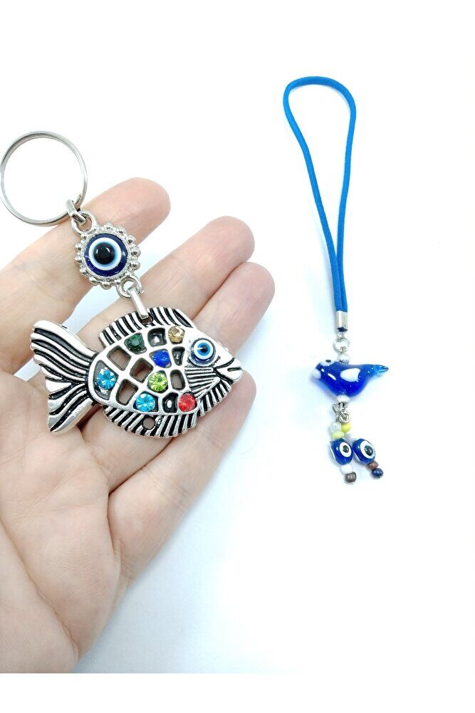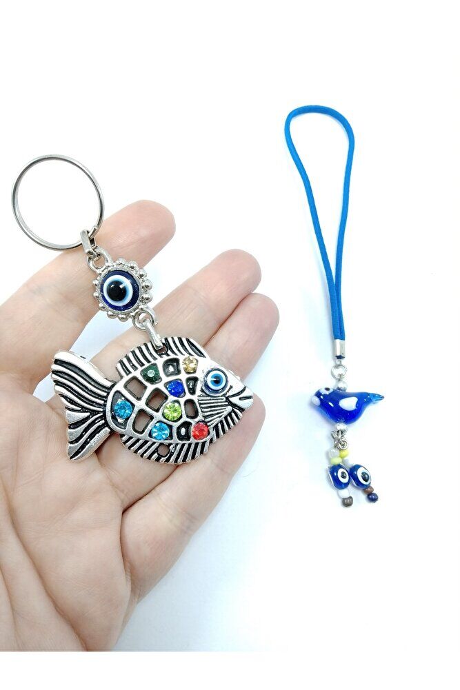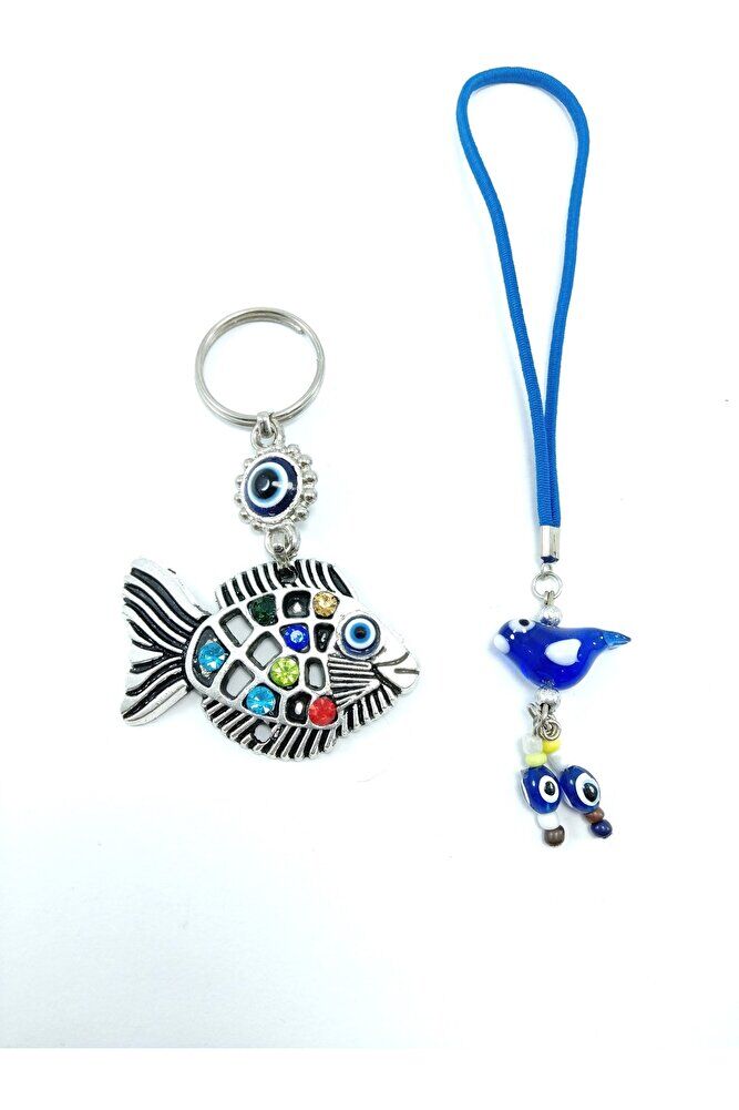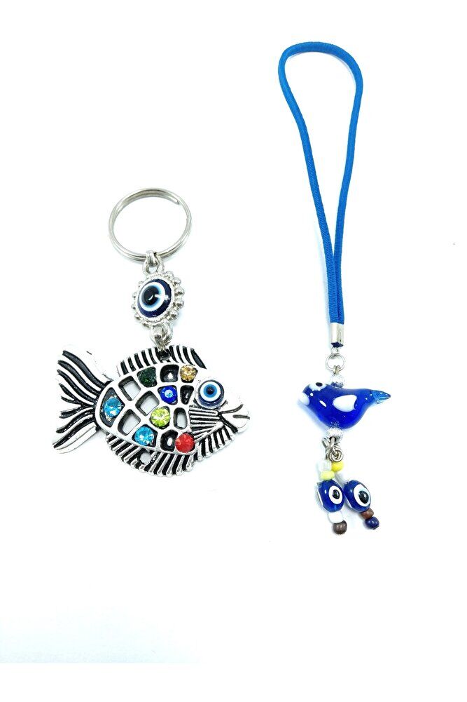 Nazar Boncuğu Balıklı Anahtarlık + Kuş Araba Dikiz Ayna Süsü Cam El Yapımı Dekoratif Hediyelik Set