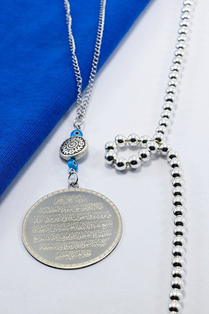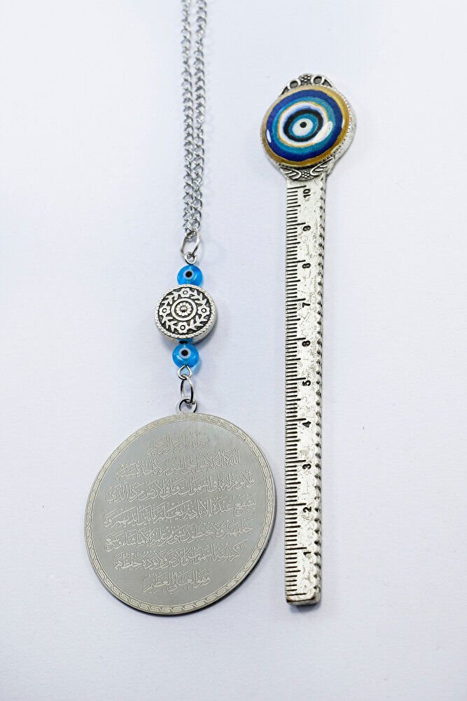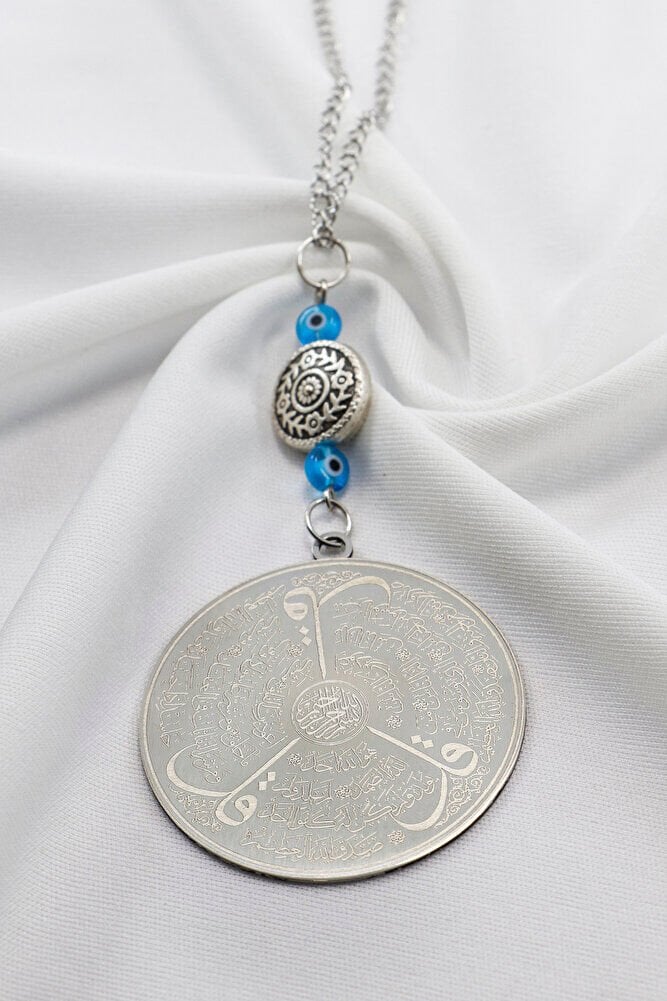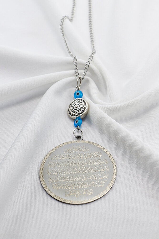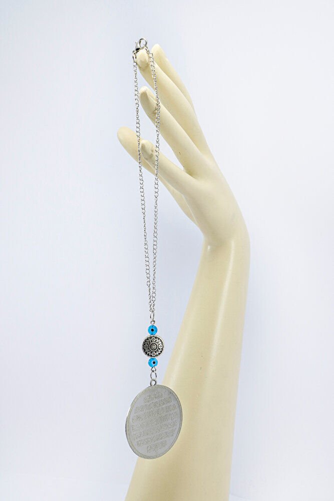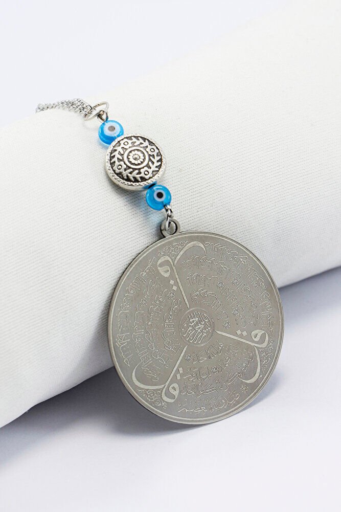 Dualar lazer kazıma tekniği ile kalıcı bir şekilde kazınmaktadır.; Otantik boncuk çift taraflıdır.; Ayetel Kürsi yazılı yüzünde bulunmaktadır.; Nazar boncukları el yapımı camdır.; El yapımı oldukları için ufak farklılık ve düzensizlikler olasıdır.; Zincir çeliktir.; Ayarlanabilir olduğu için her modele rahatlıkla takılabilmektedir.; Plaka gümüş renkli, fırçalı, paslanmaz çeliktir.; Yerili üretimdir.; Çelik plaka 4,5 cm ölçülerindedir.; Plaka çift taraflıdır.; Ayetel Kürsi, İslam inancında en güçlü ve koruyucu dualardan biri olarak kabul edilir.; Ayetel Kürsi, Allah’ın büyüklüğünü ve egemenliğini ifade eden bir ayet olup, koruma ve manevi güç sağlamak amacıyla sıkça okunur.; Bu ayet, göklerde ve yerin her şeyinin Allah’a ait olduğunu vurgular ve şeytani etkilerden korunma sağlar.; Özellikle gece yatmadan önce okunmasının, güvende olma, zararlı enerjilerden korunma ve ruhsal huzur sağlama açısından büyük fayda verdiğine inanılır.; Aynı zamanda, Allah’ın her şeyi bildiği ve her şeyin O’na bağlı olduğu inancı ile kişiye manevi rahatlık ve güç verir.; Felak, Nas ve İhlas sureleri, İslam inancında korunma ve manevi güç sağlamak için okunan önemli dualardır.; Felak ve Nas sureleri, özellikle kötü gözlerden, nazardan ve şeytani etkilerden korunmak için okunur.; Felak suresi, karanlık güçlere karşı koruma sağlarken, Nas suresi de olumsuz düşünceler ve zararlı enerjilerden korunmayı sağladığına inanılır.; İhlas suresi ise, Allah’ın birliğini ve sınırsız gücünü ifade eder, bu sureye inanılır ki, kişi manevi huzur ve Allah’ın koruması altında olur.; Bu sureler, sıkça güven ve huzur arayışında olanlar için okunur ve ruhsal dengeyi sağlamak isteyenlere büyük fayda sağladığına inanılır.;