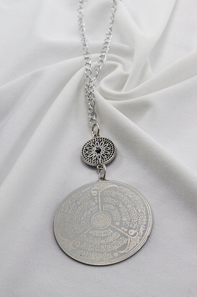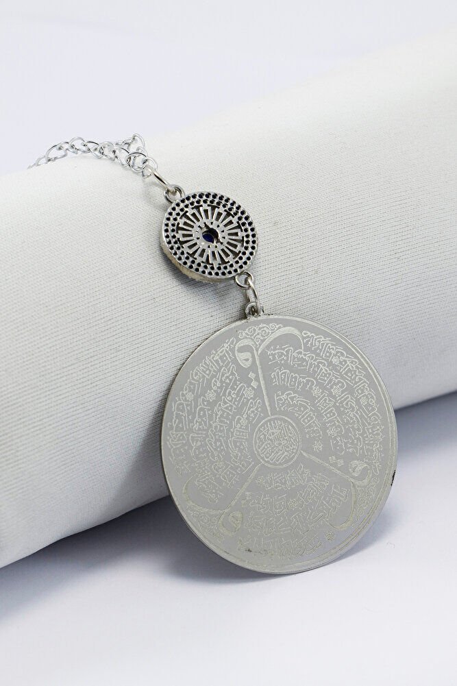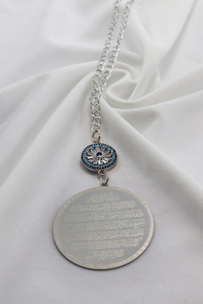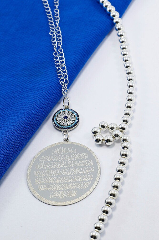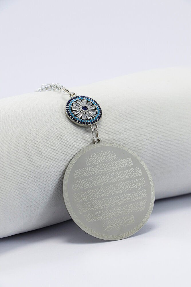 Dualar lazer kazıma tekniği ile kalıcı bir şekilde kazınmaktadır.; Parlak taşlı nazar boncuğu tek taraflıdır.; Ayetel Kürsi yazılı yüzünde bulunmaktadır.; Ürün el yapımıdır el yapımı olduğu için ufak farklılık ve düzensizlikler olasıdır.; Zincir metaldir.; Ayarlanabilir olduğu için her modele rahatlıkla takılabilmektedir.; Plaka gümüş renkli paslanmaz çeliktir.; Çelik plaka 4,5 cm ölçülerindedir.; Plaka çift taraflıdır.; yeşil akik taşı, birçok kültürde ve inanç sisteminde enerjiyi dengelediğine, cesaret verdiğine ve kişiyi negatif enerjilerden koruduğuna inanılan değerli bir taştır.; Özellikle stres ve gerginlik karşısında sakinleştirici etkileriyle bilinir ve kabul edilir.; Kök çakra ile ilişkilendirilen bu taşın, fiziksel dayanıklılığı artırdığı, kararlılığı desteklediği ve özgüveni yükselttiği düşünülür.; Ayrıca, eski zamanlardan beri nazara karşı koruyucu olarak taşındığı ve kişinin manevi gücünü pekiştirdiğine inanıldığı yaygın bir görüştür.; Gerek aksesuar olarak gerekse tılsım niyetine kullanılan kırmızı akik, ruhsal denge ve güven arayanlar için tercih edilen bir taş olmuştur.; Bir yüzünde Ayetel Kürsi diğer yüzünde ise Felak Nas İhlas bulunmaktadır.; Ayetel Kürsi, İslam inancında en güçlü ve koruyucu dualardan biri olarak kabul edilir.; Ayetel Kürsi, Allah’ın büyüklüğünü ve egemenliğini ifade eden bir ayet olup, koruma ve manevi güç sağlamak amacıyla sıkça okunur.; Bu ayet, göklerde ve yerin her şeyinin Allah’a ait olduğunu vurgular ve şeytani etkilerden korunma sağlar.; Özellikle gece yatmadan önce okunmasının, güvende olma, zararlı enerjilerden korunma ve ruhsal huzur sağlama açısından büyük fayda verdiğine inanılır.; Aynı zamanda, Allah’ın her şeyi bildiği ve her şeyin O’na bağlı olduğu inancı ile kişiye manevi rahatlık ve güç verir.; Felak, Nas ve İhlas sureleri, İslam inancında korunma ve manevi güç sağlamak için okunan önemli dualardır.; Felak ve Nas sureleri, özellikle kötü gözlerden, nazardan ve şeytani etkilerden korunmak için okunur.; Felak suresi, karanlık güçlere karşı koruma sağlarken, Nas suresi de olumsuz düşünceler ve zararlı enerjilerden korunmayı sağladığına inanılır.; İhlas suresi ise, Allah’ın birliğini ve sınırsız gücünü ifade eder, bu sureye inanılır ki, kişi manevi huzur ve Allah’ın koruması altında olur.; Bu sureler, sıkça güven ve huzur arayışında olanlar için okunur ve ruhsal dengeyi sağlamak isteyenlere büyük fayda sağladığına inanılır.;