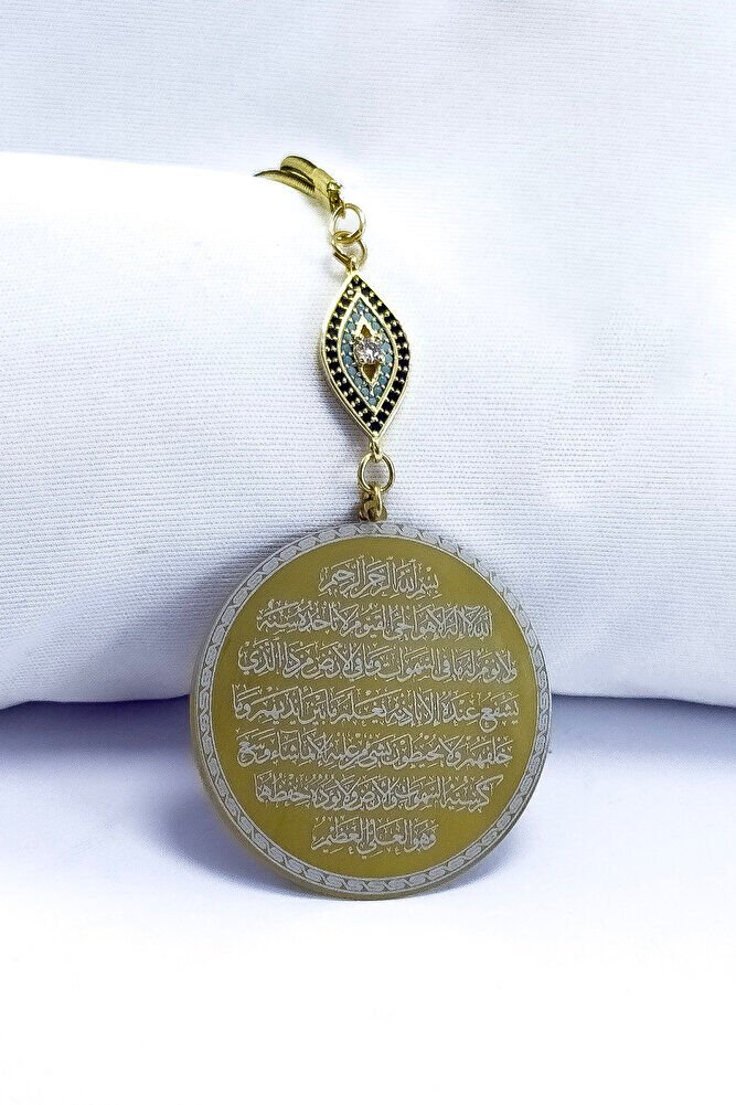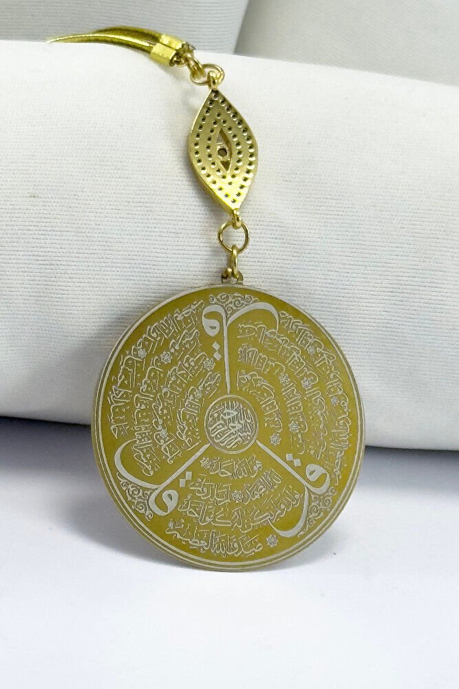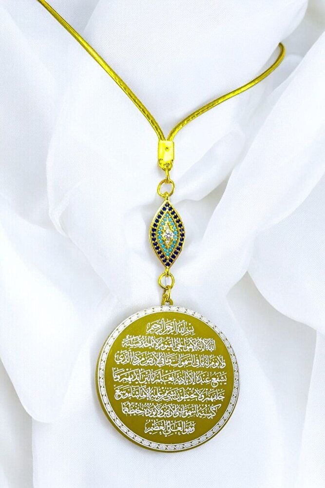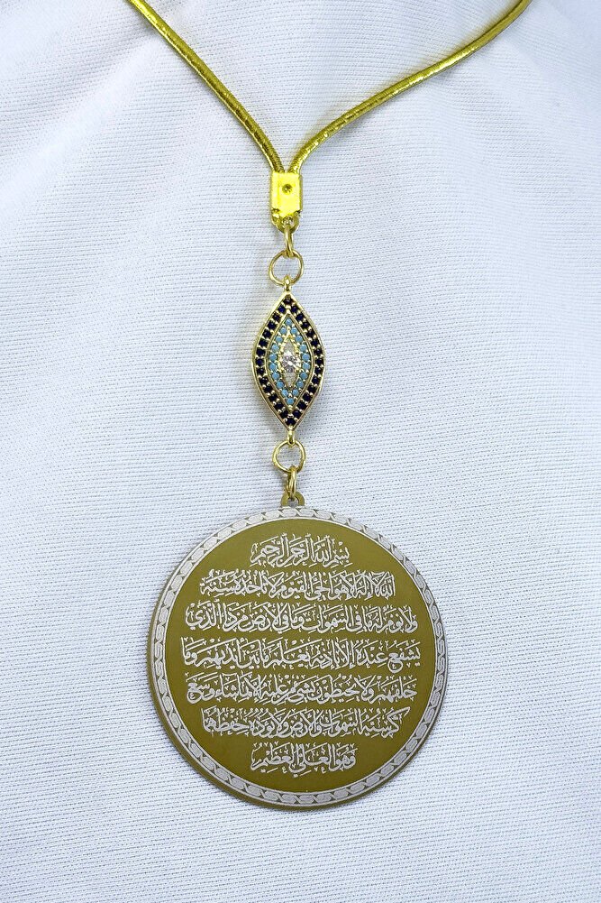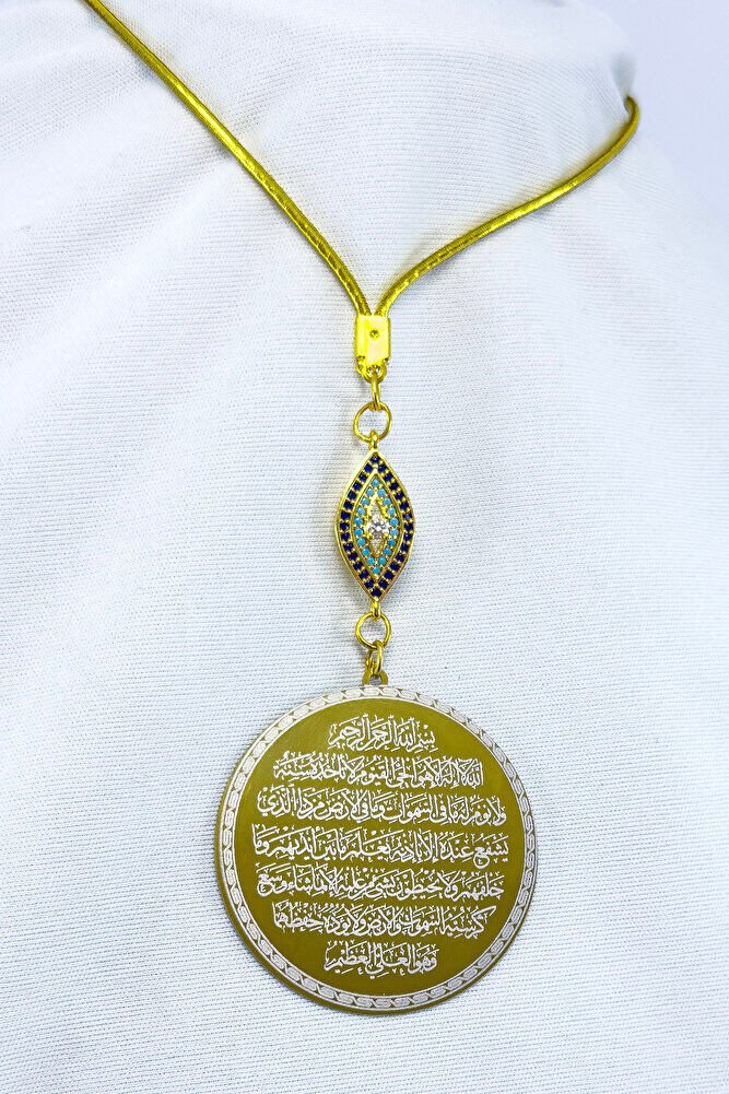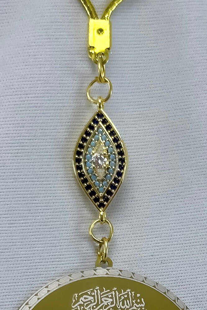 Dualar lazer kazıma tekniği ile kalıcı bir şekilde kazınmaktadır.; parlak taşlızirkon nazar tek taraflıdır.; Ayetel Kürsi yazılı yüzünde bulunmakatdır.; Ayetel Kürsi yazılı tarafında bulunmaktadır.; Ürün el yapımıdır el yapımı olduğu için ufak farklılık ve düzensizlikler olasıdır.; İp elastiktir.; Elastik olduğu için her modele rahatlıkla takılabilmektedir.; Plaka altın renkli paslanmaz çeliktir.; Bağlantı materyelleri dayanıklı altın kaplamadır.; Çelik plaka 3,5 cm ölçülerindedir.; Plaka çift taraflıdır.; Bir yüzünde Ayetel Kürsi diğer yüzünde ise Felak Nas İhlas bulunmaktadır.; Felak, Nas ve İhlas sureleri, İslam inancında korunma ve manevi güç sağlamak için okunan önemli dualardır.; İnanılır kabul edilir ki, Felak ve Nas sureleri, özellikle kötü gözlerden, nazardan ve şeytani etkilerden korunmak için okunur.; Felak suresi, karanlık güçlere karşı koruma sağlarken, Nas suresi de olumsuz düşünceler ve zararlı enerjilerden korunmayı sağlar.; İhlas suresi ise, Allah ın birliğini ve sınırsız gücünü ifade eder, bu sureye inanılır ki, kişi manevi huzur ve Allah ın koruması altında olur.; Bu sureler, sıkça güven ve huzur arayışında olanlar için okunur ve ruhsal dengeyi sağlamak isteyenlere büyük fayda sağladığına inanılır.; Ayetel Kürsi, İslam inancında en güçlü ve koruyucu dualardan biri olarak kabul edilir.; Ayetel Kürsi, Allah ın büyüklüğünü ve egemenliğini ifade eden bir ayet olup, koruma ve manevi güç sağlamak amacıyla sıkça okunur.; Bu ayet, göklerde ve yerin her şeyinin Allah a ait olduğunu vurgular ve şeytani etkilerden korunma sağlar.; Özellikle gece yatmadan önce okunmasının, güvende olma, zararlı enerjilerden korunma ve ruhsal huzur sağlama açısından büyük fayda verdiğine inanılır.; Aynı zamanda, Allah ın her şeyi bildiği ve her şeyin O na bağlı olduğu inancı ile kişiye manevi rahatlık ve güç verir.;