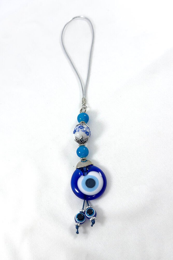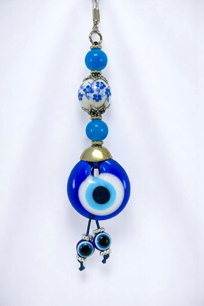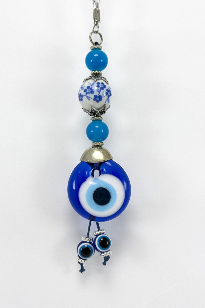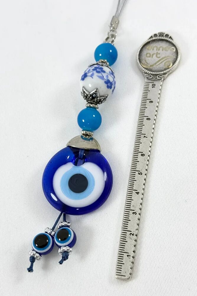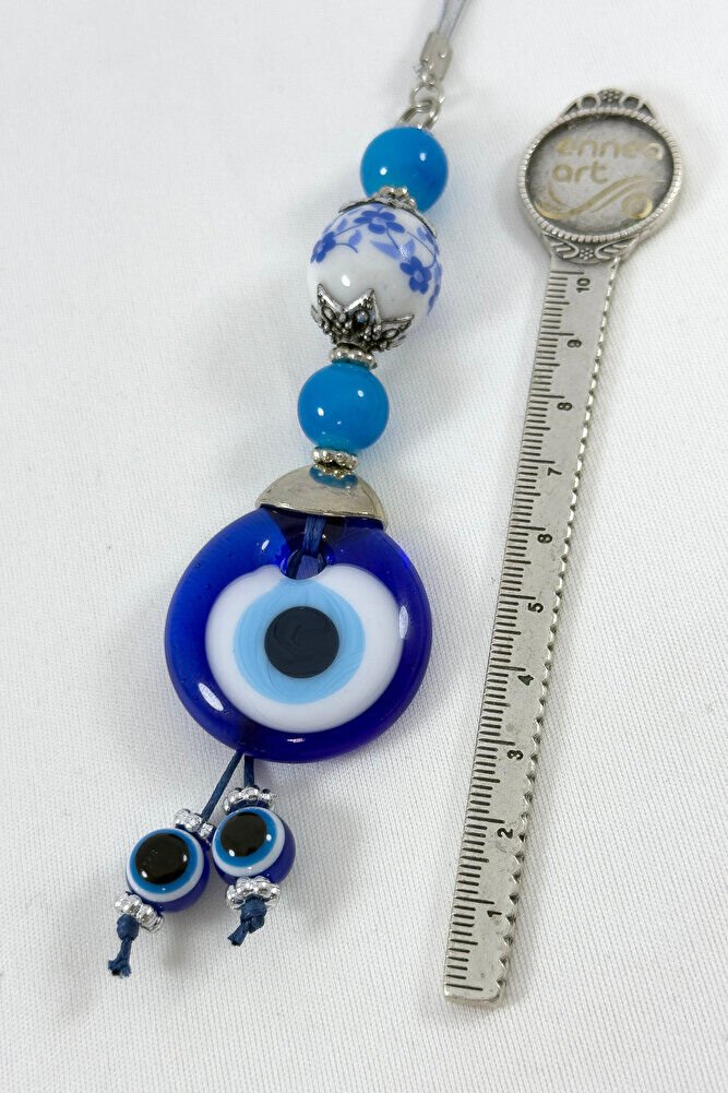 The product is handmade.; Since it is handmade, slight differences and irregularities are possible.; The string is elastic.; Since it is elastic, it can be easily installed on any model of vehicle.; The patterned bead is ceramic and double-sided.; The evil eye beads in the cluster are plastic.; The turquoise beads are glass.; The evil eye bead in the middle is handmade glass and measures 3.5 cm.; The structured version of the product measures 12.5 cm excluding the elastic string.;