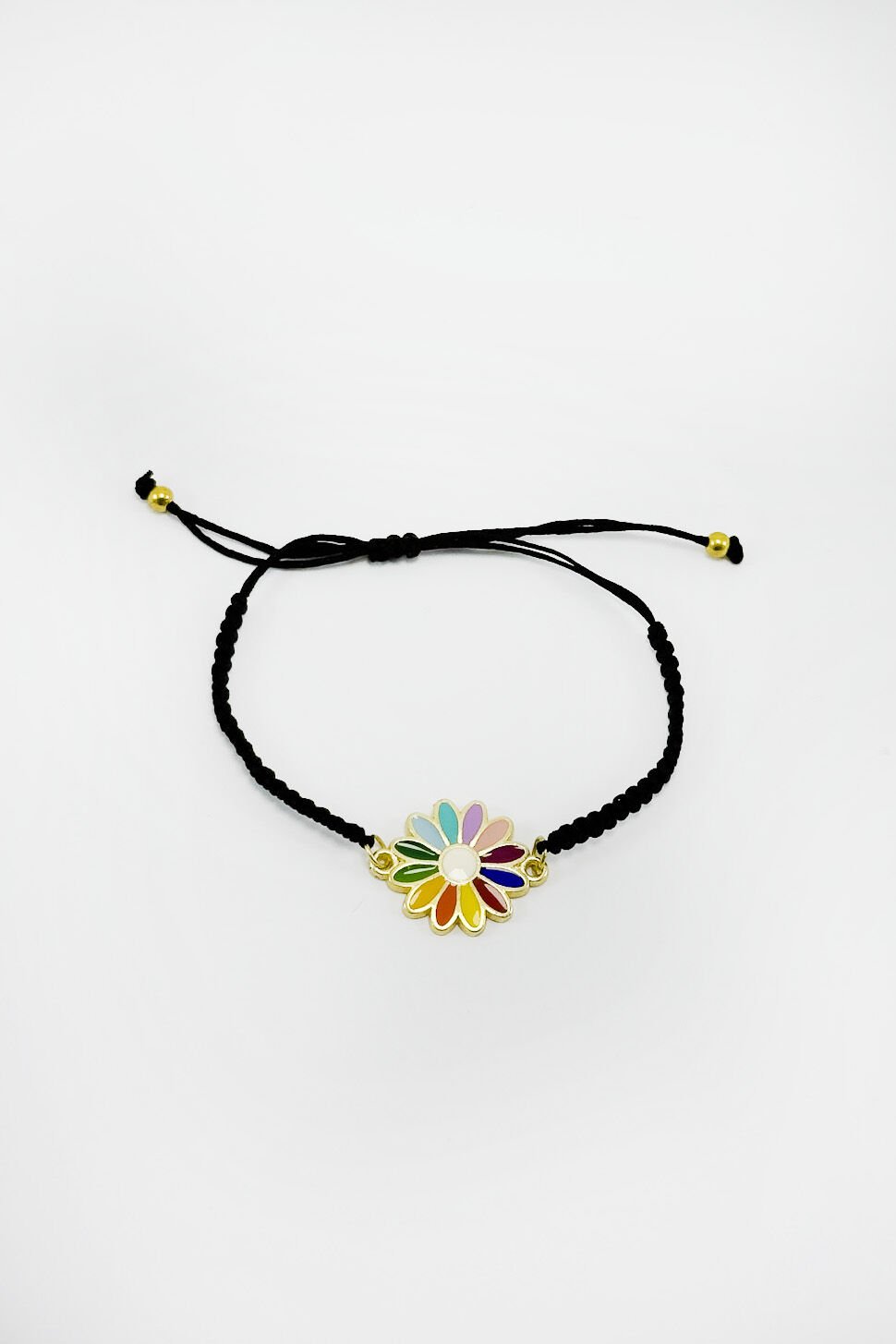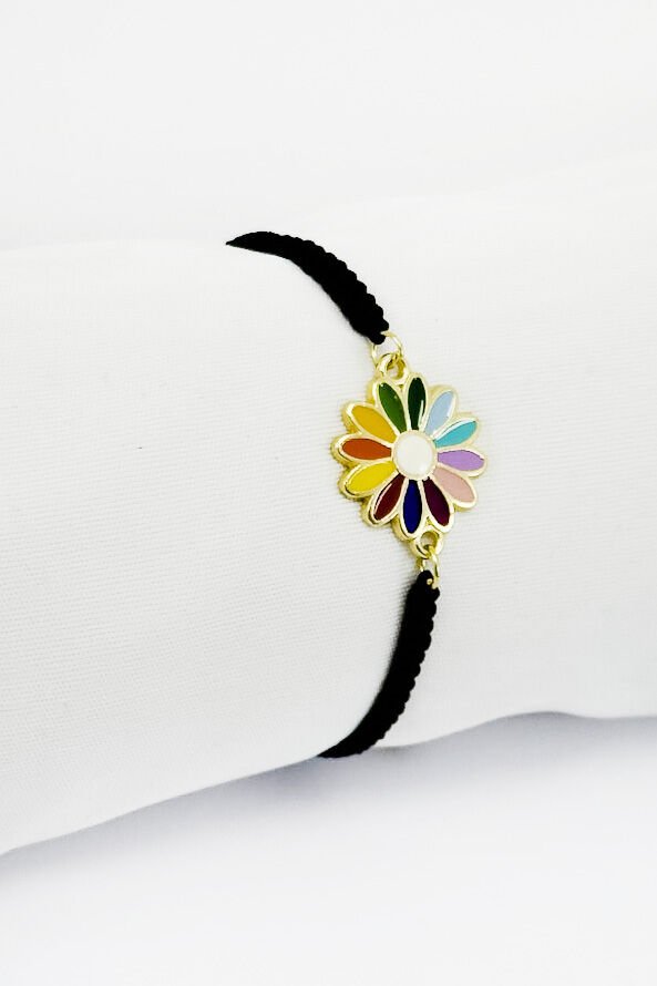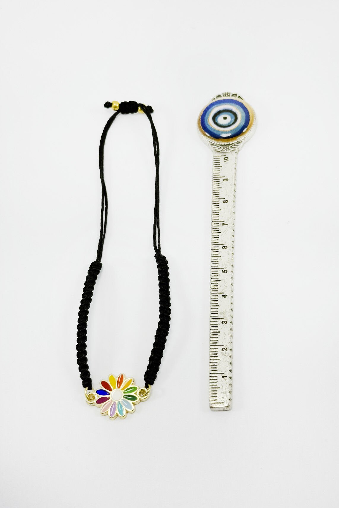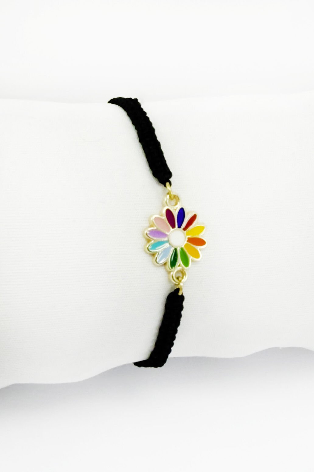 Renkli papatya detaylarıyla süslenmiş siyah ipli asansörlü ayarlanabilir bileklik, neşeli ve enerjik tasarımıyla dikkat çeker.