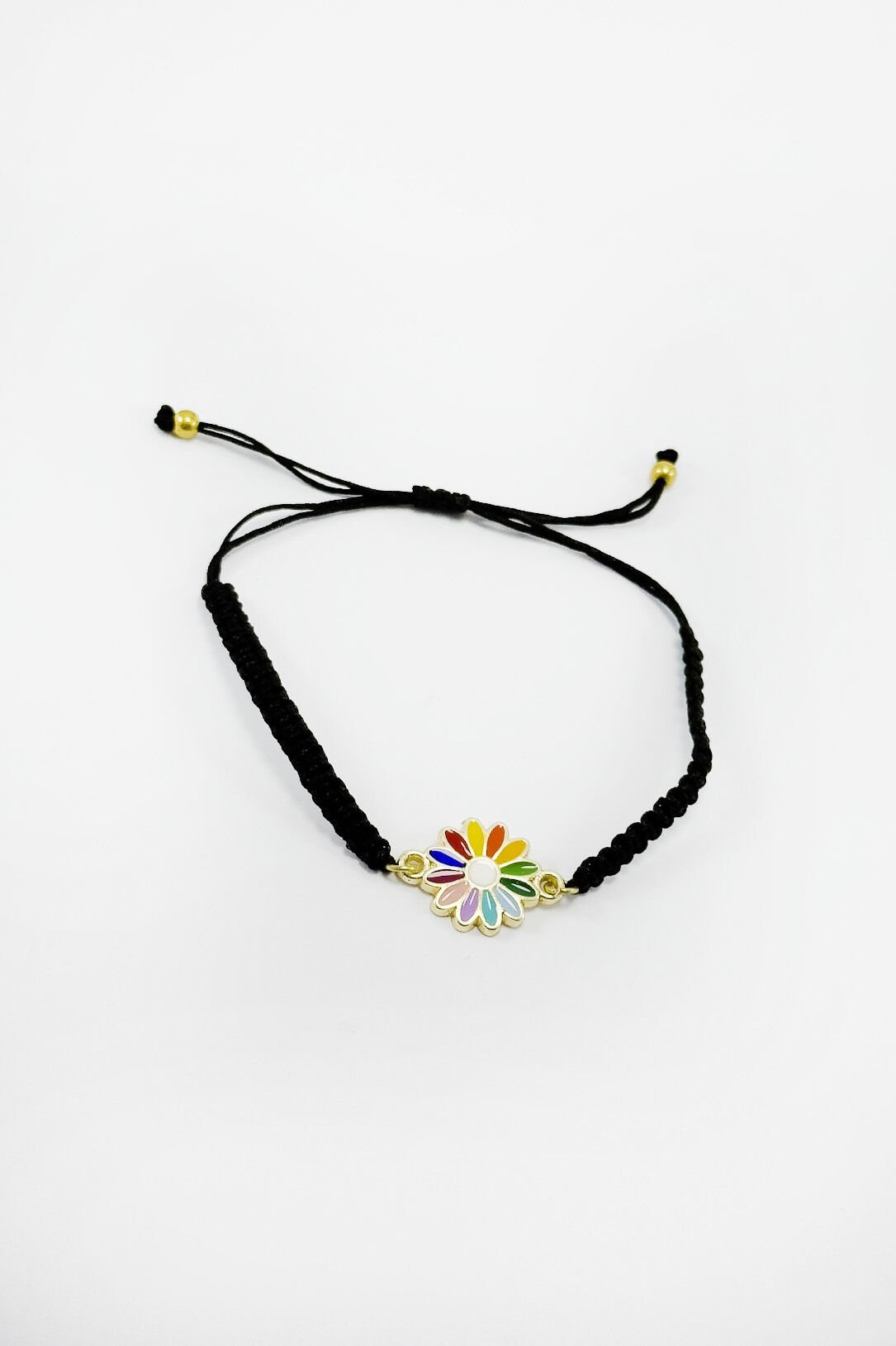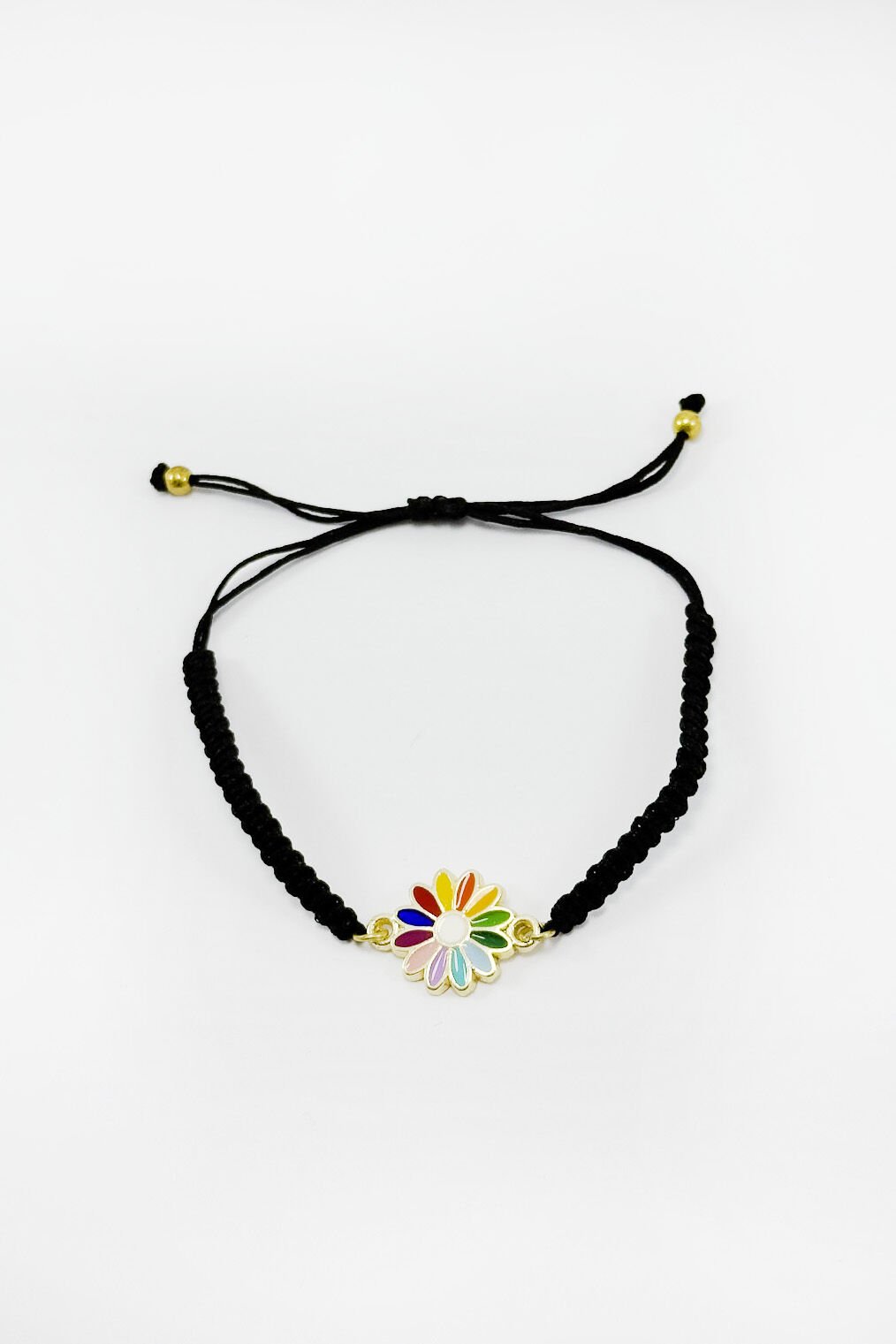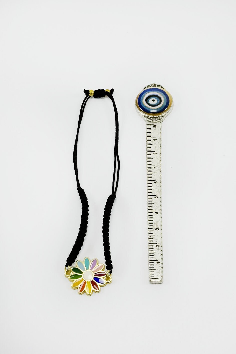 Renkli papatya detaylarıyla süslenmiş siyah ipli asansörlü ayarlanabilir bileklik, neşeli ve enerjik tasarımıyla dikkat çeker.