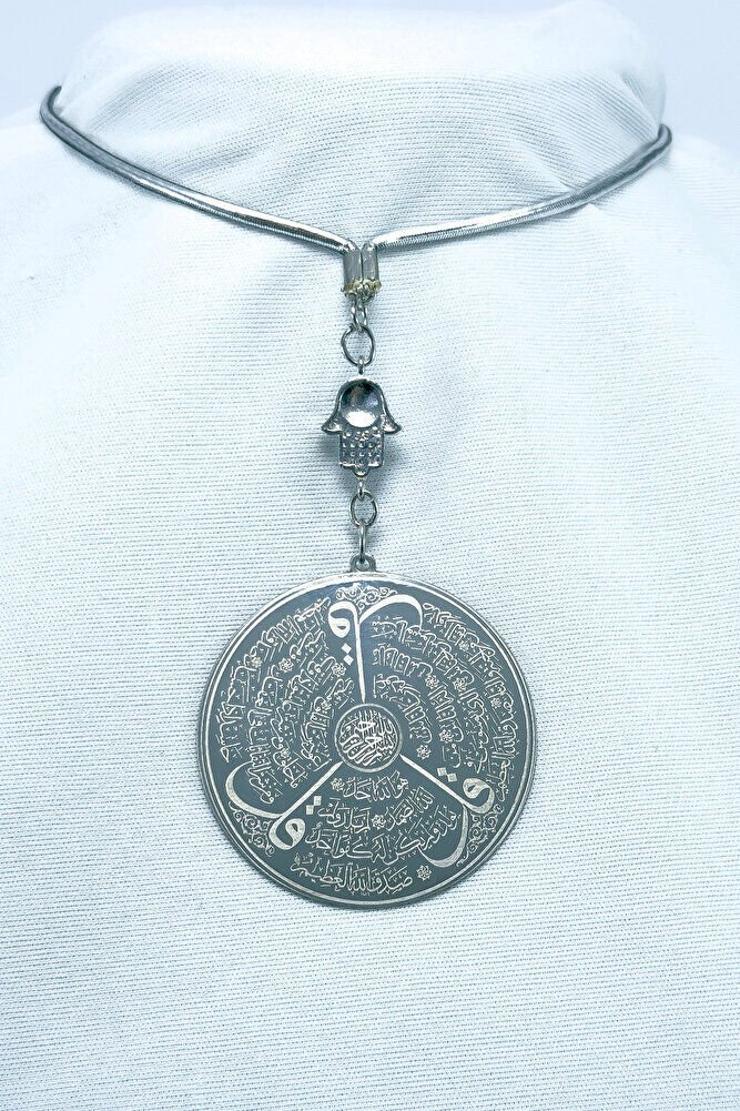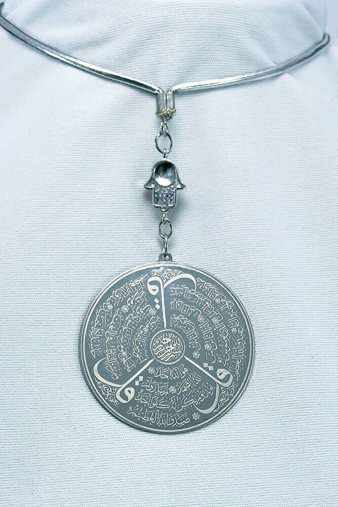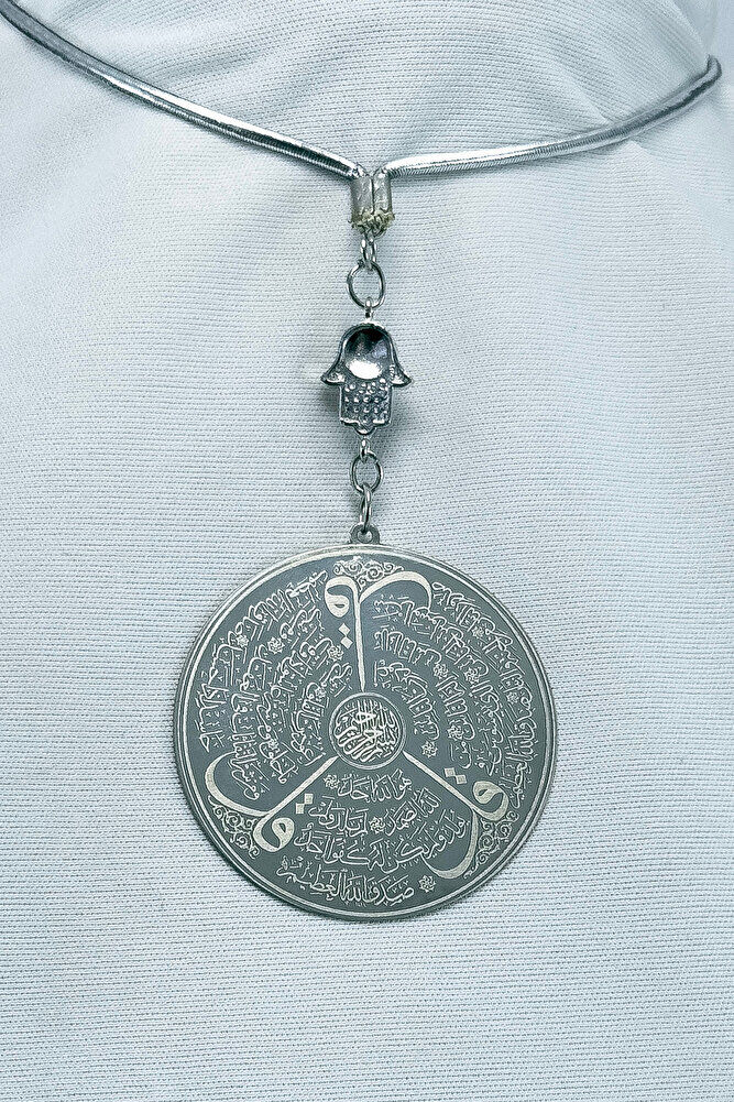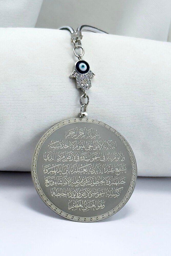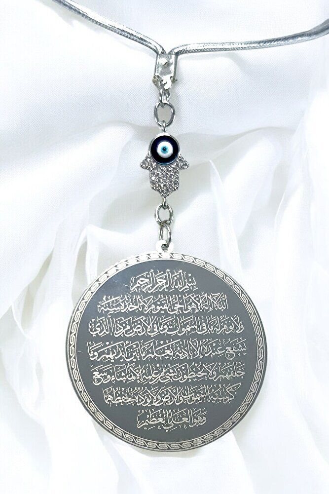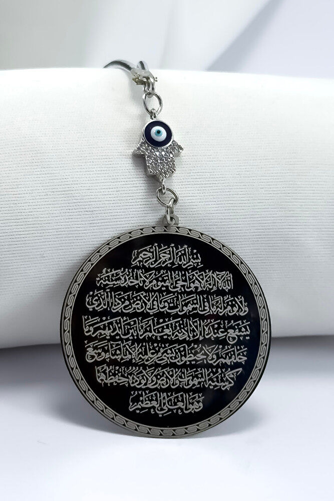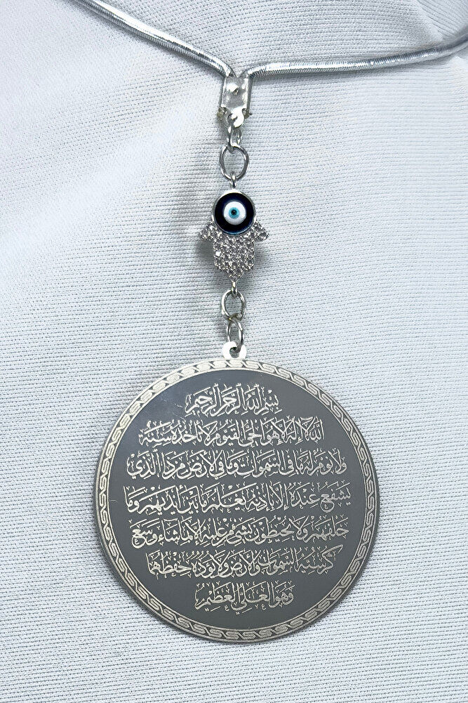 Prayers are permanently engraved with laser engraving technique.; The evil-eye hamsa hand with shiny stones is one-sided.; The Hamsa hand, also known as the Hand of Fatima, is known as a symbol of protection accepted in many cultures, especially in the Middle East and North Africa.; In Islamic tradition, this symbol, attributed to Hz. Fatima, the daughter of Hz. Muhammad, is believed to be used for protection against the evil eye, warding off bad energies and bringing peace.; The eye motif in the palm is associated with the idea that it serves as a kind of spiritual shield, especially against evil gazes.; It is also considered to carry meanings such as patience, abundance, compassion and strength.; This figure, considered by many as a symbol of spiritual security and peace, is frequently used in jewelry, home decorations and various accessories.; The product is handmade and slight differences and irregularities are possible because of handmade.; The rope is elastic.; Since it is elastic, it can be easily attached to any model.; The plate is silver colored stainless steel.; The steel plate measures 4.5 cm.; The plate is double-sided.; Green agate is a precious stone believed to balance energy, give courage and protect one from negative energies in many cultures and belief systems.; It is known and accepted for its calming effects, especially in the face of stress and tension.; Associated with the root chakra, this stone is thought to increase physical endurance, support determination and boost self-confidence.; It is also widely believed that it has been carried since ancient times as a protection against the evil eye and to strengthen one's spiritual strength.; Used both as an accessory and as a talisman, red agate has been a preferred stone for those seeking spiritual balance and confidence.; Ayetel Kürsi is depicted on one side and Felak Nas Ihlas on the other.; Ayetel Kürsi is considered one of the most powerful and protective prayers in Islamic belief.; Ayetel Kürsi is a verse that expresses the greatness and sovereignty of Allah and is frequently recited for protection and spiritual strength.; This verse emphasizes that everything in the heavens and the earth belongs to Allah and provides protection from satanic influences. It is believed that reciting it, especially before going to bed, is greatly beneficial in terms of security, protection from harmful energies, and spiritual peace. It also gives a person spiritual comfort and strength through the belief that Allah knows everything and that everything depends on Him. Surahs al-Falaq, an-Nas, and al-Ikhlas are important prayers recited in Islam for protection and spiritual strength. Surahs al-Falaq and an-Nas are read specifically for protection from evil eyes, the evil eye, and satanic influences. While Surah al-Falaq provides protection against dark forces, Surah an-Nas is believed to provide protection from negative thoughts and harmful energies. Surah al-Ikhlas expresses the oneness and unlimited power of Allah, and it is believed that this surah brings spiritual peace and protection to the person. These surahs are frequently recited for those seeking security and peace and are believed to be of great benefit to those seeking spiritual balance. In one of the images, black reflection was used to make the text fully readable.; The license plate is silver.;